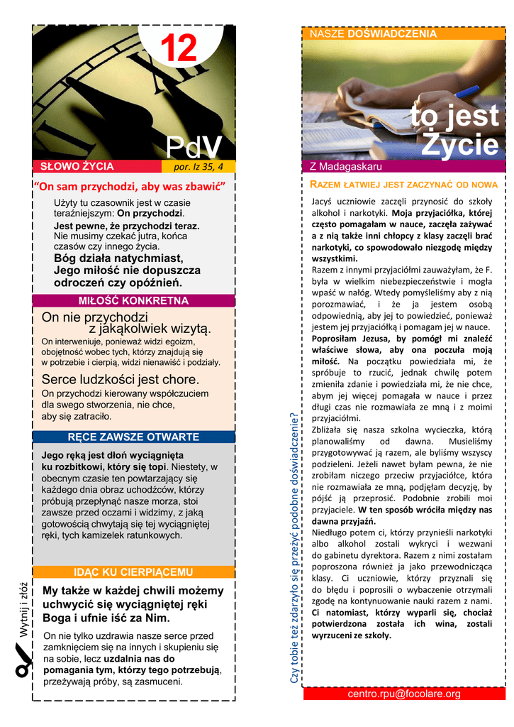 NASZE DOŚWIADCZENIA 12 SŁOWO ŻYCIA to jest Życie PdV por. Iz 35, 4 Z Madagaskaru RAZEM ŁATWIEJ JEST ZACZYNAĆ OD NOWA “On sam przychodzi, aby was zbawić” Użyty tu czasownik jest w czasie teraźniejszym: On przychodzi. Jest pewne, że przychodzi teraz. Nie musimy czekać jutra, końca czasów czy innego życia. Bóg działa natychmiast, Jego miłość nie dopuszcza odroczeń czy opóźnień. MIŁOŚĆ KONKRETNA On nie przychodzi z jakąkolwiek wizytą. On interweniuje, ponieważ widzi egoizm, obojętność wobec tych, którzy znajdują się w potrzebie i cierpią, widzi nienawiść i podziały. RĘCE ZAWSZE OTWARTE Jego ręką jest dłoń wyciągnięta ku rozbitkowi, który się topi. Niestety, w obecnym czasie ten powtarzający się każdego dnia obraz uchodźców, którzy próbują przepłynąć nasze morza, stoi zawsze przed oczami i widzimy, z jaką gotowością chwytają się tej wyciągniętej ręki, tych kamizelek ratunkowych. Wytnij i złóż IDĄC KU CIERPIĄCEMU My także w każdej chwili możemy uchwycić się wyciągniętej ręki Boga i ufnie iść za Nim. On nie tylko uzdrawia nasze serce przed zamknięciem się na innych i skupieniu się na sobie, lecz uzdalnia nas do pomagania tym, którzy tego potrzebują, przeżywają próby, są zasmuceni. Czy tobie też zdarzyło się przeżyć podobne doświadczenie? Serce ludzkości jest chore. On przychodzi kierowany współczuciem dla swego stworzenia, nie chce, aby się zatraciło. Jacyś uczniowie zaczęli przynosić do szkoły alkohol i narkotyki. Moja przyjaciółka, której często pomagałam w nauce, zaczęła zażywać a z nią także inni chłopcy z klasy zaczęli brać narkotyki, co spowodowało niezgodę między wszystkimi. Razem z innymi przyjaciółmi zauważyłam, że F. była w wielkim niebezpieczeństwie i mogła wpaść w nałóg. Wtedy pomyśleliśmy aby z nią porozmawiać, i że ja jestem osobą odpowiednią, aby jej to powiedzieć, ponieważ jestem jej przyjaciółką i pomagam jej w nauce. Poprosiłam Jezusa, by pomógł mi znaleźć właściwe słowa, aby ona poczuła moją miłość. Na początku powiedziała mi, że spróbuje to rzucić, jednak chwilę potem zmieniła zdanie i powiedziała mi, że nie chce, abym jej więcej pomagała w nauce i przez długi czas nie rozmawiała ze mną i z moimi przyjaciółmi. Zbliżała się nasza szkolna wycieczka, którą planowaliśmy od dawna. Musieliśmy przygotowywać ją razem, ale byliśmy wszyscy podzieleni. Jeżeli nawet byłam pewna, że nie zrobiłam niczego przeciw przyjaciółce, która nie rozmawiała ze mną, podjęłam decyzję, by pójść ją przeprosić. Podobnie zrobili moi przyjaciele. W ten sposób wróciła między nas dawna przyjaźń. Niedługo potem ci, którzy przynieśli narkotyki albo alkohol zostali wykryci i wezwani do gabinetu dyrektora. Razem z nimi zostałam poproszona również ja jako przewodnicząca klasy. Ci uczniowie, którzy przyznali się do błędu i poprosili o wybaczenie otrzymali zgodę na kontynuowanie nauki razem z nami. Ci natomiast, którzy wyparli się, chociaż potwierdzona została ich wina, zostali wyrzuceni ze szkoły. [email protected]