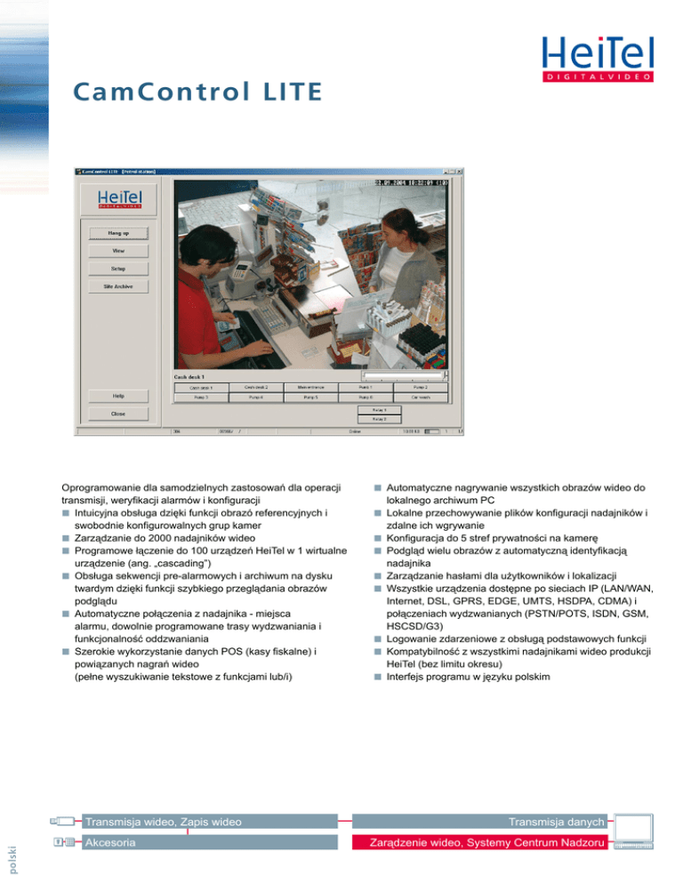 C a m C o n tro l L I TE Oprogramowanie dla samodzielnych zastosowań dla operacji transmisji, weryfikacji alarmów i konfiguracji Intuicyjna obsługa dzięki funkcji obrazó referencyjnych i swobodnie konfigurowalnych grup kamer Zarządzanie do 2000 nadajników wideo Programowe łączenie do 100 urządzeń HeiTel w 1 wirtualne urządzenie (ang. „cascading”) Obsługa sekwencji pre-alarmowych i archiwum na dysku twardym dzięki funkcji szybkiego przeglądania obrazów podglądu Automatyczne połączenia z nadajnika - miejsca alarmu, dowolnie programowane trasy wydzwaniania i funkcjonalność oddzwaniania Szerokie wykorzystanie danych POS (kasy fiskalne) i powiązanych nagrań wideo (pełne wyszukiwanie tekstowe z funkcjami lub/i) Transmisja wideo, Zapis wideo Akcesoria polski Transmisja wideo, Zapis wideo Akcesoria Automatyczne nagrywanie wszystkich obrazów wideo do lokalnego archiwum PC Lokalne przechowywanie plików konfiguracji nadajników i zdalne ich wgrywanie Konfiguracja do 5 stref prywatności na kamerę Podgląd wielu obrazów z automatyczną identyfikacją nadajnika Zarządzanie hasłami dla użytkowników i lokalizacji Wszystkie urządzenia dostępne po sieciach IP (LAN/WAN, Internet, DSL, GPRS, EDGE, UMTS, HSDPA, CDMA) i połączeniach wydzwanianych (PSTN/POTS, ISDN, GSM, HSCSD/G3) Logowanie zdarzeniowe z obsługą podstawowych funkcji Kompatybilność z wszystkimi nadajnikami wideo produkcji HeiTel (bez limitu okresu) Interfejs programu w języku polskim Transmisja danych Zarądzenie wideo, Systemy Centrum Nadzoru Transmisja danych Zarądzenie wideo, Systemy Centrum Nadzoru Tryb off-line: Indeks nadajników z obrazami referencyjnymi Tryb off-line: Przegląd archiwum PC za pomocą CamControl PLAYER Nagrywanie wg harmonogramu Pomoc on-line Dowolna alokacja przesteni HDD ETHERNET (TCP/IP DSL) ISDN PSTN/POTS GSM HSCSD UMTS/3G Dowolnie konfigurowane grupy kamer Dwa przekzniki do sterowania systemami zewnetrznymi (np bariery, óswietlenie) Sterowanie zdalne PTZ Suwak współzynnika jakości obrazu do prędkości transmisji svr Obsluga zdalnego archiwum CamDisc Procesor 1,7 GHz Pentium Pamięć 256 MB RAM System operacyjny Windows® XP, 2000, NT 4.0, ME, 9x Pojemność dysku twardego 20 MB dla programu CamControl LITE, Dodatkowa pojemność dysku twardego jest zależna od rozmiarów obrazów referencyjnych i pojemności archiwum PC Karta graficzna Rozdzielczość co najmniej 1024x768 przy 65536 kolorach Port szeregowy Zintegrowany port szeregowy (UART 16550) dla transmisji poprzez zewnętrzny modem (PSTN, ISDN) Transmisja danych Zewnętrzny modem ISDN TA i/lub wewnętrzna karta ISDN TA i/lub zewnętrzny modem PSTN i/lub zintegrowana karta ETHERNET Tsmisja audio (opcja) Karta dźwiękowa zgodna z Soundblaster® dla transmisji audio (wraz z mikrofonem i głośnikami) Napęd optyczny Czytnik CD-ROM Errors and omissions excepted, technical specification and availability are subject to change without notice HeiTel CamControl LITE 09/07 Wymagania systemowe Dowolna ruchu z fatwo definiowanymi strefami detekcji