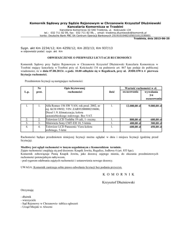 Komornik Sądowy przy Sądzie Rejonowym w Chrzanowie Krzysztof Dłużniewski Kancelaria Komornicza w Trzebini Kancelaria Komornicza 32-540 Trzebinia, ul. Kościuszki 134 tel.: 032 711 82 99, fax: 032 711 82 99, , email: [email protected] konto: Deutsche Bank PBC SA Centrum Operacji Bankowych 25191010482105021012330001 Trzebinia, dnia 2013-06-25 Sygn. akt Km 2234/12; Km 4259/12; Km 203/13; Km 937/13 w odpowiedzi podać: sygn. akt Km OBWIESZCZENIE O PIERWSZEJ LICYTACJI RUCHOMOŚCI Komornik Sądowy przy Sądzie Rejonowym w Chrzanowie Krzysztof Dłużniewski Kancelaria Komornicza w Trzebini mający kancelarię w Trzebini przy ul. Kościuszki 134 na podstawie art. 867 kpc podaje do publicznej wiadomości, że w dniu 07.08.2013r. o godz. 10.00 odbędzie się w Regulicach, przy ul. JODŁOWA 4 pierwsza licytacja ruchomości. Przedmiotem licytacji są następujące ruchomości: L.p. Nr prot. 1. 1. 2. 3. 4. 2. 3. 4. Opis licytowanej ruchomości Alfa Romeo 156 SW VAN; rok prod. 2002, nr rej. KCH 8W02; VIN: ZAR93200000218606; Diesel 1.9; klimatyzacja; koloru jasnoniebieskiego stalowego. Bez VAT. Telewizor LCD Toshiba 19 cali, 1- roczny. Miniwieża Sony CMT-EH 10, 5-letnia Telewizor LCD Panasonic Viera koloru srebrnego, 5-letni ilość Wartość ruchomości w zł. oszacowania wywołania 3/4 oszacowania 1. 12.000,00 zł 9.000,00 zł 1. 1. 1. 800,00 zł 400,00 zł 600,00 zł 600,00 zł 300,00 zł 450,00 zł Ruchomości będące przedmiotem niniejszej licytacji można oglądać w dniu i miejscu licytacji (godzinę przed licytacją). Możliwy jest ogląd ruchomości w innym uzgodnionym z Komornikiem terminie. Zajęte ruchomości znajdują się pod dozorem: Knapik Jowita, Regulice, Jodłowa 4 (art. 855 kpc). Komornik zobowiązuje Panią Knapik Jowita, jako dozorcę zajętego mienia, do okazania przedmiotowych ruchomości potencjalnym nabywcom, - pod rygorem odebrania zajętych ruchomości i ustanowienia nowego dozorcy. UWAGA: Komornik zastrzega sobie prawo odwołania licytacji bez podania przyczyn. K O M O R N I K Krzysztof Dłużniewski Otrzymują: - dłużnik - wierzyciele - Sąd Rejonowy w Chrzanowie- tablica ogłoszeń - Urząd Miejski w Alwerni - Urząd Skarbowy w Chrzanowie - Kancelaria Komornika - tablica ogłoszeń - a/a Pouczenie: Nabywca obowiązany jest zapłacić cenę nabycia natychmiast po udzieleniu mu przybicia. Gdy jednak cena przewyższa 500,-zł obowiązek nabywcy ogranicza się do złożenia natychmiast 1/5 ceny, nie mniej jednak niż 500,-zł,przy czym reszta powinna być uiszczona do godziny 12 dnia następnego. Nabywca, który w przepisanym terminie nie uiści ceny w całości lub części, traci prawa wynikające z przybicia. Jeżeli nabywca nie uiści w terminie sumy przypadającej do zapłaty natychmiast przy udzieleniu przybicia, komornik wznowi niezwłocznie przetarg tych samych ruchomości, rozpoczynając od ceny wywołania, przy czym opieszały nabywca nie może uczestniczyć w licytacji. W razie niezapłacenia w terinie reszty ceny płatnej dnia następnego po licytacji, będzie wyznaczona ponowna licytacja na warunkach pierwszej.