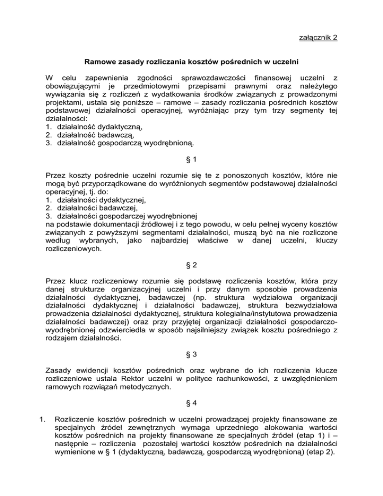 załącznik 2 Ramowe zasady rozliczania kosztów pośrednich w uczelni W celu zapewnienia zgodności sprawozdawczości finansowej uczelni z obowiązującymi je przedmiotowymi przepisami prawnymi oraz naleŜytego wywiązania się z rozliczeń z wydatkowania środków związanych z prowadzonymi projektami, ustala się poniŜsze – ramowe – zasady rozliczania pośrednich kosztów podstawowej działalności operacyjnej, wyróŜniając przy tym trzy segmenty tej działalności: 1. działalność dydaktyczną, 2. działalność badawczą, 3. działalność gospodarczą wyodrębnioną. §1 Przez koszty pośrednie uczelni rozumie się te z ponoszonych kosztów, które nie mogą być przyporządkowane do wyróŜnionych segmentów podstawowej działalności operacyjnej, tj. do: 1. działalności dydaktycznej, 2. działalności badawczej, 3. działalności gospodarczej wyodrębnionej na podstawie dokumentacji źródłowej i z tego powodu, w celu pełnej wyceny kosztów związanych z powyŜszymi segmentami działalności, muszą być na nie rozliczone według wybranych, jako najbardziej właściwe w danej uczelni, kluczy rozliczeniowych. §2 Przez klucz rozliczeniowy rozumie się podstawę rozliczenia kosztów, która przy danej strukturze organizacyjnej uczelni i przy danym sposobie prowadzenia działalności dydaktycznej, badawczej (np. struktura wydziałowa organizacji działalności dydaktycznej i działalności badawczej, struktura bezwydziałowa prowadzenia działalności dydaktycznej, struktura kolegialna/instytutowa prowadzenia działalności badawczej) oraz przy przyjętej organizacji działalności gospodarczowyodrębnionej odzwierciedla w sposób najsilniejszy związek kosztu pośredniego z rodzajem działalności. §3 Zasady ewidencji kosztów pośrednich oraz wybrane do ich rozliczenia klucze rozliczeniowe ustala Rektor uczelni w polityce rachunkowości, z uwzględnieniem ramowych rozwiązań metodycznych. §4 1. Rozliczenie kosztów pośrednich w uczelni prowadzącej projekty finansowane ze specjalnych źródeł zewnętrznych wymaga uprzedniego alokowania wartości kosztów pośrednich na projekty finansowane ze specjalnych źródeł (etap 1) i – następnie – rozliczenia pozostałej wartości kosztów pośrednich na działalności wymienione w § 1 (dydaktyczną, badawczą, gospodarczą wyodrębnioną) (etap 2). 2. Rozliczenie kosztów pośrednich w uczelni nieprowadzącej projektów finansowanych ze specjalnych źródeł zewnętrznych przebiega z pominięciem etapu 1. §5 1. 2. Etap 1, w uczelniach prowadzących ewidencję kosztów pośrednich w podziale na wydziałowe (kolegialne/instytutowe) koszty pośrednie oraz ogólnouczelniane koszty pośrednie, wymaga aby na projekty finansowane ze specjalnych źródeł zewnętrznych odrębnie były alokowane wydziałowe (kolegialne/instytutowe) koszty pośrednie oraz ogólnouczelniane koszty pośrednie. W tym celu naleŜy: 1. od wartości wydziałowych (kolegialnych/instytutowych) kosztów pośrednich poszczególnych wydziałów (kolegiów) odjąć wartość kosztów moŜliwą do przypisania do kosztów projektów finansowanych ze specjalnych źródeł zewnętrznych; w ten sposób zostanie ustalona pula wydziałowych (kolegialnych/instytutowych) kosztów pośrednich przypadająca na działalność dydaktyczną, badawczą i gospodarczą wyodrębnioną, 2. od wartości ogólnouczelnianych kosztów pośrednich odjąć wartość kosztów moŜliwą do przypisania do kosztów projektów finansowanych ze specjalnych źródeł zewnętrznych; w ten sposób zostanie ustalona pula ogólnouczelnianych kosztów pośrednich przypadająca na działalność dydaktyczną, badawczą i gospodarczą wyodrębnioną. W uczelniach prowadzących projekty finansowane ze specjalnych źródeł zewnętrznych, ale jednocześnie nieprowadzących ewidencji kosztów pośrednich w podziale na wydziałowe (kolegialne/instytutowe) koszty pośrednie oraz ogólnouczelniane koszty pośrednie, wartość kosztów pośrednich naleŜy alokować na projekty stosując rozwiązania przedstawione w punkcie 1 odpowiednio, tj. z uwzględnieniem faktu uproszczonej ewidencji. §6 1. Etap 1 – w zakresie alokowania wydziałowych (kolegialnych/instytutowych) kosztów pośrednich na projekty – wymaga: 1. ustalenia klucza rozliczeniowego 1, wyraŜonego procentową relacją wartości wszystkich wydziałowych (kolegialnych/instytutowych) kosztów pośrednich w stosunku do wartości wszystkich kosztów bezpośrednich (łącznie z kosztami bezpośrednimi projektów) poniesionych przez uczelnię w okresie rozliczeniowym (np. w ciągu roku), 2. ustalenia wartości wydziałowych (kolegialnych/instytutowych) kosztów pośrednich przypadających na poszczególne projekty finansowane ze specjalnych źródeł zewnętrznych, co następuje w drodze przemnoŜenia klucza rozliczeniowego 1 przez wartość kosztów bezpośrednich poszczególnych projektów finansowanych ze specjalnych źródeł, 3. dla tych projektów, przy rozliczeniu których uczelnię obowiązują – narzucone przez instytucję finansującą – ustalone wielkości kosztów pośrednich (np. narzut procentowy od zadanej z góry kategorii bazowej), doliczenia określonej z góry kwoty kosztów pośrednich. 2. Przypisanie wartości wydziałowych (kolegialnych/instytutowych) kosztów pośrednich do poszczególnych projektów wymaga jednoczesnego pomniejszenia wydziałowych (kolegialnych/instytutowych) kosztów pośrednich o wartości alokowane na poszczególne projekty, co doprowadza do ustalenia indywidualnych (tj. dla poszczególnych wydziałów (kolegiów/instytutów)) puli wydziałowych (kolegialnych/instytutowych) kosztów pośrednich przypadających na działalność dydaktyczną, badawczą i gospodarczą wyodrębnioną. Dalsze rozliczenie tych puli kosztów następuje stosownie do zasad przedstawionych jako etap 2. 3. Przy ustalaniu indywidualnych puli wydziałowych (kolegialnych/instytutowych) kosztów pośrednich naleŜy mieć
