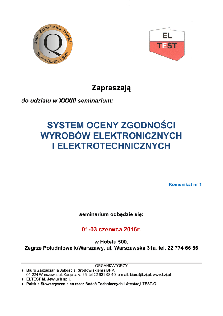 Zapraszają do udziału w XXXIII seminarium: SYSTEM OCENY ZGODNOŚCI WYROBÓW ELEKTRONICZNYCH I ELEKTROTECHNICZNYCH Komunikat nr 1 seminarium odbędzie się: 01-03 czerwca 2016r. w Hotelu 500, Zegrze Południowe k/Warszawy, ul. Warszawska 31a, tel. 22 774 66 66 ORGANIZATORZY ♦ Biuro Zarządzania Jakością, Środowiskiem i BHP, 01-224 Warszawa, ul. Kasprzaka 25, tel 22 631 08 40, e-mail: [email protected], www.bzj.pl ♦ ELTEST M. Jewtuch sp.j. ♦ Polskie Stowarzyszenie na rzecz Badań Technicznych i Atestacji TEST-Q PROGRAM XXXII SEMINARIUM SYSTEM OCENY ZGODNOŚCI WYROBÓW ELEKTRONICZNYCH I ELEKTROTECHNICZNYCH Nadzór merytoryczny i współpraca: dr inż. Marek Jewtuch – ELTEST Współpraca: mgr Andrzej Kiszczak – Biuro Zarządzania Jakością, Środowiskiem i BHP Miejsce: Hotel 500, Zegrze k/Warszawy Tematyka szkolenia 1. Ustawa o ocenie zgodności 2. Rapex 3. Dyrektywy RED (RTTE) 4. Znowelizowana dyrektywa- LVD 5. Znowelizowana dyrektywa - EMC 6. Badanie wyrobów medycznych – przykłady 7. Bieżąca problematyka badań i ocen zgodności wyrobów elektronicznych i elektrotechnicznych 8. Badania elektroniki samochodowej 9. Dyrektywa ROHS – badania zawartości substancji zabronionych - doświadczenie 10. Działania organu nadzoru rynku w obszarze dyrektywy LVD 11. Certyfikacja wyrobów na rynki Unii Celnej (Rosja, Białoruś, Kazachstan) 12. 5-cio minutowe wystąpienie uczestników seminarium (producentów i importerów) w zakresie funkcjonowania systemu oceny zgodności. Szczegółowy program zostanie dosłany w najbliższym czasie Koszt uczestnictwa przy pełnym udziale obejmuje: - zakwaterowanie ( dwa noclegi) i wyżywienie (od kolacji w środę do obiadu w piątek w pokoju 2 osobowym) - udział w obradach, - materiały konferencyjne, - stosowne zaświadczenia, - przerwy kawowe, - udział w imprezie plenerowej - koszty organizacyjne. Koszt uczestnictwa tylko w obradach obejmuje: - udział w obradach, - materiały konferencyjne, - przerwy kawowe, - dwa obiady, - stosowne zaświadczenia, - koszty organizacyjne. TABELA OPŁAT (ceny netto) 610,- + VAT Udział tylko w obradach Pełen udział (obrady + zakwaterowanie wyżywienie + uroczysta kolacja plenerowa) + 940,- + VAT Zniżka dla klientów ELTEST-u w latach 2015/2016 - 10% (zniżka nie obejmuje dopłaty do pokoju 1 osobowego) W przypadku opłacania udziału w seminarium ze środków budżetowych istnieje możliwość wystawienia faktury bez podatku VAT. W tym przypadku należy podpisać oraz przesłać razem z kartą zgłoszenia oświadczenie o finansowaniu szkolenia ze środków budżetowych, które znajduje się na naszej stronie www.bzj.pl Informacji udzielają i zgłoszenia przyjmują: Biuro Zarządzania Jakością, Środowiskiem i BHP ul. Kasprzaka 25 01-224 Warszawa tel.: 22 631 08 40; 631 08 50 fax: 22 632 28 20 e-mail: [email protected] www.bzj.pl ELTEST Centrum Oceny, Badań i Rozwoju Sprzętu Elektronicznego i Elektrotechnicznego ul. Ratuszowa 11 03-450 Warszawa tel.: 22 619 39 66 www.eltest.com.pl Pieczęć firmowa KARTA UCZESTNICTWA w seminarium SYSTEM OCENY ZGODNOŚCI WYROBÓW ELEKTRONICZNYCH I ELEKTROTECHNICZNYCH Zegrze, 01-03 czerwca 2016 1. Udział tylko w obradach 610,00- zł + obowiązujący VAT Nazwa firmy, adres: Imię i nazwisko: Telefon : Fax : E-mail : 2. Pełny udział (obrady 940,00,- zł + obowiązujący VAT + zakwaterowanie + wyżywienie + kolacja grillowa) Nazwa firmy, adres: Imię i nazwisko: Telefon : Fax : E-mail : Zniżka dla klientów ELTEST-u w latach 2014/2015 - 10% Dodatkowo rezerwuję miejsce w pokoju 1 osobowym; dopłata 160,00 zł + obowiązujący VAT (zniżka nie dotyczy) TAK NIE * Zobowiązujemy się do pokrycia kosztów udziału w kwocie ……………………………… po otrzymaniu faktury Nasz NIP : ……………………………………………. Podpis uczestnika W przypadku rezygnacji z udziału w seminarium po 09 listopada 2015r. będziemy zmuszeni obciążyć Państwa kosztami rezerwacji w wysokości 50% Kartę uczestnictwa proszę przesłać faxem do Organizatora pod numer 22 632 28 20 lub e-mailem: [email protected] * właściwe zakreślić (ilość miejsc ograniczona)