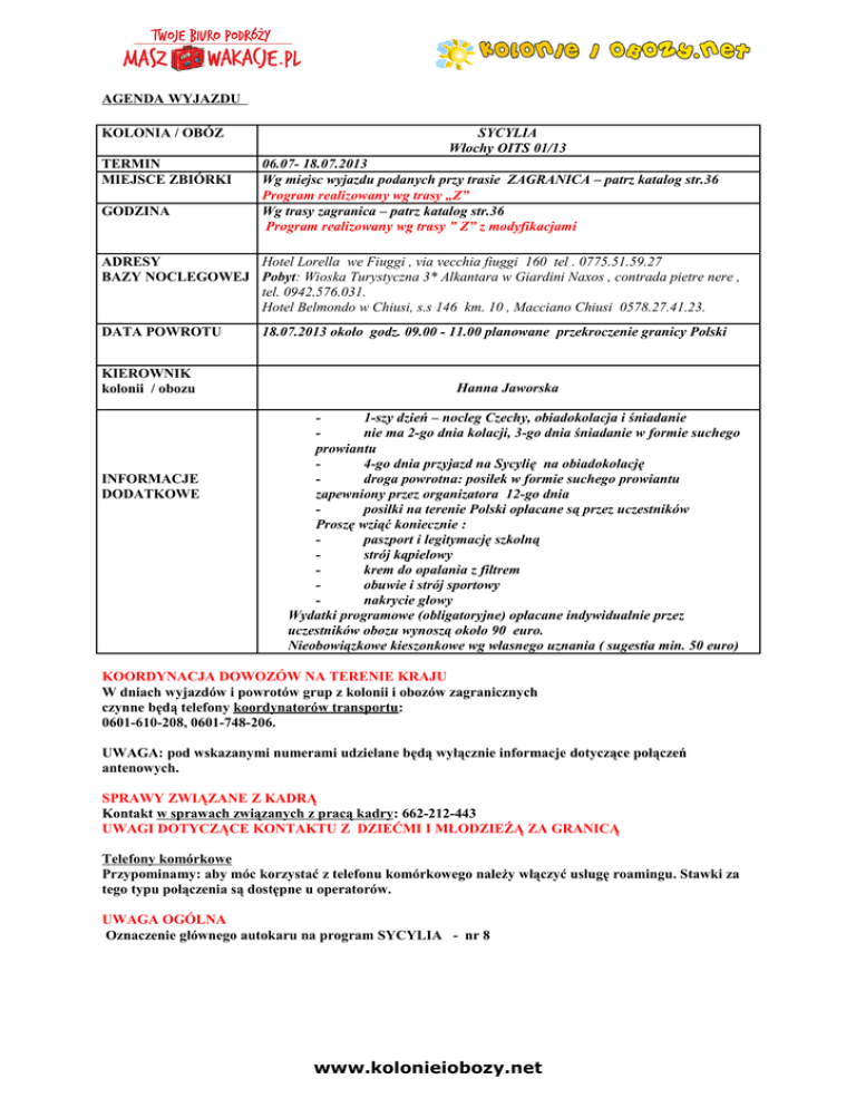 AGENDA WYJAZDU KOLONIA / OBÓZ TERMIN MIEJSCE ZBIÓRKI GODZINA SYCYLIA Włochy OITS 01/13 06.07- 18.07.2013 Wg miejsc wyjazdu podanych przy trasie ZAGRANICA – patrz katalog str.36 Program realizowany wg trasy „Z” Wg trasy zagranica – patrz katalog str.36 Program realizowany wg trasy ” Z” z modyfikacjami ADRESY Hotel Lorella we Fiuggi , via vecchia fiuggi 160 tel . 0775.51.59.27 BAZY NOCLEGOWEJ Pobyt: Wioska Turystyczna 3* Alkantara w Giardini Naxos , contrada pietre nere , tel. 0942.576.031. Hotel Belmondo w Chiusi, s.s 146 km. 10 , Macciano Chiusi 0578.27.41.23. DATA POWROTU KIEROWNIK kolonii / obozu INFORMACJE DODATKOWE 18.07.2013 około godz. 09.00 - 11.00 planowane przekroczenie granicy Polski Hanna Jaworska 1-szy dzień – nocleg Czechy, obiadokolacja i śniadanie nie ma 2-go dnia kolacji, 3-go dnia śniadanie w formie suchego prowiantu 4-go dnia przyjazd na Sycylię na obiadokolację droga powrotna: posiłek w formie suchego prowiantu zapewniony przez organizatora 12-go dnia posiłki na terenie Polski opłacane są przez uczestników Proszę wziąć koniecznie : paszport i legitymację szkolną strój kąpielowy krem do opalania z filtrem obuwie i strój sportowy nakrycie głowy Wydatki programowe (obligatoryjne) opłacane indywidualnie przez uczestników obozu wynoszą około 90 euro. Nieobowiązkowe kieszonkowe wg własnego uznania ( sugestia min. 50 euro) KOORDYNACJA DOWOZÓW NA TERENIE KRAJU W dniach wyjazdów i powrotów grup z kolonii i obozów zagranicznych czynne będą telefony koordynatorów transportu: 0601-610-208, 0601-748-206. UWAGA: pod wskazanymi numerami udzielane będą wyłącznie informacje dotyczące połączeń antenowych. SPRAWY ZWIĄZANE Z KADRĄ Kontakt w sprawach związanych z pracą kadry: 662-212-443 UWAGI DOTYCZĄCE KONTAKTU Z DZIEĆMI I MŁODZIEŻĄ ZA GRANICĄ Telefony komórkowe Przypominamy: aby móc korzystać z telefonu komórkowego należy włączyć usługę roamingu. Stawki za tego typu połączenia są dostępne u operatorów. UWAGA OGÓLNA Oznaczenie głównego autokaru na program SYCYLIA - nr 8 www.kolonieiobozy.net ODJAZDY Z POSZCZEGÓLNYCH MIAST W POLSCE Gdańsk Koszalin Kraków Lubin Olsztyn Poznań Tarnów ul.Rajska 6 - dojście do budynku NOT Parking przed PKO i BGŻ naprzeciwko Dworca PKP Parking przy PTTK, ul. M. Kopernika Stacja Paliw, parking przy McDonald's, ul. Piłsudzkiego Dworzec Autobusowy, stanowisko 11 Dworzec Letni, ul. Dworcowa ul. Kościuszki, parking przed motelem Tarnovia UWAGA: Prosimy o przybycie na miejsce zbiórki 15 minut przed planowaną godziną odjazdu. Jakiekolwiek zmiany miejsc wsiadania bez zgody organizatora są niedopuszczalne. www.kolonieiobozy.net 00:50 02:20 06:00 09:00 00:10 07:00 04:00