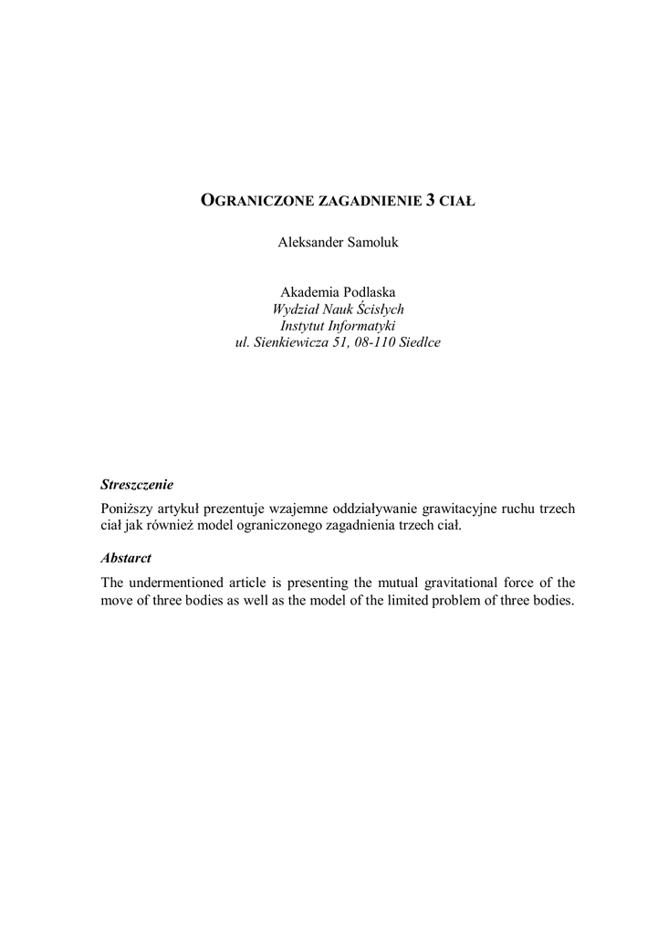 OGRANICZONE ZAGADNIENIE 3 CIAŁ Aleksander Samoluk Akademia Podlaska Wydział Nauk Ścisłych Instytut Informatyki ul. Sienkiewicza 51, 08-110 Siedlce Streszczenie Poniższy artykuł prezentuje wzajemne oddziaływanie grawitacyjne ruchu trzech ciał jak również model ograniczonego zagadnienia trzech ciał. Abstarct The undermentioned article is presenting the mutual gravitational force of the move of three bodies as well as the model of the limited problem of three bodies. 1. Wstęp Zagadnienie n ciał było i jest przedmiotem badań wielu uczonych. I o ile obliczenie ruchu dwóch ciał, wzajemnie oddziaływujących grawitacyjnie, jest stosunkowo prostym zadaniem, to już przez ponad trzysta lat nie zdołano znaleźć ogólnego rozwiązania ruchu trzech ciał. Ścisłe rozwiązanie tego zadania otrzymano tylko w niektórych szczególnych wypadkach (ciała poruszają się w jednej płaszczyźnie i masę jednego z nich można pominąć w porównaniu z masami pozostałych dwóch – ograniczone zagadnienie trzech ciał) [1]. Duży wkład do badania ograniczonego zagadnienia trzech wniósł L. Euler. W 1760 roku znalazł rozwiązanie dynamicznego układu opisującego ruch ciała w polu grawitacji utworzonym przez dwie nieruchome masy. Oczywiście, układ ten jest bardzo uproszczonym przypadkiem ograniczonego zagadnienia trzech ciał, ale jego rozwiązanie znalazło również swoje zastosowanie [2]. L. Euler w 1767 roku znalazł również trzy rozwiązania L1 , L2 , L3 w ograniczonym zagadnieniu trzech ciał dla ciał położonych wzdłuż jednej prostej. Jego osiągnięciem było także wprowadzenie obracającego się układu współrzędnych, co pozwoliło później na znalezienie całki Jacobiego [2]. Pięć lat później, w 1772 roku, J. Lagrange pokazał, że istnieją jeszcze, w ograniczonym zagadnieniu trzech ciał, dwa rozwiązania L4 , L5 dla ciał znajdujących się początkowo w wierzchołkach trójkąta równobocznego [3]. Pierwsze wyniki badań stabilności punktów równowagi w ograniczonym zagadnieniu trzech ciał pojawiają się w 1843 roku, w pracy G. Gascheau. W 1875 roku E. J. Routh rozwiązał, w liniowym przybliżeniu, zadanie o stabilności trójkątnych położeń równowagi (przy pewnych warunkach początkowych). Natomiast w 1889 roku A. M. Lapunow rozwiązał ten sam problem w przypadku trójwymiarowym [4]. Dopiero w 1962 roku A. M. Leontowicz zbadał stabilność w sensie Lapunowa położeń równowagi L4 , L5 w przedziale liniowej stabilności z wyjątkiem zbioru miary zero. W 1967 roku A. Deprit wykazał, że zbiór ten składa się z trzech elementów. Rozwiązanie problemu dla tych trzech wartości parametru m można znaleźć w pracach A. Sokolskiego i A. Markiejewa [4]. Ostatnio A. Chenciner i R. Montgomery znaleźli nieznane wcześniej początkowe konfiguracje wielu ciał, prowadzące do idealnie okresowego ruchu. Najprostsza z tych konfiguracji to trzy planety o równych masach, krążące po krzywej płaskiej w kształcie ósemki i mijające nieruchomego obserwatora w równych odstępach czasu, co jedną trzecią okresu obiegu całej ósemkowej orbity. Istnienie takiej orbity w kształcie ósemki sugerowały wcześniejsze, przeprowadzone w 1993 roku, komputerowe eksperymenty [2]. To w pracach E. Grebienikowa i B. Elmabsouta wykazano istnienie nowych modeli kosmicznej dynamiki nazwanych przez autorów ograniczonymi zagadnieniami n (n > 3) ciał [5]. 190 2. Ograniczone zagadnienie trzech ciał Rozpatrzmy ruch trzech punktów materialnych S, J i P z masami m1 , m2 i m3 , odbywający się pod wpływem działania siły grawitacji. Załóżmy, że m1 i m2 ( m1 ³ m2 ) są to masy skończone, a masa m3 jest bardzo mała w porównaniu z m1 i m2. Wpływ ciała P na ruch ciał S i J można, zatem pominąć. Model taki nazywamy ograniczonym zagadnieniem trzech ciał [7]. Niech: r – odległość pomiędzy ciałami S i J, p i e – parametr i mimośród ich keplerowskiej orbity, v – rzeczywista anomalia, c – stała całki płaszczyzn, f – stała grawitacyjna. Wtedy zachodzą następujące związki [4]: r= p , c 2 = f ( m1 + m2 ) p, 1 + e cos v dv c = . dt r 2 (1.1) W zależności od wielkości mimośrodu można rozróżnić następujące warianty zagadnienia trzech ciał [4]: · · · · · hiperboliczne - kiedy orbita ciała J jest hiperbolą (e > 1); eliptyczne - kiedy orbita ciała J jest elipsą (0 < e < 1); kołowe - kiedy orbita ciała J jest okręgiem (e = 0); paraboliczne - kiedy orbita ciała J jest parabolą (e = 1); prostoliniowe - kiedy ciało J porusza się po prostej, przechodzącej przez ciało S. Jeżeli ciało P w każdym momencie ruchu znajduje się w płaszczyźnie ruchu ciał S i J, to mówimy, że jest to ograniczone zagadnienie „płaskie”. Natomiast, jeśli ciało P podczas ruchu wychodzi spoza płaszczyzny orbity ciał S i J to wówczas mówi się o „przestrzennym” ograniczonym zagadnieniu trzech ciał [4]. Wyprowadzimy teraz równania różniczkowe, opisujące ruch ciała P w ograniczonym zagadnieniu trzech ciał. Weźmy pod uwagę ruchomy kartezjański układ współrzędnych 0xyz, który obraca się wraz z masami m1 i m2 (oś 0x przechodzi przez punkty S i J) z początkiem w centrum mas m1 i m2 . Współrzędne punktu P są w tym układzie oznaczone przez x, y, z (rys. 1). 191 Rysunek 1 Energię kinetyczną T i potencjalną U ciała P wyliczamy ze wzorów [4]: T= 1 é 2 2 m3 ( x¢ - v¢y ) + ( y ¢ - v¢x ) + z ¢2 ù , ë û 2 æm m ö U = fm3 ç 1 + 2 ÷ , r2 ø è r1 (1.2) (1.3) gdzie - odpowiednio odległości ciała P od ciał S i J: 2 æ ö m2 r1 = ç x + r ÷ + y2 + z2 , m1 + m2 ø è 2 æ ö m1 r2 = ç x r ÷ + y2 + z2 . m1 + m2 ø è (1.4) Korzystając z funkcji Lagrange’a L = T + U, (1.5) można zapisać równania różniczkowe ruchu ciała P w postaci [4]: ¶W , ¶x ¶W y ¢¢ + 2v¢x¢ + v¢¢x - v¢2 y = , ¶y ¶W z ¢¢ = . ¶z x¢¢ - 2v¢y ¢ - v¢¢y - v¢2 x = (1.6) 192 U gdzie W = m . 3 Dokonamy teraz zamia