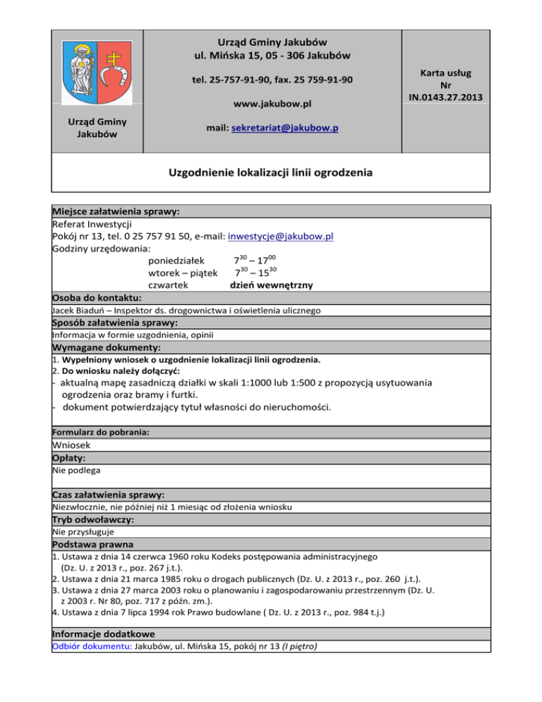 Urząd Gminy Jakubów ul. Mińska 15, 05 - 306 Jakubów tel. 25-757-91-90, fax. 25 759-91-90 www.jakubow.pl Urząd Gminy Jakubów Karta usług Nr IN.0143.27.2013 mail: [email protected] Uzgodnienie lokalizacji linii ogrodzenia Miejsce załatwienia sprawy: Referat Inwestycji Pokój nr 13, tel. 0 25 757 91 50, e-mail: [email protected] Godziny urzędowania: poniedziałek 730 – 1700 wtorek – piątek 730 – 1530 czwartek dzień wewnętrzny Osoba do kontaktu: Jacek Biaduń – Inspektor ds. drogownictwa i oświetlenia ulicznego Sposób załatwienia sprawy: Informacja w formie uzgodnienia, opinii Wymagane dokumenty: 1. Wypełniony wniosek o uzgodnienie lokalizacji linii ogrodzenia. 2. Do wniosku należy dołączyć: - aktualną mapę zasadniczą działki w skali 1:1000 lub 1:500 z propozycją usytuowania ogrodzenia oraz bramy i furtki. - dokument potwierdzający tytuł własności do nieruchomości. Formularz do pobrania: Wniosek Opłaty: Nie podlega Czas załatwienia sprawy: Niezwłocznie, nie później niż 1 miesiąc od złożenia wniosku Tryb odwoławczy: Nie przysługuje Podstawa prawna 1. Ustawa z dnia 14 czerwca 1960 roku Kodeks postępowania administracyjnego (Dz. U. z 2013 r., poz. 267 j.t.). 2. Ustawa z dnia 21 marca 1985 roku o drogach publicznych (Dz. U. z 2013 r., poz. 260 j.t.). 3. Ustawa z dnia 27 marca 2003 roku o planowaniu i zagospodarowaniu przestrzennym (Dz. U. z 2003 r. Nr 80, poz. 717 z późn. zm.). 4. Ustawa z dnia 7 lipca 1994 rok Prawo budowlane ( Dz. U. z 2013 r., poz. 984 t.j.) Informacje dodatkowe Odbiór dokumentu: Jakubów, ul. Mińska 15, pokój nr 13 (I piętro) Uwagi: 1. Wniosek o uzgodnienie lokalizacji linii ogrodzenia na działce należy złożyć przed zgłoszeniem właściwemu organowi budowy obiektów budowlanych niewymagających pozwolenia na budowę. 2. Uzgodnienie na lokalizację linii ogrodzenia wydaje się na czas nieokreślony. 3. Uzgodnienie na lokalizację linii ogrodzenia wygasa, jeżeli w ciągu 3 lat od jego wydania ogrodzenie nie zostało wybudowane. 4. W uzgodnieniu określa się miejsce lokalizacji ogrodzenia w oparciu o zapisy miejscowego planu zagospodarowania gminy oraz istniejącą infrastrukturę terenową (przewody instalacji wodociągowych, telekomunikacyjnych, elektroenergetycznych, gazowych, kanalizacyjnych itd.). 5. Po uzyskaniu uzgodnienia na lokalizację linii ogrodzenia, należy złożyć właściwemu organowi zgłoszenie budowy obiektów budowlanych niewymagających pozwolenia na budowę (Starostwo Powiatowe w Mińsku Mazowieckim - Wydział Architektury i Budownictwa, ul. Konstytucji 3-go Maja 16) wraz z przedmiotowym uzgodnieniem lokalizacji linii ogrodzenia. Sporządził: Jacek Biaduń Sprawdził: Kierownik Referatu Marzena Rek Zatwierdził: Wójt Hanna Wocial Jakubów, dnia ………………………r …………………………………….. (Imię i nazwisko wnioskodawcy) …………………………………….. …………………………………...... (Adres) ……………………………………... (nr telefonu) Wójt Gminy ul. Mińska 05-306 Jakubów Wniosek O uzgodnienie lokalizacji linii ogrodzenia Proszę o uzgodnienie lokalizacji linii ogrodzenia na działce położonej w miejscowości ………………………….… Nr działki ……………………………….wzdłuż drogi gminnej Nr ewidencyjny ……………………………………………………………………. Ogrodzenie zbudowane będzie …………………………………………………………………….. ……………………………………………………………………………………………………………………. ……………………………………………………………………………………………………………………. …………………………………………………………………………………..................................................... /Podpis/ ……………………………. Do wniosku należy dołączyć aktualną mapę zasadniczą działki w skali 1:1000 lub 1:500 z propozycją usytuowania ogrodzenia oraz bramy i furtki.