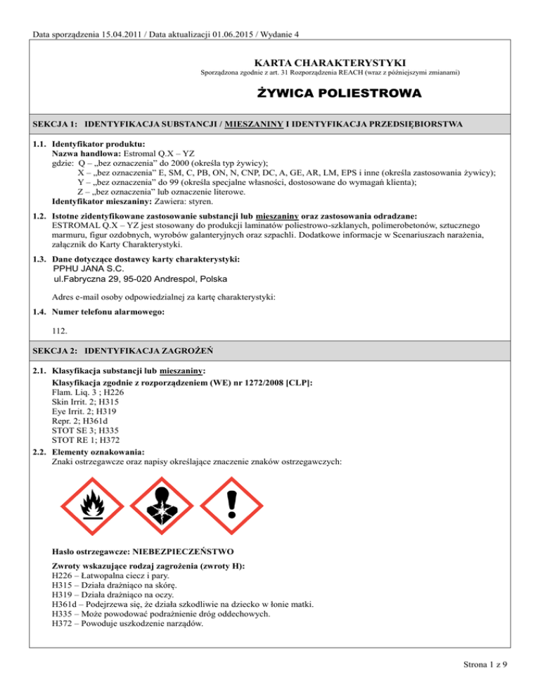Data sporządzenia 15.04.2011 / Data aktualizacji 01.06.2015 / Wydanie 4 KARTA CHARAKTERYSTYKI Sporządzona zgodnie z art. 31 Rozporządzenia REACH (wraz z późniejszymi zmianami) ŻYWICA POLIESTROWA SEKCJA 1: IDENTYFIKACJA SUBSTANCJI / MIESZANINY I IDENTYFIKACJA PRZEDSIĘBIORSTWA 1.1. Identyfikator produktu: Nazwa handlowa: Estromal Q.X – YZ gdzie: Q – „bez oznaczenia” do 2000 (określa typ żywicy); X – „bez oznaczenia” E, SM, C, PB, ON, N, CNP, DC, A, GE, AR, LM, EPS i inne (określa zastosowania żywicy); Y – „bez oznaczenia” do 99 (określa specjalne własności, dostosowane do wymagań klienta); Z – „bez oznaczenia” lub oznaczenie literowe. Identyfikator mieszaniny: Zawiera: styren. 1.2. Istotne zidentyfikowane zastosowanie substancji lub mieszaniny oraz zastosowania odradzane: ESTROMAL Q.X – YZ jest stosowany do produkcji laminatów poliestrowo-szklanych, polimerobetonów, sztucznego marmuru, figur ozdobnych, wyrobów galanteryjnych oraz szpachli. Dodatkowe informacje w Scenariuszach narażenia, załącznik do Karty Charakterystyki. 1.3. Dane dotyczące dostawcy karty charakterystyki: PPHU JANA S.C. ul.Fabryczna 29, 95-020 Andrespol, Polska Adres e-mail osoby odpowiedzialnej za kartę charakterystyki: 1.4. Numer telefonu alarmowego: 112. SEKCJA 2: IDENTYFIKACJA ZAGROŻEŃ 2.1. Klasyfikacja substancji lub mieszaniny: Klasyfikacja zgodnie z rozporządzeniem (WE) nr 1272/2008 [CLP]: Flam. Liq. 3 ; H226 Skin Irrit. 2; H315 Eye Irrit. 2; H319 Repr. 2; H361d STOT SE 3; H335 STOT RE 1; H372 2.2. Elementy oznakowania: Znaki ostrzegawcze oraz napisy określające znaczenie znaków ostrzegawczych: Hasło ostrzegawcze: NIEBEZPIECZEŃSTWO Zwroty wskazujące rodzaj zagrożenia (zwroty H): H226 – Łatwopalna ciecz i pary. H315 – Działa drażniąco na skórę. H319 – Działa drażniąco na oczy. H361d – Podejrzewa się, że działa szkodliwie na dziecko w łonie matki. H335 – Może powodować podrażnienie dróg oddechowych. H372 – Powoduje uszkodzenie narządów. Strona 1 z 9 Karta Charakterystyki ZYWICA POLIESTROWA Wydanie 4 Zwroty określające warunki bezpiecznego stosowania (zwroty P): P271 – Stosować wyłącznie na zewnątrz lub w dobrze wentylowanym pomieszczeniu. P280 – Stosować rękawice ochronne / odzież ochronną / ochronę oczu / ochronę twarzy. P284 – Stosować indywidualne środki ochrony dróg oddechowych. P309+P310 – W PRZYPADKU narażenia lub złego samopoczucia: Natychmiast skontaktować się z OŚRODKIEM ZATRUĆ lub lekarzem. P405 – Przechowywać pod zamknięciem. 2.3. Inne zagrożenia: Produkt nie spełnia kryteriów PBT lub vPvB zgodnie z załącznikiem XIII. SEKCJA 3: SKŁAD / INFORMACJA O SKŁADNIKACH 3.1. Substancje: Nie dotyczy. Produkt jest mieszaniną. 3.2. Mieszaniny: Składniki mieszaniny stwarzające zagrożenia i ich stężenia: Nazwa składnika / Numer Rejestracji Stężenie % (m/m) Numer CAS Numer WE Styren / 01-2119457861-32-XXXX 30 – 45 100-42-5 202-851-5 Klasyfikacja zg. z rozporządz. (WE) Nr. 1272/2008 Flam. Liq. 3; H226 Acute Tox. 4; H332 Repr. 2; H361d Asp. Tox. 1; H304 STOT SE 3; H335 STOT RE 1; H372 Eye Irrit. 2; H319 Skin Irrit. 2; H315 W sekcji 16 podano pełny tekst zwrotów H. SEKCJA 4: ŚRODKI PIERWSZEJ POMOCY 4.1. Opis środków pierwszej pomocy: Po narażeniu przez drogi oddechowe: Wyprowadzić z miejsca narażenia na świeże powietrze. W przypadku wystąpienia niepokojących objawów natychmiast skontaktować się z lekarzem. Po zanieczyszczeniu skóry: Zdjąć skażoną odzież. Natychmiast zmyć zanieczyszczoną skórę dużą ilością wody z mydłem. W przypadku wystąpienia podrażnienia skonsultować się z lekarzem. Po zanieczyszczeniu oczu: Oczy obficie płukać chłodną, bieżącą wodą przez co najmniej 15 minut przy szeroko otwartych powiekach. Unikać silnego strumienia wody ze względu na ryzyko uszkodzenia rogówki. W przypadku wystąpienia podrażnienia skonsultować się z lekarzem okulistą. Uwaga: Osoby narażone na skażenie oczu powinny być pouczone o konieczności i sposobie ich natychmiastowego płukania. Po spożyciu: Nie wywoływać wymiotów. Wypłukać dokładnie usta wodą. Natychmiast skontaktować się z lekarzem – pokazać opakowanie lub etykietę. 4.2. Najważniejsze ostre i opóźnione objawy oraz skutki narażenia: Nie określono. 4.3. Wskazania dotyczące wszelkiej natychmiastowej pomocy lekarskiej i szczególnego postępowania z poszkodowanym: Nie określono. SEKCJA 5: POSTĘPOWANIE W PRZYPADKU POŻARU 5.1. Środki gaśnicze: Odpowiednie środki gaśnicze: Rozproszone strumienie wody, piany gaśnicze odporne na alkohol, proszki gaśnicze lub dwutlenek węgla. Strona 2 z 9 Karta Charakterystyki ZYWICA POLIESTROWA Wydanie 4 Nieodpowiednie środki gaśnicze: Zwarte strumienie wody. 5.2. Szczególne zagrożenia związane z substancją lub mieszaniną: Łatwopalna, szkodliwa, drażniąca ciecz. W środowisku pożaru powstają tlenki węgla i inne niezidentyfikowane toksyczne produkty. Unikać wdychania produktów spalania, mogą stwarzać zagrożenie dla zdrowia. Pary są cięższe od powietrza i gromadzą się przy powierzchni ziemi oraz w dolnych częściach pomieszczeń. Pary mogą tworzyć z powietrzem mieszaniny wybuchowe. 5.3. Informacje dla straży pożarnej: Zbiorniki narażone na działanie ognia lub wysokiej temperatury chłodzić wodą z bezpiecznej odległości; o ile to możliwe i bezpieczne usunąć je z obszaru zagrożenia. Nie dopuścić do przedostania się ścieków po gaszeniu pożaru do kanalizacji, wód powierzchniowych i gruntowych. Postępować zgodnie z procedurami obowiązującymi przy gaszeniu pożarów chemikaliów. Osoby biorące udział w gaszeniu pożaru powinny być przeszkolone, wyposażone w odzież ochronną i aparaty oddechowe z obiegiem zamkniętym. SEKCJA 6: POSTĘPOWANIE W PRZYPADKU NIEZAMIERZONEGO UWOLNIENIA DO ŚRODOWISKA 6.1. Indywidualne środki ostrożności, wyposażenie ochronne i procedury w sytuacjach awaryj