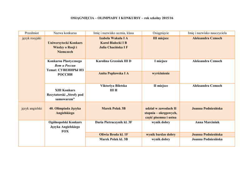 OSIĄGNIĘCIA – OLIMPIADY I KONKURSY – rok szkolny 2015/16 Przedmiot język rosyjski Imię i nazwisko ucznia, klasa Osiągnięcie Imię i nazwisko nauczyciela Izabela Wakuła I A Karol Białecki I B Julia Chacińska I F III miejsce Aleksandra Czmoch Karolina Grzesiuk III D I miejsce Aleksandra Czmoch Anita Popławska I A wyróżnienie Viktoriya Biletska III H II miejsce Aleksandra Czmoch 40. Olimpiada Języka Angielskiego Marek Polak 3B Joanna Podniesińska Ogólnopolski Konkurs Języka Angielskiego FOX Daria Pietruczynik kl. 3F udział w zawodach II stopnia – okręgowych, część pisemna i ustna wynik dobry Oliwia Broda kl. 1F Marek Polak kl. 3B wynik bardzo dobry wynik dobry Joanna Podniesińska Joanna Podniesińska Nazwa konkursu Uniwersytecki Konkurs Wiedzy o Rosji i Niemczech Konkursu Plastycznego Вот и Россия Temat: СУВЕНИРЫ ИЗ РОССИИ XIII Konkurs Recytatorski „Strofy pod samowarem” język angielski Anna Marciniuk Zuzanna Mroczek Ic wynik bardzo dobry Justyna Kosieradzka Joanna Ostrowska wynik dobry Anna Kamińska Kamila Lipińska język hiszpański Olimpiada Języka Hiszpańskiego Klaudia Biernacka, 3a II etap Olimpiady Języka Hiszpańskiego język włoski X Łódzki Konkurs Języka Włoskiego Sebastian Flanczewski 3c udział w II etapie konkursu język niemiecki IV Dyktando Języka Niemieckiego PSNJN Marian Soćko matematyka Dorota Cichy W. Lipińska IV m-ce , etap regionalny Olimpiada Języka Niemieckiego KOJN W. Lipińska Etap okręgowy Dorota Cichy Konkurs Kolęd i Poezji o Bożym Narodzeniu w Języku Niemieckim SCDiDN Konkurs Czytania Prozy i Recytacji Poezji Niemieckojęzycznej Loreley K. Siestrzewitowska, M. Kiełczykowska, A. Kucewicz I m-ce Dorota Cichy K.Siestrzewitowska II miejsce Dorota Cichy Alfik Matematyczny Paulina Morawska 3A Jakub Morawski 2A Maciej Chamera 3A wynik bardzo dobry wynik bardzo dobry wynik bardzo dobry Sylwia Lubelska Sylwia Lubelska Sylwia Lubelska Kangur Matematyczny informatyka fizyka historia X Międzynarodowy Konkurs Informatyczny BÓBR Konkurs Graficzny Magia Świąt Konkurs Fizyczny Eureka Olimpiada Wiedzy Historycznej Julianna Krasowska 3A Sebastian Domijański 1B Sylwia Łukasiuk 1G Morawski Jakub 2a Morawska Paulina 3a Maciej Chamera 3a Krawczyk Aleksandra 1b Dmowski Wojciech 1b Niedziółka Damian 2c kl. 2B: Bartosz Krasuski, Łukasz Guzek, Maciej Parapura, Iwona Wierzejska, Mateusz Sędzimierz, Norbert Zbojna, Kamil Baka, Karolina Kopyra, Jakub Nicewicz kl 3B: Maciej Soszyński, Piotr Graczyk, Jędrzej Wyczółkowski Jędrzej Wyczółkowski 3B, Magdalena Kieryło 2B Krzysztof Furmaniak IIIB Arek Polak III B Grzegorz Szcześniak I B Aleksandra Krawczyk I B 35 osób Bartosz Cabaj wynik dobry wynik dobry wynik dobry wynik bardzo dobry wyróżniony wyróżniony wyróżniony wyróżniony wyróżniony udział Sylwia Lubelska Damian Janowski Joanna Dejnek Sylwia Lubelska Sylwia Lubelska Sylwia Lubelska Damian Janowski Damian Janowski Tadeusz Koczoń Grażyna Sobiech udział Grażyna Sobiech Adam Kielak laureat etapu okręgowego wyróżnienie wynik bardzo dobry wynik bardzo dobry wynik bardzo dobry udział finalista olimpiady Sylwester Gajowniczek Barbara Kodzis IV Siedlecki Test Historyczny Bartosz Cabaj Wiktoria Leszczyńska Wiktor Tkaczyk II miejsce indywidualnie II miejsce zespołowo Barbara Kodzis XLII Olimpiada Historyczna Bartosz Cabaj -3d laureat etapu okręgowego z wynikiem dobrym Barbara Kodzis Anna Świątek -3d udział w zawodach okręgowych Karolina Goławska kl. 2d udział w zawodach okręgowych udział w zawodach okręgowych udział w zawodach okręgowych Anna Lipińska I miejsce Anna Lipińska Daria Konstanta – 2 h Aleksandra Łukasiuk –2 h Ogólnopolski Konkurs z okazji 34. Rocznicy Wprowadzenia Stanu Wojennego w kategorii grafika komputerowa Joanna Kotowska kl. 2 Piotr Kotarski Piotr Kotarski wiedza o społeczeństwie język polski III Konkurs Historyczny Polska ... Nasza Niepodległa. 1050 lat od Chrztu Polski-1050 lat Dziejów Narodu i Państwa Polskiego-test wiedzy Karolina Goławska kl.2d, Klaudia Siestrzewitowska kl. 2d, Emilia Oknińska kl. 2d, Aleksandra Czapska kl. 2d udział nna Lipińska - praca plastyczna (rysunek, plakat) Joanna Kotowska kl. 2d Konkurs Historia i kultura Żydów Polskich Aleksandra Czapska kl. 2d, Dagmara Boduszewska kl. 2d Aleksandra Lipińska kl.1 d udział Anna Lipińska XXI Olimpiada Tematyczna –Losy żołnierza i dzieje oręża polskiego w latach 15311683. Od Obertyna do Wiednia. Hubert Jastrzębski – klasa 1f laureat Karol Czmoch LVI Olimpiada Wiedzy o Polsce i Świecie Współczesnym Magdalena Jeziernicka Kamila Tchórzewska etap okręgowy Barbara Kodzis Karolina Goławska kl. 2d, Marta Kiełczykowska kl. 2d Kamila Woźniak 2d udział w zawodach okręgowych finalistka XLVI OLiJP Anna Lipińska Ewa Kamińska- Kuć Michalina Leńska 3 h finalistka XLVI OLiJP Małgorzata Kotarska Olimpiada Literatury i Języka Polskiego Barbara Kodzis Konkurs Mistrz czytania Z poprawną polszczyzną na co dzień Maria Kurkus etap okręgowy XLVI OLiJP Mirosława Postrzygacz Klaudia Siestrzewitowska IId I miejsce Ewa Kamińska- Kuć Ewelina Nowakowska II d III miejsce 4 osoby z kl. 1 f II etap 3 osoby3 h (M. Leńska, K. Soczewka, D. Artc) II etap Kl. 1d 1) Aleksandra Kudelska 2) Julian Maciejewski 3) Kamila Ułanowska 4) Karol Białecki 5) Katarzyna Prachnio 6) Klaudia Skorupka 7) Krystyna Domańska 8) Marta Krasuska 9) Martyna Zaniuk 10) Piotr Cześnik 11) Wiktoria Oniszczuk 12) Wiktoria Rozbicka 13) Wiktoria Tryniszewska Ewa Kamińska- Kuć Małgorzata Kotarska II etap Monika Kamont Katarzyna Prachnio – 1d finalistka Monika Kamont Z poprawną ortografią na co dzień 1) Joanna Demiańczuk - 1d 2) Julian Maciejewski- 1d 3) Katarzyna Prachnio- 1d 4) Maria Najfeld -1d 5) Piotr Cześnik -1d II etap Monika Kamont Konkurs Recytatorski Słowa- Dar i Tajemnica Bartosz Osik kl. 3d Oliwia Kruczyńska kl. 3d II miejsce (I nie przyznano) III miejsce Mirosława Postrzygacz Klau