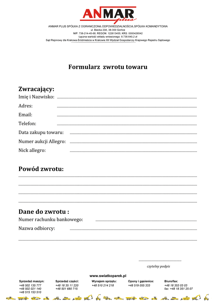 ANMAR PLUS SPÓŁKA Z OGRANICZONĄ ODPOWIEDZIALNOŚCIĄ SPÓŁKA KOMANDYTOWA ul. Biecka 23A, 38-300 Gorlice NIP: 738-214-45-68; 738 REGON: 122613455; KRS: 0000426542 Łączna wartość wkładu wniesionego: 8.738.640,2 zł Sąd Rejonowy dla Krakowa-Śródmieścia Śródmieścia w Krakowie XII Wydział Gospodarczy Krajowego Rejestru Sądowego Formularz zwrotu towaru Zwracający: Imię i Nazwisko: ....................................................................................................................... ................................................................................................................................................................................. ..................................................................... Adres: ....................................................................................................................... ................................................................................................................................................................................ ..................................................................... Email: ............................................................................................................................................................................................ ...................................................................................................................................................................................... Telefon: ............................................................................................................................................................................................ ...................................................................................................................................................................................... Data zakupu towaru: ...................................................................................................... .......................................................................................................................................................... ..................................................................... Numer aukcji Allegro: .................................................................... .................................................................................................................................................................. ..................................................................... Nick allegro: ............................................ .................................................................................................................................................................. ..................................................................... Powód zwrotu: ...................................................................................................... .................................................................................................................................................................................................... ..................................................................... ...................................................................................................... .................................................................................................................................................................................................... ..................................................................... ...................................................................................................... .................................................................................................................................................................................................... ..................................................................... ...................................................................................................... .................................................................................................................................................................................................... ..................................................................... Dane do zwrotu : Numer rachunku bankowego: bankowego Nazwa odbiorcy: ............................................................................................................................... ..................................................................... ............................................ .................................................................................................................................................................. ..................................................................... ...................................................................................................... .................................................................................................................................................................................................... ..................................................................... ........................................................... ...................................................... czytelny podpis www.swiatkoparek.pl Sprzedaż maszyn: +48 502 135 777 +48 502 021 140 +48 515 153 510 Sprzedaż części: +48 18 35 11 220 +48 501 680 715 Wynajem sprzętu: +48 510 214 218 Opony i gąsienice: +48 519 055 333 Biuro/fax: +48 18 353 03 03 fax: +48 18 351 25 07