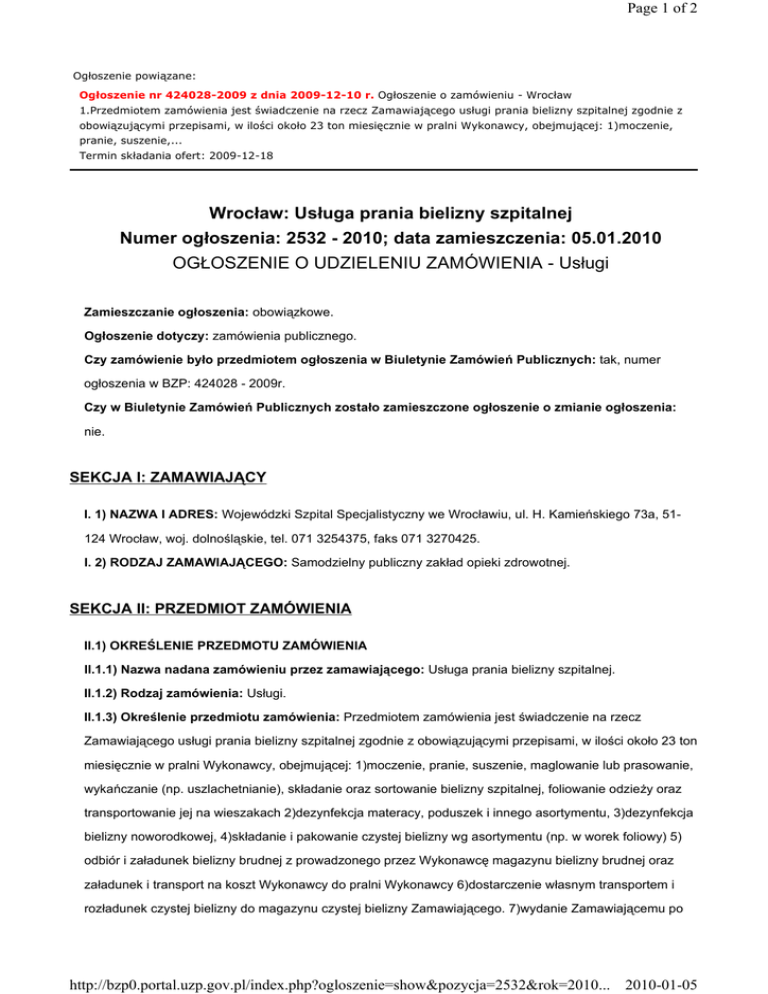Page 1 of 2 Ogłoszenie powiązane: Ogłoszenie nr 424028-2009 z dnia 2009-12-10 r. Ogłoszenie o zamówieniu - Wrocław 1.Przedmiotem zamówienia jest świadczenie na rzecz Zamawiającego usługi prania bielizny szpitalnej zgodnie z obowiązującymi przepisami, w ilości około 23 ton miesięcznie w pralni Wykonawcy, obejmującej: 1)moczenie, pranie, suszenie,... Termin składania ofert: 2009-12-18 Wrocław: Usługa prania bielizny szpitalnej Numer ogłoszenia: 2532 - 2010; data zamieszczenia: 05.01.2010 OGŁOSZENIE O UDZIELENIU ZAMÓWIENIA - Usługi Zamieszczanie ogłoszenia: obowiązkowe. Ogłoszenie dotyczy: zamówienia publicznego. Czy zamówienie było przedmiotem ogłoszenia w Biuletynie Zamówień Publicznych: tak, numer ogłoszenia w BZP: 424028 - 2009r. Czy w Biuletynie Zamówień Publicznych zostało zamieszczone ogłoszenie o zmianie ogłoszenia: nie. SEKCJA I: ZAMAWIAJĄCY I. 1) NAZWA I ADRES: Wojewódzki Szpital Specjalistyczny we Wrocławiu, ul. H. Kamieńskiego 73a, 51124 Wrocław, woj. dolnośląskie, tel. 071 3254375, faks 071 3270425. I. 2) RODZAJ ZAMAWIAJĄCEGO: Samodzielny publiczny zakład opieki zdrowotnej. SEKCJA II: PRZEDMIOT ZAMÓWIENIA II.1) OKREŚLENIE PRZEDMOTU ZAMÓWIENIA II.1.1) Nazwa nadana zamówieniu przez zamawiającego: Usługa prania bielizny szpitalnej. II.1.2) Rodzaj zamówienia: Usługi. II.1.3) Określenie przedmiotu zamówienia: Przedmiotem zamówienia jest świadczenie na rzecz Zamawiającego usługi prania bielizny szpitalnej zgodnie z obowiązującymi przepisami, w ilości około 23 ton miesięcznie w pralni Wykonawcy, obejmującej: 1)moczenie, pranie, suszenie, maglowanie lub prasowanie, wykańczanie (np. uszlachetnianie), składanie oraz sortowanie bielizny szpitalnej, foliowanie odzieŜy oraz transportowanie jej na wieszakach 2)dezynfekcja materacy, poduszek i innego asortymentu, 3)dezynfekcja bielizny noworodkowej, 4)składanie i pakowanie czystej bielizny wg asortymentu (np. w worek foliowy) 5) odbiór i załadunek bielizny brudnej z prowadzonego przez Wykonawcę magazynu bielizny brudnej oraz załadunek i transport na koszt Wykonawcy do pralni Wykonawcy 6)dostarczenie własnym transportem i rozładunek czystej bielizny do magazynu czystej bielizny Zamawiającego. 7)wydanie Zamawiającemu po http://bzp0.portal.uzp.gov.pl/index.php?ogloszenie=show&pozycja=2532&rok=2010... 2010-01-05 Page 2 of 2 wykonaniu usługi, posegregowanych i zapakowanych poszczególnych asortymentów wypranej bielizny wraz z opisem asortymentowym, zgodnie z oznakowaniem Zamawiającego, bielizny szpitalnej wraz z wykazem zawierającym spis bielizny.. II.1.4) Wspólny Słownik Zamówień (CPV): 98.31.00.00-9. II.1.5) Całkowita końcowa wartość zamówienia (bez VAT) obejmująca wszystkie zamówienia i części: 703800.00 PLN. SEKCJA IV: PROCEDURA IV.1) TRYB UDZIELENIA ZAMÓWIENIA: Przetarg nieograniczony IV.2) INFORMACJE ADMINISTRACYJNE Zamówienie dotyczy projektu/programu finansowanego ze środków Unii Europejskiej: nie SEKCJA V: UDZIELENIE ZAMÓWIENIA Część NR: 1 Nazwa: Usługa prania bielizny szpitalnej V.1) DATA UDZIELENIA ZAMÓWIENIA: 04.01.2010. V.2) LICZBA OTRZYMANYCH OFERT: 1. V.3) NAZWA I ADRES WYKONAWCY, KTÓREMU UDZIELONO ZAMÓWIENIA: IMPEL PERFEKTA Sp. z o.o., ul. ŚlęŜna 118, 51-111 Wrocław, kraj/woj. dolnośląskie. V.4) INFORMACJA O CENIE WYBRANEJ OFERTY ORAZ O NIE PODLEGAJĄCYCH ODRZUCENIU OFERTACH Z NAJNIśSZĄ I NAJWYśSZĄ CENĄ (bez VAT) Cena wybranej oferty: 703800.00 Oferta z najniŜszą ceną: 703800.00 oferta z najwyŜszą ceną: 703800.00 Waluta: PLN. http://bzp0.portal.uzp.gov.pl/index.php?ogloszenie=show&pozycja=2532&rok=2010... 2010-01-05