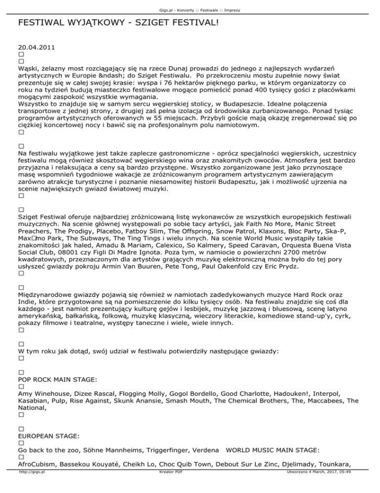 Gigs.pl - Koncerty :: Festiwale :: Imprezy FESTIWAL WYJĄTKOWY - SZIGET FESTIVAL! 20.04.2011 Wąski, żelazny most rozciągający się na rzece Dunaj prowadzi do jednego z najlepszych wydarzeń artystycznych w Europie – do Sziget Festiwalu. Po przekroczeniu mostu zupełnie nowy świat prezentuje się w całej swojej krasie: wyspa i 76 hektarów pięknego parku, w którym organizatorzy co roku na tydzień budują miasteczko festiwalowe mogące pomieścić ponad 400 tysięcy gości z placówkami mogącymi zaspokoić wszystkie wymagania. Wszystko to znajduje się w samym sercu węgierskiej stolicy, w Budapeszcie. Idealne połączenia transportowe z jednej strony, z drugiej zaś pełna izolacja od środowiska zurbanizowanego. Ponad tysiąc programów artystycznych oferowanych w 55 miejscach. Przybyli goście mają okazję zregenerować się po ciężkiej koncertowej nocy i bawić się na profesjonalnym polu namiotowym. Na festiwalu wyjątkowe jest także zaplecze gastronomiczne - oprócz specjalności węgierskich, uczestnicy festiwalu mogą również skosztować węgierskiego wina oraz znakomitych owoców. Atmosfera jest bardzo przyjazna i relaksująca a ceny są bardzo przystępne. Wszystko zorganizowane jest jako przynoszące masę wspomnień tygodniowe wakacje ze zróżnicowanym programem artystycznym zawierającym zarówno atrakcje turystyczne i poznanie niesamowitej historii Budapesztu, jak i możliwość ujrzenia na scenie największych gwiazd światowej muzyki. Sziget Festiwal oferuje najbardziej zróżnicowaną listę wykonawców ze wszystkich europejskich festiwali muzycznych. Na scenie głównej występowali po sobie tacy artyści, jak Faith No More, Manic Street Preachers, The Prodigy, Placebo, Fatboy Slim, The Offspring, Snow Patrol, Klaxons, Bloc Party, Ska-P, Maxïmo Park, The Subways, The Ting Tings i wielu innych. Na scenie World Music wystąpiły takie znakomitości jak haled, Amadu & Mariam, Calexico, So Kalmery, Speed Caravan, Orquesta Buena Vista Social Club, 08001 czy Figli Di Madre Ignota. Poza tym, w namiocie o powierzchni 2700 metrów kwadratowych, przeznaczonym dla artystów grających muzykę elektroniczną można było do tej pory usłyszeć gwiazdy pokroju Armin Van Buuren, Pete Tong, Paul Oakenfold czy Eric Prydz. Międzynarodowe gwiazdy pojawią się również w namiotach zadedykowanych muzyce Hard Rock oraz Indie, które przygotowane są na pomieszczenie do kilku tysięcy osób. Na festiwalu znajdzie się coś dla każdego - jest namiot prezentujący kulturę gejów i lesbijek, muzykę jazzową i bluesową, scenę latyno amerykańską, bałkańską, folkową, muzykę klasyczną, wieczory literackie, komediowe stand-up'y, cyrk, pokazy filmowe i teatralne, występy taneczne i wiele, wiele innych. W tym roku jak dotąd, swój udział w festiwalu potwierdziły następujące gwiazdy: POP ROCK MAIN STAGE: Amy Winehouse, Dizee Rascal, Flogging Molly, Gogol Bordello, Good Charlotte, Hadouken!, Interpol, Kasabian, Pulp, Rise Against, Skunk Anansie, Smash Mouth, The Chemical Brothers, The, Maccabees, The National, EUROPEAN STAGE: Go back to the zoo, Söhne Mannheims, Triggerfinger, Verdena WORLD MUSIC MAIN STAGE: AfroCubism, Bassekou Kouyaté, Cheikh Lo, Choc Quib Town, Debout Sur Le Zinc, Djelimady, Tounkara, http://gigs.pl Kreator PDF Utworzono 4 March, 2017, 05:49 Gigs.pl - Koncerty :: Festiwale :: Imprezy Eliades Ochoa, Goran Bregovic Wedding And Funeral Band, Gotan Project, Kasse Mady, Diabaté, Les Hurlements d’Léo, Ojos de Brujo, Rotfront, Socalled A38-WAN2 STAGE: Crystal Castles, Hurts, Marina and the Diamonds, Peter Bjorn and John PARTY ARENA: Bloody Beetroots Death Crew 77, Kid Cudi ROCK AND METAL MAIN STAGE: Deftones, Judas Priest, Lostprophets, Motörhead, Sonata Arctica, Within Temptation Sziget Festiwal – festiwal gwarantujący niezapomniane doznania zwolennikowi każdego rodzaju muzyki, bez względu na to, czy jest kobietą czy mężczyzną, nastolatkiem czy człowiekiem w kwiecie wieku – każdy znajdzie tu dla siebie wiele atrakcji. Klimat panujący na festiwalu uzależnia i praktycznie każdy, kto raz odwiedził to miejsce z pewnością wróci tu za rok. Bilet kempingowy: Przedsprzedaż do 30-tego kwietnia: 170€ . Od 1-go maja i na miejscu: 200€ Bilet nie-kempingowy: Przedsprzedaż do 30-tego kwietnia: 140€. Od 1-go maja i na miejscu: 170€ Bilet kempingowy dla pojazdów: Przedsprzedaż do 30-tego kwietnia: 110€. Od 1-go maja i na miejscu: 130€ Bilet jednodniowy: Przedsprzedaż i na miejscu: 45€ Bilety dostępne na terenie Polski tylko w sieci Eventim! DODATKOWE INFORMACJE: http://gigs.pl Kreator PDF Utworzono 4 March, 2017, 05:49 Gigs.pl - Koncerty :: Festiwale :: Imprezy Wyżywienie na festiwalu: 75 stoisk z jedzeniem – Od pizzy do sałatek lub od gyrosa do gulaszu Mamy teren dla międzynarodowej kuchni, gdzie 12 różnych krajów pokazuje swoje specjalności. Zakres cen: Pizza – 550 HUF + / ~1,8 GBP + / ~2 EUR + Kebab – 900 HUF + / ~3 GBP + / ~ 3,4 EUR + Danie na talerzu -900-1500 HUF + / ~3 – 5 GBP + / ~3,4-5,7 EUR + Informacje o piciu na Festiwalu; ceny: 72 bary 7 winiarni 5 pijalni pálinka (Węgierska specjalność, brandy) 7 kafejek 2 herbaciarnie Zakres cen: Piwo (0.5 litra) – 400 HUF +/ ~1,35 GBP +/ ~ 1,5 EUR + Wino (100ml) – 250 HUF + / ~0,85 GBP +/ ~1 EUR + Szoty (40ml) – 700 HUF + / ~2,4 GBP +/ ~2,65 EUR + 8-15.08.2011 BUDAPEST, WYSPA OBUDAI Szczegóły wkrótce na polskiej stronie: www.sziget.pl http://gigs.pl Kreator PDF Utworzono 4 March, 2017, 05:49 Gigs.pl - Koncerty :: Festiwale :: Imprezy http://gigs.pl Kreator PDF Utworzono 4 March, 2017, 05:49 Gigs.pl - Koncerty :: Festiwale :: Imprezy http://gigs.pl Kreator PDF Utworzono 4 March, 2017, 05:49