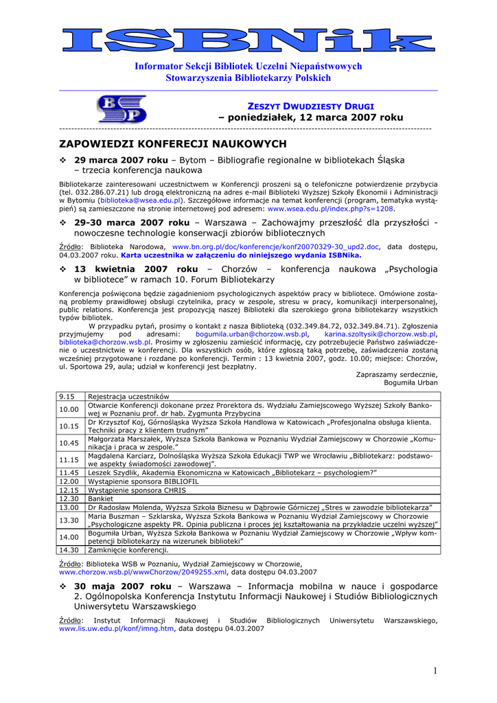 Informator Sekcji Bibliotek Uczelni Niepaństwowych Stowarzyszenia Bibliotekarzy Polskich _________________________________________________________________________________________________________________ ZESZYT DWUDZIESTY DRUGI – poniedziałek, 12 marca 2007 roku ---------------------------------------------------------------------------------------------------------------------------- ZAPOWIEDZI KONFERECJI NAUKOWYCH 29 marca 2007 roku – Bytom – Bibliografie regionalne w bibliotekach Śląska – trzecia konferencja naukowa Bibliotekarze zainteresowani uczestnictwem w Konferencji proszeni są o telefoniczne potwierdzenie przybycia (tel. 032.286.07.21) lub drogą elektroniczną na adres e-mail Biblioteki Wyższej Szkoły Ekonomii i Administracji w Bytomiu ([email protected]). Szczegółowe informacje na temat konferencji (program, tematyka wystąpień) są zamieszczone na stronie internetowej pod adresem: www.wsea.edu.pl/index.php?s=1208. 29-30 marca 2007 roku – Warszawa – Zachowajmy przeszłość dla przyszłości nowoczesne technologie konserwacji zbiorów bibliotecznych Źródło: Biblioteka Narodowa, www.bn.org.pl/doc/konferencje/konf20070329-30_upd2.doc, data dostępu, 04.03.2007 roku. Karta uczestnika w załączeniu do niniejszego wydania ISBNika. 13 kwietnia 2007 roku – Chorzów – konferencja w bibliotece” w ramach 10. Forum Bibliotekarzy naukowa „Psychologia Konferencja poświęcona będzie zagadnieniom psychologicznych aspektów pracy w bibliotece. Omówione zostaną problemy prawidłowej obsługi czytelnika, pracy w zespole, stresu w pracy, komunikacji interpersonalnej, public relations. Konferencja jest propozycją naszej Biblioteki dla szerokiego grona bibliotekarzy wszystkich typów bibliotek. W przypadku pytań, prosimy o kontakt z nasza Biblioteką (032.349.84.72, 032.349.84.71). Zgłoszenia przyjmujemy pod adresami: [email protected], [email protected], [email protected]. Prosimy w zgłoszeniu zamieścić informację, czy potrzebujecie Państwo zaświadczenie o uczestnictwie w konferencji. Dla wszystkich osób, które zgłoszą taką potrzebę, zaświadczenia zostaną wcześniej przygotowane i rozdane po konferencji. Termin : 13 kwietnia 2007, godz. 10.00; miejsce: Chorzów, ul. Sportowa 29, aula;; udział w konferencji jest bezpłatny. Zapraszamy serdecznie, Bogumiła Urban 9.15 10.00 10.15 10.45 11.15 11.45 12.00 12.15 12.30 13.00 13.30 14.00 14.30 Rejestracja uczestników Otwarcie Konferencji dokonane przez Prorektora ds. Wydziału Zamiejscowego Wyższej Szkoły Bankowej w Poznaniu prof. dr hab. Zygmunta Przybycina Dr Krzysztof Koj, Górnośląska Wyższa Szkoła Handlowa w Katowicach „Profesjonalna obsługa klienta. Techniki pracy z klientem trudnym” Małgorzata Marszałek, Wyższa Szkoła Bankowa w Poznaniu Wydział Zamiejscowy w Chorzowie „Komunikacja i praca w zespole.” Magdalena Karciarz, Dolnośląska Wyższa Szkoła Edukacji TWP we Wrocławiu „Bibliotekarz: podstawowe aspekty świadomości zawodowej”. Leszek Szydlik, Akademia Ekonomiczna w Katowicach „Bibliotekarz – psychologiem?” Wystąpienie sponsora BIBLIOFIL Wystąpienie sponsora CHRIS Bankiet Dr Radosław Molenda, Wyższa Szkoła Biznesu w Dąbrowie Górniczej „Stres w zawodzie bibliotekarza” Maria Buszman – Szklarska, Wyższa Szkoła Bankowa w Poznaniu Wydział Zamiejscowy w Chorzowie „Psychologiczne aspekty PR. Opinia publiczna i proces jej kształtowania na przykładzie uczelni wyższej” Bogumiła Urban, Wyższa Szkoła Bankowa w Poznaniu Wydział Zamiejscowy w Chorzowie „Wpływ kompetencji bibliotekarzy na wizerunek biblioteki” Zamknięcie konferencji. Źródło: Biblioteka WSB w Poznaniu, Wydział Zamiejscowy w Chorzowie, www.chorzow.wsb.pl/wwwChorzow/2049255.xml, data dostępu 04.03.2007 30 maja 2007 roku – Warszawa – Informacja mobilna w nauce i gospodarce 2. Ogólnopolska Konferencja Instytutu Informacji Naukowej i Studiów Bibliologicznych Uniwersytetu Warszawskiego Źródło: Instytut Informacji Naukowej i Studiów Bibliologicznych www.lis.uw.edu.pl/konf/imng.htm, data dostępu 04.03.2007 Uniwersytetu Warszawskiego, 1 Informator Sekcji Bibliotek Uczelni Niepaństwowych Stowarzyszenia Bibliotekarzy Polskich _________________________________________________________________________________________________________________ 25 - 28 września 2007 roku – Zakopane – 9. Krajowe Forum Informacji Naukowej i Technicznej pod hasłem „Wymiana informacji i rozwój profesjonalnych usług informacyjnych w edukacji, nauce i kulturze na rzecz społeczeństwa opartego na wiedzy” Szanowni Państwo, Polskie Towarzystwo Informacji Naukowej ma zaszczyt przesłać na Państwa ręce zaproszenie do udziału w 9. Krajowym Forum Informacji Naukowej i Technicznej, które będzie obradować pod hasłem „Wymiana informacji i rozwój profesjonalnych usług informacyjnych w edukacji, nauce i kulturze na rzecz społeczeństwa opartego na wiedzy”. Forum odbędzie się od 25 do 28 września 2007 roku w Zakopanem (Ośrodek Wczasów : „Hyrny”, ul. Piłsudskiego). Organizatorzy 9. FORUM INT zapraszają do udziału dyrektorów oraz pracowników bibliotek, instytutów naukowo-badawczych, ośrodków badawczo-rozwojowych, pracowników naukowych instytutów informacji naukowej i bibliotekoznawstwa oraz dziedzin pokrewnych, przedstawicieli stowarzyszeń działających w sferze informacji naukowej, technicznej i ekonomicznej, przedstawicieli administracji państwowej oraz osoby zainteresowane problematyką informacji naukowej. Liczymy na Państwa aktywny udział w FORUM. Szczegółowe informacje o FORUM wraz z formularzem zgłoszeniowym znajdą Państwo na stronie PTIN: www.ptin.org.pl (w dziale KONFERENCJE). Uprzejmie prosimy o zgłoszenie udziału w 9. FORUM INT do 15 kwietnia 2007 roku. Termin nadesłania pełnego tekstu referatu: do 30 czerwca 2007 roku. Licząc na Państwa życzliwą współpracę przesyłamy wyrazy poważania. W imieniu Komitetu Organizacyjnego Dr hab. 