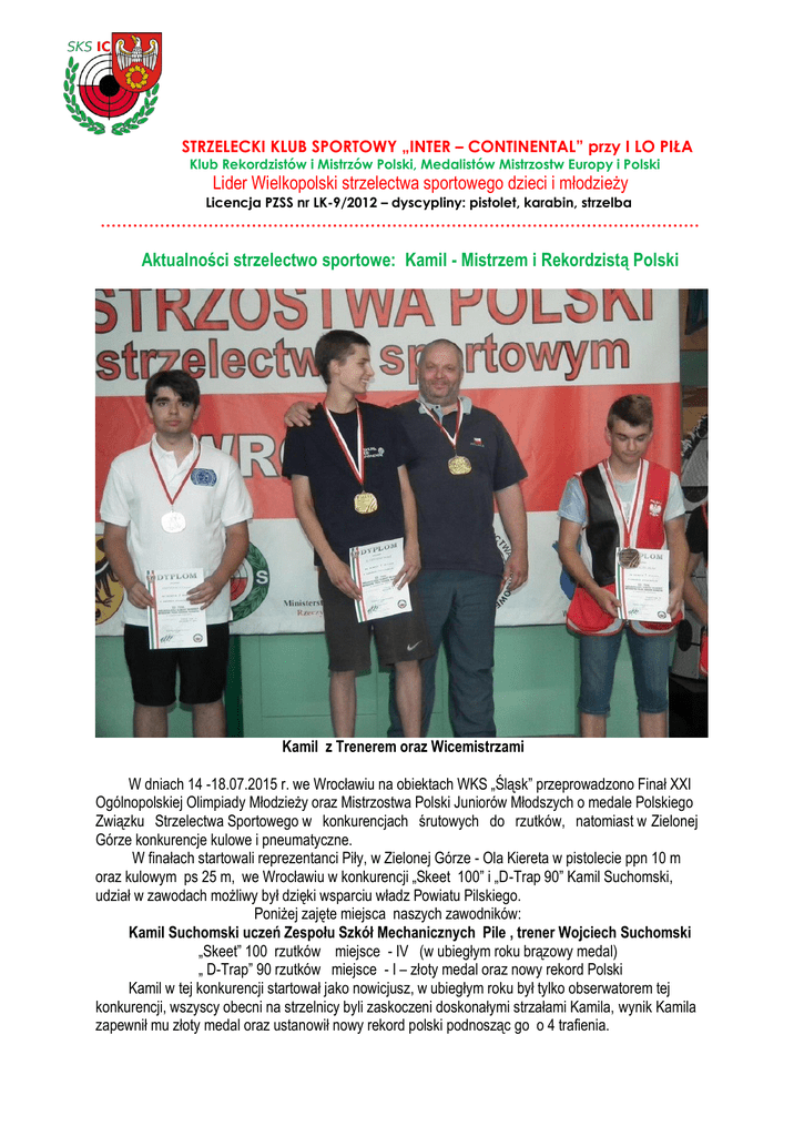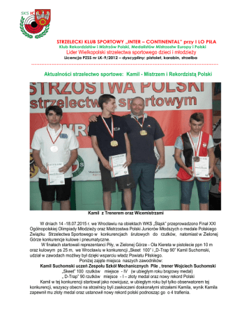 STRZELECKI KLUB SPORTOWY „INTER – CONTINENTAL” przy I LO PIŁA Klub Rekordzistów i Mistrzów Polski, Medalistów Mistrzostw Europy i Polski Lider Wielkopolski strzelectwa sportowego dzieci i młodzieży Licencja PZSS nr LK-9/2012 – dyscypliny: pistolet, karabin, strzelba ………………………………………………………………………………………………… Aktualności strzelectwo sportowe: Kamil - Mistrzem i Rekordzistą Polski Kamil z Trenerem oraz Wicemistrzami W dniach 14 -18.07.2015 r. we Wrocławiu na obiektach WKS „Śląsk” przeprowadzono Finał XXI Ogólnopolskiej Olimpiady Młodzieży oraz Mistrzostwa Polski Juniorów Młodszych o medale Polskiego Związku Strzelectwa Sportowego w konkurencjach śrutowych do rzutków, natomiast w Zielonej Górze konkurencje kulowe i pneumatyczne. W finałach startowali reprezentanci Piły, w Zielonej Górze - Ola Kiereta w pistolecie ppn 10 m oraz kulowym ps 25 m, we Wrocławiu w konkurencji „Skeet 100” i „D-Trap 90” Kamil Suchomski, udział w zawodach możliwy był dzięki wsparciu władz Powiatu Pilskiego. Poniżej zajęte miejsca naszych zawodników: Kamil Suchomski uczeń Zespołu Szkół Mechanicznych Pile , trener Wojciech Suchomski „Skeet” 100 rzutków miejsce - IV (w ubiegłym roku brązowy medal) „ D-Trap” 90 rzutków miejsce - I – złoty medal oraz nowy rekord Polski Kamil w tej konkurencji startował jako nowicjusz, w ubiegłym roku był tylko obserwatorem tej konkurencji, wszyscy obecni na strzelnicy byli zaskoczeni doskonałymi strzałami Kamila, wynik Kamila zapewnił mu złoty medal oraz ustanowił nowy rekord polski podnosząc go o 4 trafienia. Ciekawostką jest, że broń Kamila „bock” jest bronią specjalistyczną do strzelań „skeet”, ale do konkurencji „D-Trap” został dostosowany przez trenera, tj. ojca, który bierze udział we wszystkich konsultacjach strzeleckich kadry narodowej oraz prywatnych w Bydgoszczy, dobrym „duszkiem” wszystkich wyjazdów jest mama Kamila – Alicja Suchomska. Opinia trenera po zawodach – jestem zaskoczony podwójnie, negatywnie za strzelania w konkurencji „Skeet”, bo liczyliśmy na medal oraz super pozytywnie za strzelania w konkurencji „D-Trap”. Kamil lubi wyzwania i tak, po słabym „Skeet” doskonały „D-Trap”, musimy jeszcze dużo pracować, a przede wszystkim poszukać broni specjalistycznej do „D-Trap”. Aleksandra Kiereta uczennica Zespołu Szkół Budowlanych w Pile, trener Krystyna Sadowska Pistolet sportowy 25 m 30+30 strzałów miejsce 13 Pistolet pneumatyczny 10 m – 40 strzałów miejsce 19 Aleksandra, była Mistrzyni Polski gimnazjalistek, bieżący rok przepracowała na wysokich obrotach, dom, szkoła, praktyki szkolne, treningi, konsultacje, zawody oraz obozy sportowe. Opinia trenerki – możliwość przemęczenia, nie trafienie w formę, w okresie zimy musimy podnieść wytrzymałość ogólną oraz zakupić dla Oli obuwie specjalistyczne do strzelań pistoletowych. W zawodach Finałach OOM startowało 320 zawodników z 67 klubów. Informujemy, że w okresie wakacji dla dzieci roczniki 2000-2003 w godz.16.00-18.00 prowadzone są w Klubie konsultacje strzeleckie, we środy w sali strzeleckiej I LO na ul. W. Pola 11, a w czwartki na strzelnicy „Tarcza”. Przypominamy, że w konsultacjach mogą brać udział kandydaci do egzaminu na paten strzelecki planowany w Pile na dzień 29.08.2015 r. o godz.14.00 na strzelnicy „Tarcza”, udział po wcześniejszej telefonicznej informacji – zgłoszeniu. Dekoracja zawodników w konkurencji „Double-Trap” Złoci medaliści w poszczególnych konkurencjach strzelań do rzutków: Finaliści konkurencji „D-Trap” Kazimierz Sadowski – prezes wolontariusz