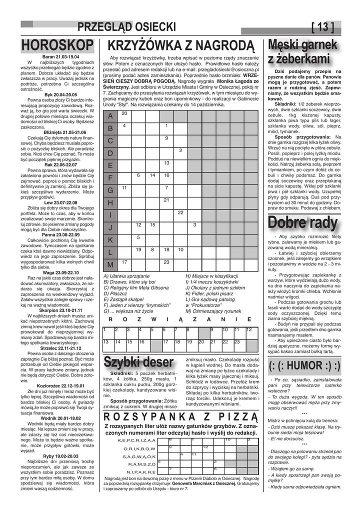 PRZEGLĄD OSIECKI [ 13 ] HOROSKOP KRZYŻÓWKA Z NAGRODĄ Męski garnek Baran 21.03-19.04 W najbliższych tygodniach wszystko przebiegać będzie zgodnie z planem. Dobrze układać się będzie zwłaszcza w pracy. Uważaj jednak na podróże, potrzebna Ci szczególna ostrożność. Byk 20.04-20.05 Pewna osoba złoży Ci bardzo interesującą propozycję zawodową. Rozważ ją, bo gra jest warta świeczki. W drugiej połowie miesiąca oczekuj wiadomości od bliskiej Ci osoby. Będziesz zaskoczona. Bliźnięta 21.05-21.06 Czekają Cię dylematy natury finansowej. Chyba będziesz musiała poprosić o pożyczkę bliskich. Ale poradzisz sobie. Ktoś chce Cię poznać. To może być początek pięknej przyjaźni. Rak 22.06-22.07 Pewna sprawa, która wydawała się załatwiona powróci i znów będzie Cię zajmować. poproś o pomoc bliskich i definitywnie ją zamknij. Zbliża się jakieś szczęśliwe wydarzenie. Może przypływ gotówki. Lew 23.07-22.08 Zbliża się dobry okres dla Twojego portfela. Może to czas, aby w końcu zrealizować swoje marzenie. Skontroluj zdrowie, bo jesienne zmiany pogody mogą być dla Ciebie niekorzystne. Panna 23.08-22.09 Całkowicie pochłoną Cię kwestie zawodowe. Tymczasem na spotkanie czeka ktoś dawno niewidziany. Odpowiedz na jego zaproszenie. Spróbuj wygospodarować kilka wolnych chwil tylko dla siebie. Waga 23.09-22.10 Raz na jakiś czas dobrze jest naładować akumulatory, zwłaszcza, że nadarza się okazja. Skorzystaj z zaproszenia na weekendowy wyjazd. Załatw wszystkie zaległe sprawy i czekaj na ważną wiadomość. Skorpion 23.10-21.11 W najbliższych dniach musisz unikać niepotrzebnych kłótni. Zachowaj zimną krew nawet jeśli ktoś będzie Cię prowokował do nieprzyjemnej wymiany zdań. Spodziewaj się bardzo miłego spotkania towarzyskiego. Strzelec 22.11-21.12 Pewna osoba z dalszego otoczenia zapragnie Cię bliżej poznać. Być może potrzebuje od Ciebie jakiegoś wsparcia. W pracy kadrowe zmiany, jednak nie będą dotyczyć Ciebie. Dobre zdrowie. Koziorożec 22.12-19.01 Złe dni już minęły i teraz może być tylko lepiej. Szczęśliwa wiadomość od bardzo bliskiej Ci osoby. A gwiazdy mówią,że może poprawić się Twoja sytuacja finansowa. Wodnik 20.01-18.02 Wodniki będą miały bardzo dobry miesiąc. Na lepsze zmieni się w pracy, ale zdarzy się też coś nieoczekiwanego. Może to będzie ważne spotkanie, może przypływ gotówki, może wyjazd. Ryby 19.02-20.03 Najbliższe dni przeniosą trochę nieporozumień, ale jak zawsze ze wszystkim sobie poradzisz. Poznasz przy tym bardzo miłą osobę. W domu spodziewaj się wiadomości, która zmieni waszą codzienność. Aby rozwiązać krzyżówkę, trzeba wpisać w poziome rzędy znaczenie słów. Potem z oznaczonych liter ułożyć hasło. Prawidłowe hasło należy przesłać pod adresem redakcji lub na e-mail: [email protected] (prosimy podać adres zamieszkania). Poprzednie hasło brzmiało: WRZESIEŃ CIESZY DOBRĄ POGODĄ. Nagrodę wygrała Monika Łagoda ze Świerczyny. Jest odbioru w Urzędzie Miasta i Gminy w Osiecznej, pokój nr 7. Zachęcamy do przesyłania rozwiązań krzyżow ́ ek, w tym miesiącu do wygrania magiczny kubek oraz bon upominkowy - do realizacji w Gabinecie Urody "Styl". Na rozwiązania czekamy do 14 października. A 20 B 4 1 9 C 2 D 13 E 6 F 14 16 11 G 7 21 H 22 I J 12 K 5 L 19 15 18 17 M 10 23 H) Miejsce w klasyfikacji I) 1/4 meczu koszykówki J) Okulary z jednym szkłem K) Fidler, polski pisarz L) Gra sądową patolog w “Prokuratorze” M) Ośmieszający rysunek A) Ułatwia sprzątanie B) Drzewo, które się boi C) Religijny film Mela Gibsona D) Płaszcz E) Zastąpił skalpel F) Jeden z wierszy “krymskich” G) ... większa niż życie R O Z W 5 1 2 3 4 13 14 15 16 I Ą Z 6 7 8 17 18 19 Szybki deser A 20 N I E 9 10 11 12 21 22 23 zmiksuj masło. Czekoladę rozpuść w kąpieli wodnej. Do masła dodawaj na zmianę po łyżce czekolady i kilka łyżek masy jajecznej i miksuj. Schłódź w lodówce. Przełóż krem do szprycy i wyciskaj na herbatniki. Składaj po kilka herbatników, tworząc torciki. Udekoruj je kremem i kandyzowanymi wiśniami. Składniki: 5 paczek herbatników, ków 4 żółtka, żółtka 250g masła, masła 1 szklanka cukru pudru, 200g gorzkiej czekolady, kandyzowane wiśnie. Sposób przygotowania: Żółtka zmiksuj z cukrem. W drugiej misce ROZSYPANKA Z PIZZĄ Z rozsypanych liter ułóż nazwy gatunków grzybów. Z oznaczonych numerami liter odczytaj hasło i wyślij do redakcji. 8 K,E,P,C,R,I,Z,A,A O,R,I,K,B,O,W N,I,P,A,K,R,E 5 10 3 12 4 S,A,G,W,Ą,Ó,K R,A,M,S,Z,D 1 9 11 2 7 Dziś podajemy przepis na pyszne danie dla panów. Panowie mogą je przygotować, a potem razem z rodziną zjeść. Zapewniamy, że wszystkim będzie smakować. Składniki: 1/2 żeberek wieprzowych, dwie szklanki soczewicy, dwie cebule, 1kg kiszonej kapusty, szklanka piwa typu pils lub lager, szklanka wody, oliwa, sól, pieprz, miód, tymianek. Sposób przygotowania: Na dnie garnka rozgrzej kilka łyżek oliwy. Wrzuć na nią pocięte w pióra cebule. Posól, popieprz i polej łyżką miodu. Podduś na niewielkim ogniu do miękkości. Natrzyj żeberka solą, pieprzem i tymiankiem, po czym dołóż do cebuli i chwilę podsmaż. Do garnka dodaj soczewicę oraz przepłukaną na sicie kapustę. Wklej pół szklanki piwa i pół szklanki wody. Uzupełnij płyny gdy odparują. Duś pod przykryciem od 30 minut do godziny. Dopraw do smaku. Podawaj z chlebem. Dobre rady 3 8 z żeberkami 6 Nagrodą jest bon na dowolną pizzę z menu w Pizzerii Diabolo w Osiecznej. Nagrodę za poprzednią rozsypankę otrzymuje: Genowefa Marciniak z Osiecznej. Gratulujemy i zapraszamy po odbiór do Urzędu - biuro nr 7. - Aby szybko rozmrozić filety rybne, zalewamy je mlekiem lub garybne zowaną wodą mineralną. - Łatwiej i szybciej obierzemy czosnek, jeśli zalejemy go wrzątkiem i pozostawimy w wodzie na 2 - 3 minuty. - Przygotowując zapiekankę z warzyw, które wydzielają dużo