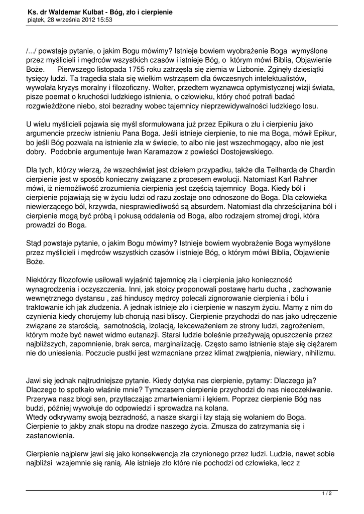 Ks. dr Waldemar Kulbat - Bóg, zło i cierpienie piątek, 28 września 2012 15:53 /.../ powstaje pytanie, o jakim Bogu mówimy? Istnieje bowiem wyobrażenie Boga wymyślone przez myślicieli i mędrców wszystkich czasów i istnieje Bóg, o którym mówi Biblia, Objawienie Boże. Pierwszego listopada 1755 roku zatrzęsła się ziemia w Lizbonie. Zginęły dziesiątki tysięcy ludzi. Ta tragedia stała się wielkim wstrząsem dla ówczesnych intelektualistów, wywołała kryzys moralny i filozoficzny. Wolter, przedtem wyznawca optymistycznej wizji świata, pisze poemat o kruchości ludzkiego istnienia, o człowieku, który choć potrafi badać rozgwieżdżone niebo, stoi bezradny wobec tajemnicy nieprzewidywalności ludzkiego losu. U wielu myślicieli pojawia się myśl sformułowana już przez Epikura o złu i cierpieniu jako argumencie przeciw istnieniu Pana Boga. Jeśli istnieje cierpienie, to nie ma Boga, mówił Epikur, bo jeśli Bóg pozwala na istnienie zła w świecie, to albo nie jest wszechmogący, albo nie jest dobry. Podobnie argumentuje Iwan Karamazow z powieści Dostojewskiego. Dla tych, którzy wierzą, że wszechświat jest dziełem przypadku, także dla Teilharda de Chardin cierpienie jest w sposób konieczny związane z procesem ewolucji. Natomiast Karl Rahner mówi, iż niemożliwość zrozumienia cierpienia jest częścią tajemnicy Boga. Kiedy ból i cierpienie pojawiają się w życiu ludzi od razu zostaje ono odnoszone do Boga. Dla człowieka niewierzącego ból, krzywda, niesprawiedliwość są absurdem. Natomiast dla chrześcijanina ból i cierpienie mogą być próbą i pokusą oddalenia od Boga, albo rodzajem stromej drogi, która prowadzi do Boga. Stąd powstaje pytanie, o jakim Bogu mówimy? Istnieje bowiem wyobrażenie Boga wymyślone przez myślicieli i mędrców wszystkich czasów i istnieje Bóg, o którym mówi Biblia, Objawienie Boże. Niektórzy filozofowie usiłowali wyjaśnić tajemnicę zła i cierpienia jako konieczność wynagrodzenia i oczyszczenia. Inni, jak stoicy proponowali postawę hartu ducha , zachowanie wewnętrznego dystansu , zaś hinduscy mędrcy polecali zignorowanie cierpienia i bólu i traktowanie ich jak złudzenia. A jednak istnieje zło i cierpienie w naszym życiu. Mamy z nim do czynienia kiedy chorujemy lub chorują nasi bliscy. Cierpienie przychodzi do nas jako udręczenie związane ze starością, samotnością, izolacją, lekceważeniem ze strony ludzi, zagrożeniem, którym może być nawet widmo eutanazji. Starsi ludzie boleśnie przeżywają opuszczenie przez najbliższych, zapomnienie, brak serca, marginalizację. Często samo istnienie staje się ciężarem nie do uniesienia. Poczucie pustki jest wzmacniane przez klimat zwątpienia, niewiary, nihilizmu. Jawi się jednak najtrudniejsze pytanie. Kiedy dotyka nas cierpienie, pytamy: Dlaczego ja? Dlaczego to spotkało właśnie mnie? Tymczasem cierpienie przychodzi do nas nieoczekiwanie. Przerywa nasz błogi sen, przytłaczając zmartwieniami i lękiem. Poprzez cierpienie Bóg nas budzi, później wywołuje do odpowiedzi i sprowadza na kolana. Wtedy odkrywamy swoją bezradność, a nasze skargi i łzy stają się wołaniem do Boga. Cierpienie to jakby znak stopu na drodze naszego życia. Zmusza do zatrzymania się i zastanowienia. Cierpienie najpierw jawi się jako konsekwencja zła czynionego przez ludzi. Ludzie, nawet sobie najbliżsi wzajemnie się ranią. Ale istnieje zło które nie pochodzi od człowieka, lecz z 1/2 Ks. dr Waldemar Kulbat - Bóg, zło i cierpienie piątek, 28 września 2012 15:53 otaczającego nas świata. Kataklizmy, huragany, powodzie, trzęsienia ziemi i inne klęski żywiołowe pokazują, że świat nie jest wyłącznie harmonijny, ale jest w nim element chaosu, nieprzewidywalności, zniszczenia. A przecież Biblia mówi, że to co stworzył Bóg jest dobre. Okazuje się, że Bóg nie chciał statycznego, wykończonego świata, lecz świata z nieskończoną liczbą możliwości. Bóg nie chciał ludzi jako bezwolnych marionetek, ale istot inteligentnych, wolnych, twórczych. Obdarzył człowieka rozumem, aby mógł odkrywać wszelkie możliwości świata. Człowiek może czynić zło, ale także może zwalczać choroby, chronić siebie i innych solidarnie przed klęskami. Na tym polega tajemnica wolności i godności człowieka. Człowiek wolny, inteligentny i odpowiedzialny może jednak zbuntować się przeciw Bogu, odwrócić się od Niego, wykluczyć Go ze swojego życia. Często pada zarzut o milczeniu Boga, mówi się także o „zaćmieniu Boga”. Tymczasem objawienie Boże przynosi nam odpowiedź i rozwiązanie trudności. Bóg odpowiedział na ludzkie pytania wznoszone od czasów biblijnego Hioba, przez swojego Syna. Jezus od którego uczniowie oczekiwali, że zostanie ziemskim królem i zapewni im stanowiska i dostatek ,wyjaśniał im, że : „musi udać się do Jerozolimy i wiele wycierpieć od starszych i arcykapłanów oraz uczonych w Piśmie; że będzie zabity i trzeciego dnia zmartwychwstanie”/Mt 16,21-23/. A kiedy Piotr wziął Go na bok i począł robić Mu wyrzuty, odwrócił się i rzekł do Piotra: „Zejdź mi z oczu szatanie! Jesteś mi zawadą, bo nie myślisz po bożemu, lecz po ludzku”. Często też myślimy „po ludzku”. Tymczasem Pan Jezus nie tylko ukazał sens cierpienia. Także sam przeszedł przez cierpienie. Kiedy uczniowie podczas śmiertelnego zagrożenia na Jeziorze Genezaret zwrócili się z wyrzutem „Panie nie obchodzi Cię, że giniemy” Jezus był razem z nimi w chwili trwogi i uspokoił rozszalałe fale. W Ewangelii Jezus pokazuje, że każde cierpienie może być źródłem życia i wydać owoce. W świetle łaski Ducha św. człowiek może zrozumieć, że istnieje ścisła więź krzyża, zmartwychwstania i wiary, oraz że można nauczyć się je ofiarowywać w tajemnicy miłości, dzięki której istnieje świat. Bóg nie zsyła nam cierpienia aby nas udręczyć. Bóg nie kocha cierpienia, ale 