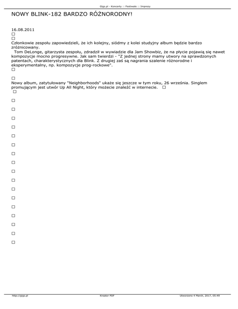 Gigs.pl - Koncerty :: Festiwale :: Imprezy NOWY BLINK-182 BARDZO RÓŻNORODNY! 16.08.2011 Członkowie zespołu zapowiedzieli, że ich kolejny, siódmy z kolei studyjny album będzie bardzo zróżnicowany. Tom DeLonge, gitarzysta zespołu, zdradził w wywiadzie dla Jam Showbiz, że na płycie pojawią się nawet kompozycje mocno progresywne. Jak sam twierdzi - "Z jednej strony mamy utwory na sprawdzonych patentach, charakterystycznych dla Blink. Z drugiej zaś są nagrania szalenie różnorodne i eksperymentalny, np. kompozycje prog-rockowe". Nowy album, zatytułowany "Neighborhoods" ukaże się jeszcze w tym roku, 26 września. Singlem promującym jest utwór Up All Night, który możecie znaleźć w internecie. http://gigs.pl Kreator PDF Utworzono 4 March, 2017, 05:49