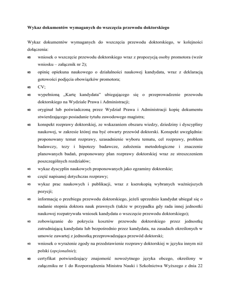 Wykaz dokumentów wymaganych do wszczęcia przewodu doktorskiego Wykaz dokumentów wymaganych do wszczęcia przewodu doktorskiego, w kolejności dołączenia: • wniosek o wszczęcie przewodu doktorskiego wraz z propozycją osoby promotora (wzór wniosku – załącznik nr 2); • opinię opiekuna naukowego o działalności naukowej kandydata, wraz z deklaracją gotowości podjęcia obowiązków promotora; • CV; • wypełnioną „Kartę kandydata” ubiegającego się o przeprowadzenie przewodu doktorskiego na Wydziale Prawa i Administracji; • oryginał lub poświadczoną przez Wydział Prawa i Administracji kopię dokumentu stwierdzającego posiadanie tytułu zawodowego magistra; • konspekt rozprawy doktorskiej, ze wskazaniem obszaru wiedzy, dziedziny i dyscypliny naukowej, w zakresie której ma być otwarty przewód doktorski. Konspekt uwzględnia: proponowany temat rozprawy, uzasadnienie wyboru tematu, cel rozprawy, problem badawczy, tezy i hipotezy badawcze, założenia metodologiczne i znaczenie planowanych badań, proponowany plan rozprawy doktorskiej wraz ze streszczeniem poszczególnych rozdziałów; • wykaz dyscyplin naukowych proponowanych jako egzaminy doktorskie; • część napisanej dotychczas rozprawy; • wykaz prac naukowych i publikacji, wraz z kserokopią wybranych ważniejszych pozycji; • informację o przebiegu przewodu doktorskiego, jeżeli uprzednio kandydat ubiegał się o nadanie stopnia doktora nauk prawnych (także w przypadku gdy rada innej jednostki naukowej rozpatrywała wniosek kandydata o wszczęcie przewodu doktorskiego); • zobowiązanie do pokrycia kosztów przewodu doktorskiego przez jednostkę zatrudniającą kandydata lub bezpośrednio przez kandydata, na zasadach określonych w umowie zawartej z jednostką przeprowadzająca przewód doktorski; • wniosek o wyrażenie zgody na przedstawienie rozprawy doktorskiej w języku innym niż polski (opcjonalnie); • certyfikat potwierdzający znajomość nowożytnego języka obcego, określony w załączniku nr 1 do Rozporządzenia Ministra Nauki i Szkolnictwa Wyższego z dnia 22 września 2011 r. w sprawie szczegółowego trybu i warunków przeprowadzania czynności w przewodach doktorskich, w postępowaniu habilitacyjnym oraz w postępowaniu o nadanie tytułu profesora (opcjonalnie; załącznik nr 3). Warunkiem wszczęcia przewodu doktorskiego jest posiadanie - samodzielnej lub współautorstwa - wydanej lub przyjętej do druku publikacji naukowej w formie książki lub co najmniej jednej publikacji naukowej w recenzowanym czasopiśmie naukowym o zasięgu co najmniej krajowym, określonym przez Ministra Nauki i Szkolnictwa Wyższego na podstawie przepisów dotyczących finansowania nauki lub w recenzowanym sprawozdaniu z międzynarodowej konferencji naukowej.