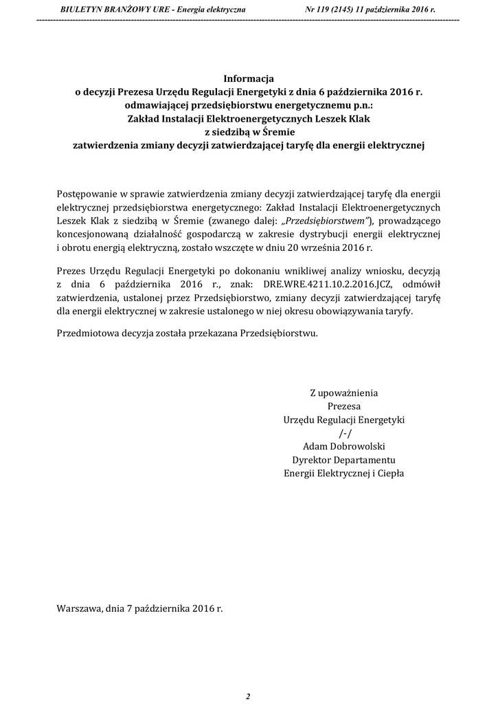 BIULETYN BRANŻOWY URE - Energia elektryczna Nr 119 (2145) 11 października 2016 r. -------------------------------------------------------------------------------------------------------------------------------------------------------- Informacja o decyzji Prezesa Urzędu Regulacji Energetyki z dnia 6 października 2016 r. odmawiającej przedsiębiorstwu energetycznemu p.n.: Zakład Instalacji Elektroenergetycznych Leszek Klak z siedzibą w Śremie zatwierdzenia zmiany decyzji zatwierdzającej taryfę dla energii elektrycznej Postępowanie w sprawie zatwierdzenia zmiany decyzji zatwierdzającej taryfę dla energii elektrycznej przedsiębiorstwa energetycznego: Zakład Instalacji Elektroenergetycznych Leszek Klak z siedzibą w Śremie (zwanego dalej: „Przedsiębiorstwem”), prowadzącego koncesjonowaną działalność gospodarczą w zakresie dystrybucji energii elektrycznej i obrotu energią elektryczną, zostało wszczęte w dniu 20 września 2016 r. Prezes Urzędu Regulacji Energetyki po dokonaniu wnikliwej analizy wniosku, decyzją z dnia 6 października 2016 r., znak: DRE.WRE.4211.10.2.2016.JCZ, odmówił zatwierdzenia, ustalonej przez Przedsiębiorstwo, zmiany decyzji zatwierdzającej taryfę dla energii elektrycznej w zakresie ustalonego w niej okresu obowiązywania taryfy. Przedmiotowa decyzja została przekazana Przedsiębiorstwu. Z upoważnienia Prezesa Urzędu Regulacji Energetyki /-/ Adam Dobrowolski Dyrektor Departamentu Energii Elektrycznej i Ciepła Warszawa, dnia 7 października 2016 r. 2