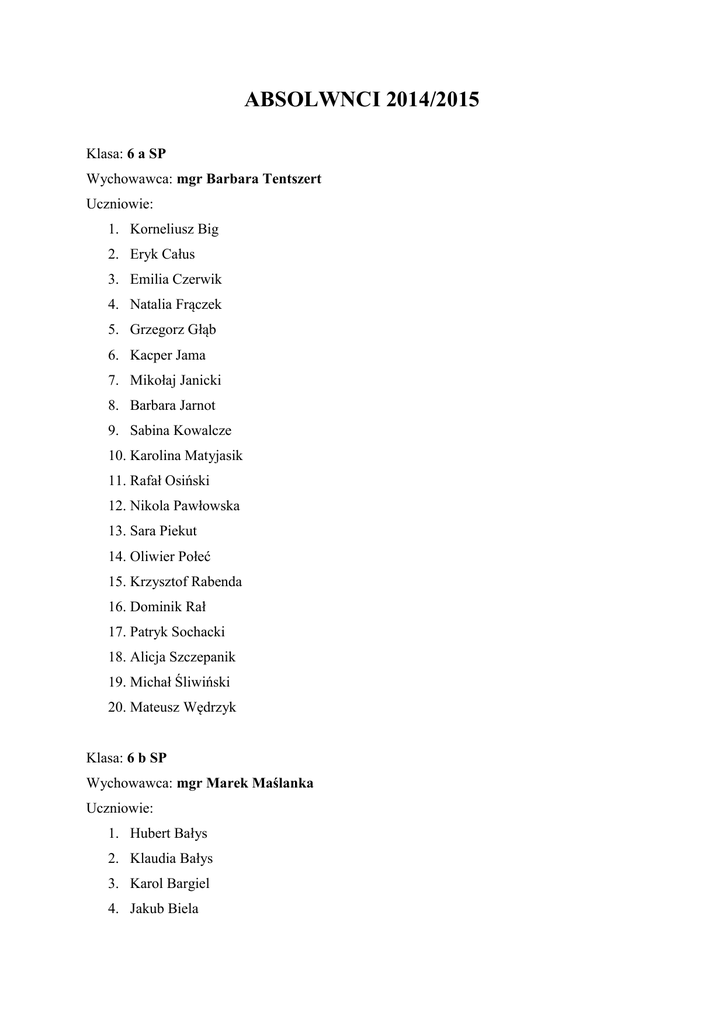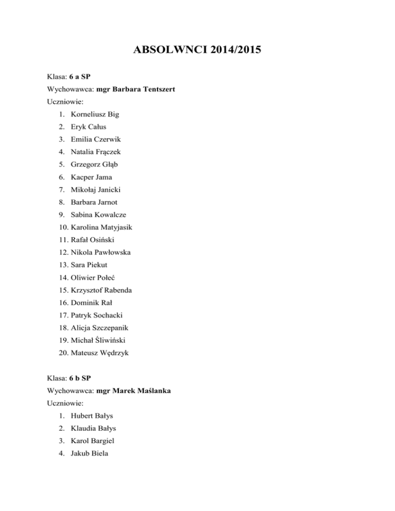 ABSOLWNCI 2014/2015 Klasa: 6 a SP Wychowawca: mgr Barbara Tentszert Uczniowie: 1. Korneliusz Big 2. Eryk Całus 3. Emilia Czerwik 4. Natalia Frączek 5. Grzegorz Głąb 6. Kacper Jama 7. Mikołaj Janicki 8. Barbara Jarnot 9. Sabina Kowalcze 10. Karolina Matyjasik 11. Rafał Osiński 12. Nikola Pawłowska 13. Sara Piekut 14. Oliwier Połeć 15. Krzysztof Rabenda 16. Dominik Rał 17. Patryk Sochacki 18. Alicja Szczepanik 19. Michał Śliwiński 20. Mateusz Wędrzyk Klasa: 6 b SP Wychowawca: mgr Marek Maślanka Uczniowie: 1. Hubert Bałys 2. Klaudia Bałys 3. Karol Bargiel 4. Jakub Biela 5. Roksana Folga 6. Julia Frączek 7. Agata Kowalczyk 8. Bartłomiej Kuwik 9. Patryk Palka 10. Zuzanna Sarnecka 11. Wiktoria Sęk 12. Jan Siepak 13. Szymon Siwiec 14. Konrad Skwarczyński 15. Patryk Skwarczyński 16. Wojciech Tomala 17. Wiktor Snopko Klasa: 3 a GIMNAZJUM Wychowawca: mgr Ewa Doległo Uczniowie: 1. Aleksandra Banach 2. Katarzyna Biernat 3. Julita Brusik 4. Tobiasz Buassa 5. Jerzy Czajecki 6. Magdalena Janicka 7. Damian Jarzyna 8. Joanna Kaczmarczyk 9. Patrycja Kajdas 10. Krzysztof Koszyk 11. Katarzyna Kowalska 12. Tobiasz Kuzia 13. Jacek Maślanka 14. Maria Matla 15. Bartłomiej Miętka 16. Klaudia Momot 17. Grzegorz Nowak 18. Gabriela Pawłowska 19. Michał Plata 20. Michał Rospond 21. Jakub Soból 22. Mateusz Syrek 23. Mateusz Wątroba 24. Piotr Zejma 25. Łukasz Zieliński Klasa: 3 b GIMNAZJUM Wychowawca: mgr Monika Skowron Uczniowie: 1. Adrian Bogunia 2. Karolina Bogunia 3. Mikołaj Bokota 4. Jarosław Brandys 5. Karina Fierdonek 6. Magdalena Gierek 7. Piotr Giermek 8. Krystian Kamski 9. Paulina Kobylańska 10. Bartłomiej Kowalczyk 11. Zuzanna Kozak 12. Artur Królczyk 13. Weronika Kurzak 14. Damian Mamoń 15. Karolina Matusyk 16. Natalia Mruczek 17. Katarzyna Nowak 18. Jakub Pardygał 19. Jakub Piela 20. Jakub Pietrańczyk 21. Zuzanna Pindel 22. Natalia Sęk 23. Natalia Smolarz 24. Dominik Ściupider 25. Anna Wątroba 26. Mariusz Wróbel