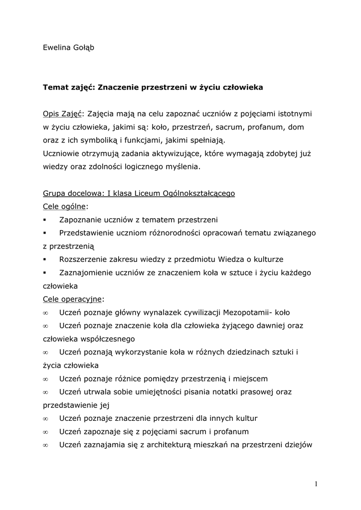 Ewelina Gołąb Temat zajęć: Znaczenie przestrzeni w Ŝyciu człowieka Opis Zajęć: Zajęcia mają na celu zapoznać uczniów z pojęciami istotnymi w Ŝyciu człowieka, jakimi są: koło, przestrzeń, sacrum, profanum, dom oraz z ich symboliką i funkcjami, jakimi spełniają. Uczniowie otrzymują zadania aktywizujące, które wymagają zdobytej juŜ wiedzy oraz zdolności logicznego myślenia. Grupa docelowa: I klasa Liceum Ogólnokształcącego Cele ogólne: Zapoznanie uczniów z tematem przestrzeni Przedstawienie uczniom róŜnorodności opracowań tematu związanego z przestrzenią Rozszerzenie zakresu wiedzy z przedmiotu Wiedza o kulturze Zaznajomienie uczniów ze znaczeniem koła w sztuce i Ŝyciu kaŜdego człowieka Cele operacyjne: • Uczeń poznaje główny wynalazek cywilizacji Mezopotamii- koło • Uczeń poznaje znaczenie koła dla człowieka Ŝyjącego dawniej oraz człowieka współczesnego • Uczeń poznają wykorzystanie koła w róŜnych dziedzinach sztuki i Ŝycia człowieka • Uczeń poznaje róŜnice pomiędzy przestrzenią i miejscem • Uczeń utrwala sobie umiejętności pisania notatki prasowej oraz przedstawienie jej • Uczeń poznaje znaczenie przestrzeni dla innych kultur • Uczeń zapoznaje się z pojęciami sacrum i profanum • Uczeń zaznajamia się z architekturą mieszkań na przestrzeni dziejów 1 Formy pracy: Zbiorowa Indywidualna Metody pracy: • Opis • Wykład • Dyskusja • Zabawa • Prezentacja multimedialna Środki dydaktyczne: Proste środki wzrokowe (wizualne): plansze, krzyŜówka. Medialne środki wzrokowe: komputer, rzutnik. Przebieg zajęć: Prowadzący wita się z grupą i dzieli grupę na 5 podgrup. Uczniowie układają krzesła w kształcie koła. Prowadzący pokazuje 4 obrazy. Rys. 1 Zadaniem uczniów będzie odgadnięcie, co łączy te 4 elementy w ten sposób dowiedzą się temat 1 części zajęć. Prowadzący zapisuje temat 1, jakim jest KOŁO. Następuje rozmowa na temat, kiedy powstało koło, jakie miało znaczenie dawniej dla ludzkości i jakie ma znaczenie teraz. Kolejnym zadaniem dla grup będzie wypisanie przedmiotów znajdujących się w pobliŜu mających kształt koła. W między czasie nauczyciel rozkłada odwróconą stroną podpowiedzi do kolejnego zadania. Kolejnym zadaniem będzie wypisanie w grupach przykładów dotyczących występowania koła lub czegoś mającego charakter koła w sztukach plastycznych, muzyce, filmie, literaturze, polityce oraz w Ŝyciu 2 człowieka (np.: Koło w sztukach plastycznych- np.: rozeta, koło barw, Koło w muzyce- rondo, piosenka, Koło w polityce- to Okrągły Stół, w Ŝyciu człowieka- to Ŝycie według buddystów, pory roku). Pomocą będą podpowiedzi, ale nie bezpośrednio wypisane hasła tylko ich znaczenie. (np.: forma muzyczna, w której główną zasadą konstrukcyjną jest występowanie refrenu pojawiającego się na początku i na końcu- rondo) Kolejnym tematem, który ściśle łączy się z hasłem koła związanego z polityką jest przestrzeń. Prowadzący przedstawia temat, a zadaniem uczniów będzie wypisanie róŜnicy pomiędzy pojęciem przestrzeń i miejsce. RóŜnice pomiędzy tymi dwoma pojęciami będą musieli zredagować w krótką notkę prasową oraz przedstawić ją. Następnie prowadzący dokona rozróŜnienia na 2 pojęcia przestrzeni: Odspołecznej oraz Dospołecznej (przestrzeń odspołeczna - zniechęca do kontaktów międzyludzkich, przestrzeń dospołeczna - sprzyjająca kontaktom międzyludzkim). Kolejnym zadaniem będzie wypisanie takich przestrzeni, które są dla uczestników przyjazne i nieprzyjazne. Z pojęciem przestrzeni wiąŜe się pojęcie ciała. Ciało wyznacza tą przestrzeń, która jest dla nas zła i dobra. Zostaje prowadzona informacja na temat antropologicznego umiejscowienia ciała w przestrzeni oraz znaczenia tyłu- przodu, góry- dołu i strony lewej - prawej dla człowieka i dla poszczególnych kultur (Yi-Fu Tuan „Z intymnego doświadczenia własnego ciała oraz innych człowiek organizuje przestrzeń w ten sposób, by odpowiadała jego biologicznym potrzebom i społecznym stosunkom, by zaspokajała je”. Dla określenia przestrzeni uŜywamy określeń, dla których sami jesteśmy punktem odniesienia: góra- dół, przód- tył, prawo- lewo. Góra bardziej ceniona jest niŜ dół, prawa strona niŜ lewa, przód niŜ tył. (Europa, Bliski wschód, Afryka, południowo- wschodnia Azja- prawa strona jest źródłem tego, co dobre.) Kolejnym podziałem przestrzeni jest podział na sferę sacrum i profanum – obszar tego, co święte i tego, co świeckie. Uczniowie w grupach otrzymają rysunki przedstawiające przestrzenie, miejsca, ich zadaniem będzie wypisanie to jest przestrzenią sacrum a co profanum i co 3 warunkuje, Ŝe dana przestrzeń jest świecka bądź święta oraz co jest miejscem styku tych dwóch światów. Kolejnym tematem, który wpisuje się w temat przestrzeni jest temat domu oraz organizacji jego przestrzeni. Uczniowie otrzymają kilka opisów pomieszczeń domowych a ich zadaniem będzie podpisanie z jakiego okresu pochodzi opisany dom (np.: jaskinie, groty, skalne zagłębienia wykorzystywane jako naturalne siedliska stanowiły schronienia dość prymitywne. Posłanie ze skór dzikich zwierząt, miejsce pod ogień (palenisko) i kilka kamiennych narzędzi były całym wyposaŜeniem "domostwa". W cieplejszym klimacie człowiek sporządzał prymitywne budowle, chroniące go przed deszczem, wiatrem czy zbyt intensywnym słońcem. Były to szałasy zrobione z gałęzi i traw lub wydrąŜone w ziemi jamy - ziemianki. W klimacie chłodniejszym schronienia te dodatkowo ocieplane były skórami zwierząt. Zwierzęce skóry stanowiły równieŜ pierwsze odzienie ludzi. StaroŜytny Egipt- Budowle świeckie wznoszono z suszonych na słońcu cegieł z mułu nilowego. Do wzmocnienia konstrukcji murów stosowano drzewo, a w drzwiach zawieszano maty trzcinowe. Kamień był uŜywany jedynie do wykonywania pr