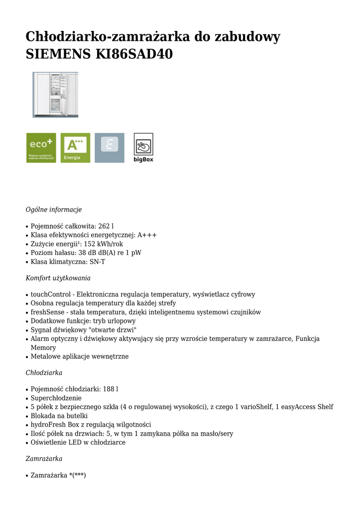 Chłodziarko-zamrażarka do zabudowy SIEMENS KI86SAD40 Ogólne informacje ● ● ● ● ● Pojemność całkowita: 262 l Klasa efektywności energetycznej: A+++ Zużycie energii¹: 152 kWh/rok Poziom hałasu: 38 dB dB(A) re 1 pW Klasa klimatyczna: SN-T Komfort użytkowania ● ● ● ● ● ● ● touchControl - Elektroniczna regulacja temperatury, wyświetlacz cyfrowy Osobna regulacja temperatury dla każdej strefy freshSense - stała temperatura, dzięki inteligentnemu systemowi czujników Dodatkowe funkcje: tryb urlopowy Sygnał dźwiękowy "otwarte drzwi" Alarm optyczny i dźwiękowy aktywujący się przy wzroście temperatury w zamrażarce, Funkcja Memory Metalowe aplikacje wewnętrzne Chłodziarka ● ● ● ● ● ● ● Pojemność chłodziarki: 188 l Superchłodzenie 5 półek z bezpiecznego szkła (4 o regulowanej wysokości), z czego 1 varioShelf, 1 easyAccess Shelf Blokada na butelki hydroFresh Box z regulacją wilgotności Ilość półek na drzwiach: 5, w tym 1 zamykana półka na masło/sery Oświetlenie LED w chłodziarce Zamrażarka ● Zamrażarka *(***) ● ● ● ● ● ● ● ● Pojemność: 74 l Supermrożenie Ilość szuflad: 3, w tym 1 bigBox varioZone - wyjmowane półki i szuflady dla uzyskania większej przestrzeni Kalendarz zamrażania żywności Technologia LowFrost Zdolność zamrażania: 10 kg w ciągu 24h Zdolność przech. w przypadku awarii: 33h Parametry techniczne ● ● ● ● ● Drzwi zamocowane prawostronnie, z możliwością zamiany strony Zawiasy płaskie, Wspomaganie zamykania drzwi softClose Wymiary urządzenia²: W 177,2 cm x S 55,8 cm x G 54,5 cm Wymiary niszy do zabudowy W x S x G: 177,5 cm x 56,0 cm x 55,0 cm Moc przyłączeniowa: 120 W Wyposażenie ● 2 wkłady akumulacyjne zimna, pojemnik na jajka, pojemnik na kostki lodu ¹W oparciu o standardowy, 24-godzinny test ²W celu osiągnięcia podanych wartości zużycia energii, należy zachować minimalny odstęp 3,5 cm między tyłem chłodziarki a ścianą, co należy uwzględnić przy planowaniu wymiarów niszy. Bez zachowania minimalnego odstępu funkcjonalność urządzenia nie zmieni się, zwiększy się nieznacznie zużycie energii KONTAKT BSH Sprzęt Gospodarstwa Domowego