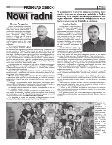 PRZEGLĄD OSIECKI Nowi radni Mirosław Forszpaniak Urodził się w Kobylinie, gdzie spędził dzieciństwo i skończył początkowe klasy szkoły podstawowej. Z rodzicami przeprowadził się do Kąkolewa, gdzie ukończył szkołę podstawową. Następnie zdobył zawód tokarza i wyjechał na 2,5 roku na szkolenie do NRD. Po powrocie do kraju podjął pracę w leszczyńskim Akwawicie, gdzie pracuje do dziś z przerwą na odbycie zasadniczej służby wojskowej. W firmie, z którą związany jest od lat pracował jako mechanik automatyk, a obecnie jest aparatowym urządzeń destylacyjnych. Przez cztery kadencje zasiadał w Radzie Pracowniczej, tam pełnił również funkcję przewodniczącego, przez cztery lata był też przewodniczącym Rady Pracowników. Został wyróżniony i odznaczony przez Ministra Rolnictwa odznaką "Zasłużony dla rolnictwa". Od 1991 r. jest prezesem OSP Akwawit. Na tym polu działalności został wyróżniony odznaką wzorowy strażak. Otrzymał też złoty, srebrny i brązowy medal za zasługi dla pożarnictwa. Przez osiem lat był prezesem Towarzystwa Krzewienia Kultury Fizycznej, za co został wyróżniony złotą odznaką TKKF. A w Kąkolewie znany jest z pasji do piłki nożnej. Był założycielem klubu "Błękitni" Kąkolewo i od początku jego istnienia, czyli od grudnia 2007 r., jest kierownikiem drużyny. Do czasu wyboru na radnego Rady Miejskiej był sekretarzem Zarządu klubu. Wspomina jak z przyjaciółmi pracował w czynie społecznym przy zakładaniu boiska LZS Kąkolewo, jak nawozili i wyrównywali ziemię, jak usypywali wały, które służą za trybuny. Mirosław Forszpaniak jest też członkiem Ochotniczej Straży Pożarnej w Kąkolewie, gdzie doradza w przygotowaniach do zawodów sportowo pożarniczych. Udziela się też w prowadzeniu festynów oraz turniejów sportowych. Prywatnie - szczęśliwy mąż i ojciec dwójki dzieci oraz dziadek półtorarocznej Oliwii. Hobby pana Mirosława jest piłka nożna, żużel i jazda na rowerze. Przejechał już sześć maratonów (po 90 km każdy). Do startu w wyborach namówili go znajomi, którzy wiedzą, że jeśli się w coś angażuje, to całym sercem. - Korzystając z okazji chciałbym podziękować wszystkim, którzy mi zaufali i oddali na mnie głos. Przyznaję, że dla mnie samego wynik wyborów był zaskakująco wysoki. Tym bardziej czuję się zobowiązany, by spełnić oczekiwania wyborców - mówi Mirosław Forszpaniak. Pan Mirosław w radzie jest zastępcą przewodniczącego Komisji Oświaty, Kultury i Zdrowia oraz członkiem Komisji Rewizyjnej. [7] W poprzednim numerze prezentowaliśmy dwie osoby, które po raz pierwszy zasiadają w Radzie Miejskiej. Dziś przybliżamy kolejnych dwóch "nowych" radnych - Mirosława Forszpaniaka z Kąkolewa oraz Jarosława Glapiaka z Łoniewa. Jarosław Glapiak Związany jest z Łoniewem od urodzenia. Tam się urodził, spędził dzieciństwo. Przedszkole, szkołę podstawową i gimnazjum ukończył w Kąkolewie. Następnie w Zespole Szkół Budowlanych w Lesznie zdobył tytuł technika rolnika. Od najmłodszych lat pomagał rodzicom w prowadzeniu gospodarstwa rolnego w Łoniewie. W 2008 r. rodzice przepisali na syna swoją firmę, od siedmiu lat pan Jarosław gospodaruje na swoim. Jarosław Glapiak udziela się w pracy społecznej. Pomaga przy organizacji dożynek, zabaw. Wprawdzie nie jest członkiem Rady Sołeckiej, ale do tej Rady należy tata, więc kiedy tylko trzeba pomocy, to syn chętnie nią służy. Jest też członkiem Ochotniczej Straży Pożarnej w Łoniewie. Hobby pana Jarosława są podróże, lubi podziwiać piękne krajobrazy. Jako rolnik ma możliwość je tworzyć. Kilka lat temu na polu zasiał słoneczniki. Kiedy rośliny zakwitły nie było człowieka, który przejeżdżając obok, nie zwróciłby uwagi na piękny widok dużych żółtych kwiatów na tle wody Jeziora Łoniewskiego. Fotografia uwieczniająca ten widok zdobi także korytarz budynku Urzędu Miasta i Gminy w Osiecznej. Pan Jarek pasjonuje się grą w siatkówkę - lubi oglądać mecze, ale też pograć ze znajomymi. Wystartował w wyborach z powodu rodzinnych przekonań i tradycji. W radzie przed laty zasiadał bowiem dziadek pana Jarosława oraz dwóch wujków. - Spróbowałem swoich sił i się udało - mówi. - Dziękuję zatem wyborcom za oddanie na mnie głosu, dziękuję wszystkim za liczny udział w wyborach, dziękuję ludziom, którzy tworzyli Komitet Wyborczy Jarosława Glapiaka. Jako radny pan Jarosław chciałby równości dla każdej miejscowości, żeby wszyscy mieszkańcy całej gminy, niezależnie od tego na którym krańcu gminy mieszkają, byli traktowani równo. - Myślę, że jest to możliwe, szczególnie wtedy, kiedy my, radni będziemy ze sobą współpracować. Jeśli będziemy zgrani, to możemy osiągnąć wyznaczone cele - mówi. Pan Jarosław Glapiak jest zastępcą przewodniczącego Komisji Rolnictwa i Ochrony Środowiska oraz członkiem Komisji Oświaty, Kultury i Zdrowia. W czasie karnawału w szkołach i przedszkolach odbywały się baliki przebierańców, na których bawili się najmłodsi. Nie inaczej było w przedszkolu w Drzeczkowie. Do wspólnej zabawy z dziećmi dołączyły też mamy.
