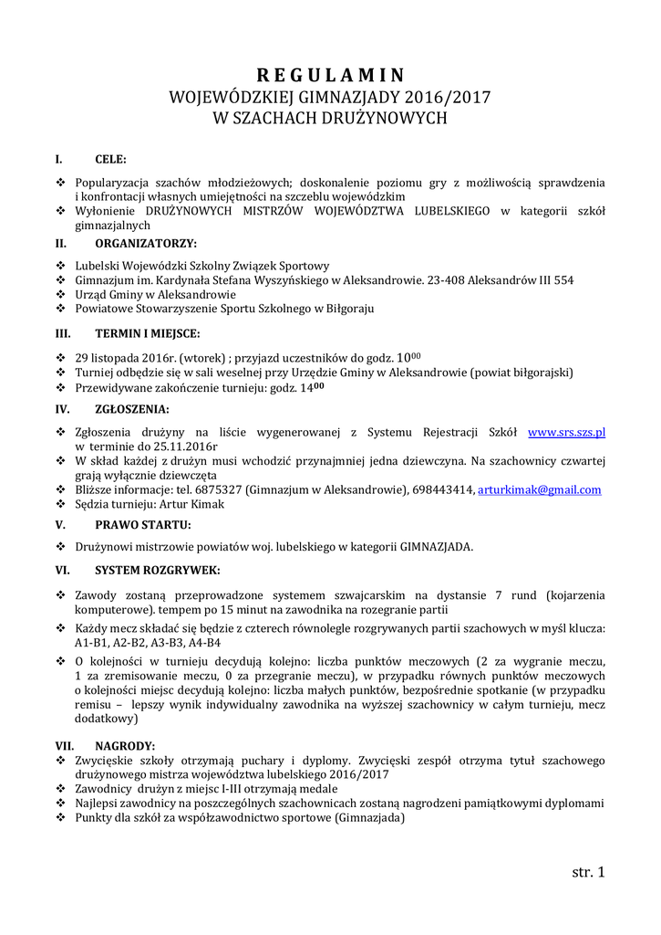 REGULAMIN WOJEWÓDZKIEJ GIMNAZJADY 2016/2017 W SZACHACH DRUŻYNOWYCH I. CELE: Popularyzacja szachów młodzieżowych; doskonalenie poziomu gry z możliwością sprawdzenia i konfrontacji własnych umiejętności na szczeblu wojewódzkim Wyłonienie DRUŻYNOWYCH MISTRZÓW WOJEWÓDZTWA LUBELSKIEGO w kategorii szkół gimnazjalnych II. ORGANIZATORZY: III. Lubelski Wojewódzki Szkolny Związek Sportowy Gimnazjum im. Kardynała Stefana Wyszyńskiego w Aleksandrowie. 23-408 Aleksandrów III 554 Urząd Gminy w Aleksandrowie Powiatowe Stowarzyszenie Sportu Szkolnego w Biłgoraju TERMIN I MIEJSCE: 29 listopada 2016r. (wtorek) ; przyjazd uczestników do godz. 1000 Turniej odbędzie się w sali weselnej przy Urzędzie Gminy w Aleksandrowie (powiat biłgorajski) Przewidywane zakończenie turnieju: godz. 1400 IV. ZGŁOSZENIA: Zgłoszenia drużyny na liście wygenerowanej z Systemu Rejestracji Szkół www.srs.szs.pl w terminie do 25.11.2016r W skład każdej z drużyn musi wchodzić przynajmniej jedna dziewczyna. Na szachownicy czwartej grają wyłącznie dziewczęta Bliższe informacje: tel. 6875327 (Gimnazjum w Aleksandrowie), 698443414, [email protected] Sędzia turnieju: Artur Kimak V. PRAWO STARTU: Drużynowi mistrzowie powiatów woj. lubelskiego w kategorii GIMNAZJADA. VI. SYSTEM ROZGRYWEK: Zawody zostaną przeprowadzone systemem szwajcarskim na dystansie 7 rund (kojarzenia komputerowe). tempem po 15 minut na zawodnika na rozegranie partii Każdy mecz składać się będzie z czterech równolegle rozgrywanych partii szachowych w myśl klucza: A1-B1, A2-B2, A3-B3, A4-B4 O kolejności w turnieju decydują kolejno: liczba punktów meczowych (2 za wygranie meczu, 1 za zremisowanie meczu, 0 za przegranie meczu), w przypadku równych punktów meczowych o kolejności miejsc decydują kolejno: liczba małych punktów, bezpośrednie spotkanie (w przypadku remisu – lepszy wynik indywidualny zawodnika na wyższej szachownicy w całym turnieju, mecz dodatkowy) VII. NAGRODY: Zwycięskie szkoły otrzymają puchary i dyplomy. Zwycięski zespół otrzyma tytuł szachowego drużynowego mistrza województwa lubelskiego 2016/2017 Zawodnicy drużyn z miejsc I-III otrzymają medale Najlepsi zawodnicy na poszczególnych szachownicach zostaną nagrodzeni pamiątkowymi dyplomami Punkty dla szkół za współzawodnictwo sportowe (Gimnazjada) str. 1 VIII. POSTANOWIENIA KOŃCOWE: W sprawach innych decyduje organizator Ostateczna interpretacja regulaminu należy do sędziów i organizatorów Szczegółowe wyniki turnieju opublikowane zostaną na www.chessarbiter.com/turnieje/2016/tdr_5025/ Wyciąg z ogólnopolskiego regulaminu SZS w dyscyplinie „SZACHY DRUŻYNOWE” na rok szkolny 2016/2017: Szkoły przystępujące do współzawodnictwa muszą się zarejestrować przez system rejestracji szkół www.srs.szs.pl zgodnie z kalendarzem wojewódzkim nie później niż do 30 września 2016r Uczestnictwo: 1. Drużynę stanowią uczniowie jednej szkoły gimnazjalnej urodzeni w 2001 i młodsi 2. Drużyna składa się z 4 osób: - I szachownica - chłopiec lub dziewczyna - II szachownica chłopiec lub dziewczyna - III szachownica - chłopiec lub dziewczyna - IV szachownica dziewczyna, 3. Skład i kolejność zawodników w drużynie nie może ulec zmianie w trakcie rozgrywek 4. Na szachownicy chłopca może zostać zgłoszona dziewczyna 5. Skład drużyny obowiązuje przez cały turniej 6. W zawodach obowiązują przepisy FIDE i PZSzach 7. Do ostatecznej interpretacji niniejszego regulaminu upoważniony jest sędzia główny, którego decyzje są ostateczne 8. Zaleca się wprowadzenie na każdym etapie rozgrywek kojarzenia komputerowego systemem ChessArbiter Program zawodów: 1. Zawody przeprowadzone są w formie drużynowej 2. Zaleca się prowadzenie zawodów systemem szwajcarskim kontrolowanym na dystansie 7 rund (w przypadku rozgrywek wojewódzkich) i 11 rund (w przypadku rozgrywek ogólnopolskich); 3. Tempo gry, w przypadku posiadania zegarów elektronicznych 10 min + 5 sek na posunięcie w przypadku rozgrywek wojewódzkich i 20 minut + 10 sek. na posunięcie w przypadku finału ogólnopolskiego. W przypadku nie posiadania zegarów elektronicznych 10-20 min. na partię dla zawodnika w rozgrywkach wojewódzkich. Punktacja O miejscu drużyny decyduje w kolejności: - punkty duże (meczowe 2, 1, 0) - suma punktów zdobytych przez zawodników (wygrana – 1 pkt; remis – 0,5 pkt, przegrana – 0 pkt). - wynik bezpośredniego spotkania, - lepszy wynik na pierwszej, ewentualnie kolejnych szachownicach, - dodatkowy mecz po wyczerpaniu w/w kryteriów” str. 2