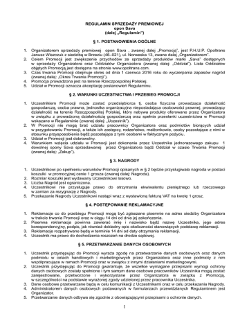 REGULAMIN SPRZEDAŻY PREMIOWEJ opon Sava (dalej „Regulamin”) § 1. POSTANOWIENIA OGÓLNE 1. Organizatorem sprzedaży premiowej opon Sava , zwanej dalej „Promocją”, jest P.H.U.P. Opoltrans Janusz Wiszczuk z siedzibą w Brzeziu (46–021), ul. Norweska 13, zwane dalej „Organizatorem”. 2. Celem Promocji jest zwiększenie przychodów ze sprzedaży produktów marki „Sava” dostępnych w sprzedaży Organizatora oraz Oddziałów Organizatora (zwanej dalej: „Oddział”). Lista Oddziałów objętych Promocją jest dostępna na stronie www.opoltrans.com. 3. Czas trwania Promocji obejmuje okres od dnia 1 czerwca 2016 roku do wyczerpania zapasów nagród (zwanej dalej: „Okres Trwania Promocji”). 4. Promocja prowadzona jest na terenie Rzeczpospolitej Polskiej. 5. Udział w Promocji oznacza akceptację postanowień Regulaminu. § 2. WARUNKI UCZESTNICTWA I PRZEBIEG PROMOCJI 1. Uczestnikiem Promocji może zostać przedsiębiorca tj. osoba fizyczna prowadząca działalność gospodarczą, osoba prawna, jednostka organizacyjna nieposiadająca osobowości prawnej, prowadzący działalność na terenie Rzeczpospolitej Polskiej, który nabywa produkty oferowane przez Organizatora w związku z prowadzoną działalnością gospodarczą oraz spełnia przesłanki uczestnictwa w Promocji wskazane w Regulaminie (zwanej dalej: „Uczestnik”). 2. W Promocji nie mogą brać udziału pracownicy Organizatora oraz podmiotów biorących udział w przygotowaniu Promocji, a także ich zastępcy, rodzeństwo, małżonkowie, osoby pozostające z nimi w stosunku przysposobienia bądź pozostające z tymi osobami w faktycznym pożyciu. 3. Udział w Promocji jest dobrowolny. 4. Warunkiem wzięcia udziału w Promocji jest dokonanie przez Uczestnika jednorazowego zakupu 1 dowolnej opony Sava sprzedawanej przez Organizatora bądź Oddział w czasie Trwania Promocji (zwanej dalej: „Zakup”). § 3. NAGRODY 1. Uczestnikowi po spełnieniu warunków Promocji opisanych w § 2 będzie przysługiwała nagroda w postaci koszulki w promocyjnej cenie 1 grosza (zwanej dalej: Nagroda). 2. Rozmiar koszulki jest wydawany Uczestnikowi losowo. 3. Liczba Nagród jest ograniczona. 4. Uczestnikowi nie przysługuje prawo do otrzymania ekwiwalentu pieniężnego lub rzeczowego w zamian za rezygnację z Nagrody. 5. Przekazanie Nagrody Uczestnikowi nastąpi wraz z wystawioną fakturą VAT na kwotę 1 grosz. § 4. POSTĘPOWANIE REKLAMACYJNE 1. Reklamacje co do przebiegu Promocji mogą być zgłaszane pisemnie na adres siedziby Organizatora w trakcie trwania Promocji oraz w ciągu 14 dni od dnia jej zakończenia. 2. Pisemna reklamacja powinna zawierać imię i nazwisko bądź nazwę Uczestnika, jego adres korespondencyjny, podpis, jak również dokładny opis okoliczności stanowiących podstawę reklamacji. 3. Reklamacje rozpatrywane będą w terminie 14 dni od daty otrzymania reklamacji. 4. Uczestnik ma prawo do dochodzenia roszczeń na drodze sądowej. § 5. PRZETWARZANIE DANYCH OSOBOWYCH 1. Uczestnik przystępując do Promocji wyraża zgodę na przetwarzanie danych osobowych oraz danych podmiotu w celach handlowych i marketingowych przez Organizatora oraz inne podmioty z nim współpracujące w ramach Promocji oraz w związku z innymi działaniami marketingowymi. 2. Uczestnik przystępując do Promocji gwarantuje, że wszelkie wymagane przepisami wymogi ochrony danych osobowych zostały spełnione i tym samym dane osobowe pracowników Uczestnika mogą zostać zarejestrowane, przetworzone i wykorzystane przez Organizatora w związku z Promocją, w szczególności na podstawie wyrażonej zgody udzielonej przez pracownika Uczestnika. 3. Dane osobowe przetwarzane będą w celu komunikacji z Uczestnikami oraz w celu przekazania Nagrody. 4. Administratorem danych osobowych podawanych w formularzach przewidzianych Regulaminem jest Organizator. 5. Przetwarzanie danych odbywa się zgodnie z obowiązującymi przepisami o ochronie danych. 1 6. Dane osobowe i dane podmiotów podawane są przez Uczestników dobrowolnie. 7. Każdy Uczestnik ma prawo dostępu do treści swoich danych oraz ich poprawiania. 8. W przypadku zmiany lub konieczności uzupełnienia lub poprawienia danych osobowych Uczestnik uprawniony jest do ich aktualizacji. W tym celu należy wysłać wiadomość na adres siedziby Organizatora. 9. Każdy ma prawo do wycofania zgody na przetwarzanie swoich danych osobowych przez Organizatora. Wycofanie zgody jest jednoznaczne z wycofaniem swojego udziału w Promocji. Wycofanie zgody wymaga formy pisemnej i przesłania na adres Organizatora z dopiskiem na kopercie „dane osobowe”. § 6. POSTANOWIENIA KOŃCOWE 1. W kwestiach nieuregulowanych niniejszym regulaminem stosuje się przepisy kodeksu cywilnego. 2. Wszelkie informacje o Promocji dostępne w materiałach reklamowych mają charakter informacyjny. 3. Niniejszy Regulamin dostępny jest w siedzibie Organizatora, w Oddziałach oraz na stronie internetowej www.opoltrans.com. 4. Organizator nie ponosi odpowiedzialności za niemożność skorzystania z prawa do Nagrody z przyczyn leżących po stronie Uczestnika. 5. Uczestnik odpowiada za prawidłowe opodatkowanie Nagrody. 6. Sądem właściwym do rozpatrywania wszelkich sporów wynikłych w związku z Promocją jest sąd właściwy na podstawie przepisów Kodeksu postępowania cywilnego. 7. Regulamin Promocji wchodzi w życie z dniem 1 czerwca 2016 r. 2