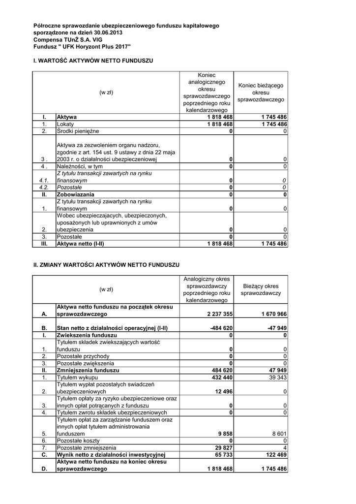 Półroczne sprawozdanie ubezpieczeniowego funduszu kapitałowego sporządzone na dzień 30.06.2013 Compensa TUnŻ S.A. VIG Fundusz " UFK Horyzont Plus 2017" I. WARTOŚĆ AKTYWÓW NETTO FUNDUSZU (w zł) I. 1. 2. 3. 4. 4.1. 4.2. II. 1. 2. 3. III. Aktywa Lokaty Środki pieniężne Aktywa za zezwoleniem organu nadzoru, zgodnie z art. 154 ust. 9 ustawy z dnia 22 maja 2003 r. o działalności ubezpieczeniowej Należności, w tym Z tytułu transakcji zawartych na rynku finansowym Pozostałe Zobowiazania Z tytułu transakcji zawartych na rynku finansowym Wobec ubezpieczajacych, ubezpieczonych, uposażonych lub uprawnionych z umów ubezpieczenia Pozostałe Aktywa netto (I-II) Koniec analogicznego Koniec bieżącego okresu okresu sprawozdawczego sprawozdawczego poprzedniego roku kalendarzowego 1 818 468 1 745 486 1 818 468 1 745 486 0 0 0 0 0 0 0 0 0 0 0 0 0 0 0 0 1 818 468 0 0 1 745 486 II. ZMIANY WARTOŚCI AKTYWÓW NETTO FUNDUSZU (w zł) A. B. I. 1. 2. 3. II. 1. 2. 3. 4. 5. 6. 7. C. D. Aktywa netto funduszu na początek okresu sprawozdawczego Stan netto z działalności operacyjnej (I-II) Zwiekszenia funduszu Tytułem składek zwiekszających wartość funduszu Pozostałe przychody Pozostałe zwiększenia Zmniejszenia funduszu Tytułem wykupu Tytułem wypłat pozostałych swiadczeń ubezpieczeniowych Tytułem opłaty za ryzyko ubezpieczeniowe oraz innych opłat potrącanych z funduszu Tytułem zwrotu składek ubezpieczeniowych Tytułem opłat za zarządzanie funduszem oraz innych opłat tytułem administrowania funduszem Pozostałe koszty Pozostałe zmniejszenia Wynik netto z działalności inwestycyjnej Aktywa netto funduszu na koniec okresu sprawozdawczego Analogiczny okres sprawozdawczy poprzedniego roku kalendarzowego Bieżący okres sprawozdawczy 2 237 355 1 670 966 -484 620 0 -47 949 0 0 0 0 484 620 432 440 0 0 0 47 949 39 343 12 496 0 0 0 0 0 9 858 0 29 827 65 733 8 601 0 4 122 469 1 818 468 1 745 486 III. LICZBA I WARTOŚĆ JEDNOSTEK ROZRACHUNKOWYCH Pozycja I. 1. 2. II. 1. 2. 3. 4. Liczba jednostek rozrachunkowych: na poczatek okresu sprawozdawczego na koniec okresu sprawozdawczego Wartość jednostki rozrachunkowej: na poczatek okresu sprawozdawczego minimalna wartość jednostki rozrachunkowejw okresie sprawozdawczym maksymalna wartość jednostki rozrachunkowej w okresie sprawozdawczym na koniec okresu sprawozdawczego Analogiczny okres sprawozdawczy poprzedniego roku kalendarzowego #ARG! 6 259,872 Bieżący okres sprawozdawczy 6 022,687 5 857,771 277,445 258,802 276,261 301,440 290,496 294,485 297,978 IV. ZESTAWIENIE AKTYWÓW NETTO FUNDUSZU Udział w aktywach netto funduszu (w %) 2 3 1 745 486 100,00% Wartość bilansowa (w zł) I. 1. 2. 3. 4. 5. 6. 7. 8. 9. 10. 11. 12. 1 Lokaty (suma 1-12) Papiery wartościowe emitowane , poręczane lub gwarantowane przez Skarb Państwa lub organizacje miedzynarodowe, których członkiem jest Rzeczpospolitam Polska : Obligacje emitowane lub poręczane przez jednostki samorządu terytorialnego lub związki jednostek samorządu terytorialnego Inne dłużne papiery wartościowe o stałej stopie dochodu Akcje Udziały Jednostki uczestnictwa i certyfikaty inwestycyjne w funduszach inwestycyjnych Instrumenty pochodne, o ile służą zmniejszeniu ryzyka związanego z innymi aktywami stanowiącymi pokrycie rezerw technicznoubezpieczeniowych Inne papiery wartościowe o zmiennej kwocie dochodu Pożyczki Nieruchomości Depozyty bankowe Pozostałe lokaty II. Aktywa za zezwoleniem organu nadzoru, zgodnie z art. 154 ust. 9 ustawy z dnia 22 maja 2003 r. o działalności ubezpieczeniowej III. IV. V. VI. 1. 2. 3. Środki pieniężne Należności Zobowiązania Aktywa netto (w tym) krajowe zagraniczne - kraje UE zagraniczne - kraje pozaUE 0 0,00% 0 0,00% 0 0,00% 0 0 0,00% 0,00% 0 0,00% 0 0,00% 1 745 486 100,00% 0 0 0 0 0,00% 0,00% 0,00% 0,00% 0 0,00% 0 0 0 1 745 486 0 1 745 486 0 0,00% 0,00% 0,00% 100,00% 0,00% 100,00% 0,00%
