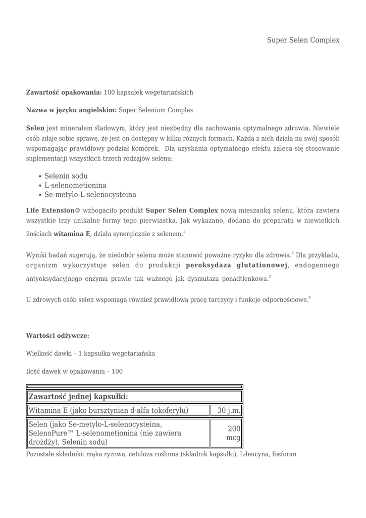 Super Selen Complex Zawartość opakowania: 100 kapsułek wegetariańskich Nazwa w języku angielskim: Super Selenium Complex Selen jest minerałem śladowym, który jest niezbędny dla zachowania optymalnego zdrowia. Niewiele osób zdaje sobie sprawę, że jest on dostępny w kilku różnych formach. Każda z nich działa na swój sposób wspomagając prawidłowy podział komórek. Dla uzyskania optymalnego efektu zaleca się stosowanie suplementacji wszystkich trzech rodzajów selenu: Selenin sodu L-selenometionina Se-metylo-L-selenocysteina Life Extension® wzbogaciło produkt Super Selen Complex nową mieszanką selenu, która zawiera wszystkie trzy unikalne formy tego pierwiastka. Jak wykazano, dodana do preparatu w niewielkich ilościach witamina E, działa synergicznie z selenem.1 Wyniki badań sugerują, że niedobór selenu może stanowić poważne ryzyko dla zdrowia.2 Dla przykładu, organizm wykorzystuje selen do produkcji peroksydaza glutationowej, endogennego antyoksydacyjnego enzymu prawie tak ważnego jak dysmutaza ponadtlenkowa.3 U zdrowych osób selen wspomaga również prawidłową pracę tarczycy i funkcje odpornościowe.4 Wartości odżywcze: Wielkość dawki – 1 kapsułka wegetariańska Ilość dawek w opakowaniu – 100 Zawartość jednej kapsułki: Witamina E (jako bursztynian d-alfa tokoferylu) Selen (jako Se-metylo-L-selenocysteina, SelenoPure™ L-selenometionina (nie zawiera drożdży), Selenin sodu) 30 j.m. 200 mcg Pozostałe składniki: mąka ryżowa, celuloza roślinna (składnik kapsułki), L-leucyna, fosforan Super Selen Complex dwuwapniowy. Każda kapsułka zapewnia: Selen (L-selenometionina) 50 mcg Selen (selenin sodu) 50 mcg Selen (se-metylo-L-selenocysteina) 100 mcg SelenoPure™ jest znakiem towarowym Nutritin 21. Sposób użycia Jeśli lekarz nie zaleci inaczej, 1 kapsułka dziennie, z posiłkiem. Uwaga! Jeśli przyjmujesz leki przeciwzakrzepowe lub przeciwpłytkowe, bądź masz zaburzenia krzepnięcia przed zastosowaniem suplementu diety skonsultuj się z lekarzem. Przechowywać w miejscu niedostępnym dla dzieci. Nie przekraczać zalecanego dziennego spożycia. Nie stosować, jeśli opakowanie zewnętrzne jest otwarte lub uszkodzone. Podczas stosowania jakichkolwiek leków, w ciąży lub laktacji, przed zastosowaniem suplementu diety skonsultuj się z lekarzem. Suplementy diety nie mogą być stosowane, jako substytut (zamiennik) zróżnicowanej diety. Należy pamiętać o zrównoważonym sposobie żywienia i zdrowym trybie życia. Otwórz listę źródeł naukowych 1. Cancer Res. 2003 Oct 15;63(20):6988-95. 2. Klin Onkol. 2011;24(3):171-9. Super Selen Complex Mini Rev Med Chem. 2008 Jun;8(7):657-68. Nutr Rev. 1997 Jul;55(7):277-9. Biofactors. 2000;12:39-43. Thyroid. 2002;12:867-78. J Nutr. 2003;133:1463S-7S. 3. National Institutes of Health. http://ods.od.nih.gov/ factsheets/Selenium-HealthProfessional 4. National Institutes of Health. http://ods.od.nih.gov/ factsheets/Selenium-HealthProfessional