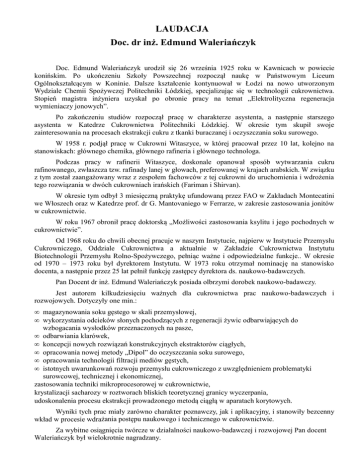 LAUDACJA Doc. dr inż. Edmund Waleriańczyk Doc. Edmund Waleriańczyk urodził się 26 września 1925 roku w Kawnicach w powiecie konińskim. Po ukończeniu Szkoły Powszechnej rozpoczął naukę w Państwowym Liceum Ogólnokształcącym w Koninie. Dalsze kształcenie kontynuował w Łodzi na nowo utworzonym Wydziale Chemii Spożywczej Politechniki Łódzkiej, specjalizując się w technologii cukrownictwa. Stopień magistra inżyniera uzyskał po obronie pracy na temat „Elektrolityczna regeneracja wymieniaczy jonowych”. Po zakończeniu studiów rozpoczął pracę w charakterze asystenta, a następnie starszego asystenta w Katedrze Cukrownictwa Politechniki Łódzkiej. W okresie tym skupił swoje zainteresowania na procesach ekstrakcji cukru z tkanki buraczanej i oczyszczania soku surowego. W 1958 r. podjął pracę w Cukrowni Witaszyce, w której pracował przez 10 lat, kolejno na stanowiskach: głównego chemika, głównego rafineria i głównego technologa. Podczas pracy w rafinerii Witaszyce, doskonale opanował sposób wytwarzania cukru rafinowanego, zwłaszcza tzw. rafinady lanej w głowach, preferowanej w krajach arabskich. W związku z tym został zaangażowany wraz z zespołem fachowców z tej cukrowni do uruchomienia i wdrożenia tego rozwiązania w dwóch cukrowniach irańskich (Fariman i Shirvan). W okresie tym odbył 3 miesięczną praktykę ufundowaną przez FAO w Zakładach Montecatini we Włoszech oraz w Katedrze prof. dr G. Mantovaniego w Ferrarze, w zakresie zastosowania jonitów w cukrownictwie. W roku 1967 obronił pracę doktorską „Możliwości zastosowania ksylitu i jego pochodnych w cukrownictwie”. Od 1968 roku do chwili obecnej pracuje w naszym Instytucie, najpierw w Instytucie Przemysłu Cukrowniczego, Oddziale Cukrownictwa a aktualnie w Zakładzie Cukrownictwa Instytutu Biotechnologii Przemysłu Rolno-Spożywczego, pełniąc ważne i odpowiedzialne funkcje.. W okresie od 1970 – 1973 roku był dyrektorem Instytutu. W 1973 roku otrzymał nominację na stanowisko docenta, a następnie przez 25 lat pełnił funkcję zastępcy dyrektora ds. naukowo-badawczych. Pan Docent dr inż. Edmund Waleriańczyk posiada olbrzymi dorobek naukowo-badawczy. Jest autorem kilkudziesięciu ważnych dla cukrownictwa prac naukowo-badawczych i rozwojowych. Dotyczyły one min.: • magazynowania soku gęstego w skali przemysłowej, • wykorzystania odcieków słonych pochodzących z regeneracji żywic odbarwiających do wzbogacania wysłodków przeznaczonych na pasze, • odbarwiania klarówek, • koncepcji nowych rozwiązań konstrukcyjnych ekstraktorów ciągłych, • opracowania nowej metody „Dipol” do oczyszczania soku surowego, • opracowania technologii filtracji mediów gęstych, • istotnych uwarunkowań rozwoju przemysłu cukrowniczego z uwzględnieniem problematyki surowcowej, technicznej i ekonomicznej, zastosowania techniki mikroprocesorowej w cukrownictwie, krystalizacji sacharozy w roztworach bliskich teoretycznej granicy wyczerpania, udoskonalenia procesu ekstrakcji prowadzonego metodą ciągłą w aparatach korytowych. Wyniki tych prac miały zarówno charakter poznawczy, jak i aplikacyjny, i stanowiły bezcenny wkład w procesie wdrażania postępu naukowego i technicznego w cukrownictwie. Za wybitne osiągnięcia twórcze w działalności naukowo-badawczej i rozwojowej Pan docent Waleriańczyk był wielokrotnie nagradzany. Na szczególne podkreślenie zasługuje w tym zakresie uzyskanie w 1984 r. Nagrody Ministra Nauki, Szkolnictwa Wyższego i Techniki za opracowanie i wdrożenie projektu technologicznego produkcji cukru w cukrowni o przerobie 6000 ton buraków na dobę oraz w 1987 r. Nagrody I stopnia Ministerstwa Rolnictwa, Leśnictwa i Gospodarki Żywnościowej za wprowadzenie do eksploatacji wyników badań pt.: „Pełna automatyzacja odcinkowa Cukrowni Wrocław”. Pan docent. Edmund Waleriańczyk jest autorem lub współautorem 18 patentów i projektów wynalazczych. Dorobek publikacyjny Pana Docenta. Edmunda Waleriańczyka obejmuje ponad 500 pozycji. Jest autorem rozpraw naukowych, monografii, komunikatów naukowych, podręczników i skryptów oraz artykułów w czasopismach fachowych. Szczególnie należy w tym zakresie podkreślić dokonanie syntezy uzyskanych wyników w dziedzinie ekstrakcji cukru z tkanki buraczanej i opublikowanie ich w monografii pt.: „Kompendium praktycznego prowadzenia procesu ekstrakcji w aparacie korytowym”. Publikację tę wydało w 1996 roku Stowarzyszenie Techników Cukrowników. Był powoływany na członka wielu Gremiów, w których rozstrzygały się ważne dla cukrownictwa kwestie naukowe i organizacyjno - techniczne. Przez wiele kadencji był członkiem: Komitetu Technologii i Chemii Żywności Polskiej Akademii Nauk, Rady Naukowej przy Ministrze Przemysłu Spożywczego i Skupu, Rady Naukowo - Technicznej przy Ministrze Rolnictwa i Gospodarki Żywnościowej, Rady Naukowej COBORU, Rady Naukowej Instytutu Inżynierii Chemicznej Politechniki Łódzkiej, Rady Naukowej Instytutu Przemysłu Cukrowniczego i Rady Muzeum Narodowego Rolnictwa i Przemysłu Rolno - Spożywczego w Szreniawie. Z tych zaszczytnych obowiązków wywiązywał się rzetelnie działając pożytecznie zarówno dla dobra gospodarki narodowej jak i bezcennych skarbów kultury materialnej zgromadzonych w Muzeum. Na podkreślenie zasługuje działalność w Stowarzyszeniu Techników Cukrowników i Naczelnej Organizacji Technicznej. W ponad 50 - letniej działalności społecznej w Stowarzyszeniu Techników Cukrowników Pan docent Waleriańczyk przeszedł wszystkie szczeble organizacyjne, począwszy od członka w 1952 roku, aż do Przewodniczącego Zarządu Głównego STC w latach 1972 1982. Za ofiarną i owocną działalność został wyróżniony Honorową Odznaką Stowarzyszenia Techników Cukrowników (1979 r.) oraz dyplomem Honorowego Członka Stowarzyszenia (1988 r.). W okresie lat 1970 - 1990 działał również aktywnie w pracach Rady Gł