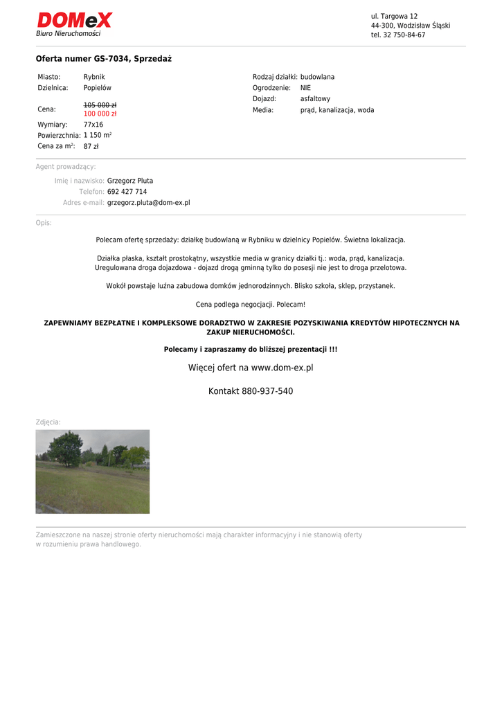 ul. Targowa 12 44-300, Wodzisław Śląski tel. 32 750-84-67 Oferta numer GS-7034, Sprzedaż Miasto: Rybnik Rodzaj działki: budowlana Dzielnica: Popielów Ogrodzenie: NIE 105 000 zł 100 000 zł Dojazd: asfaltowy Cena: Media: prąd, kanalizacja, woda Wymiary: 77x16 Powierzchnia: 1 150 m2 Cena za m2: 87 zł Agent prowadzący: Imię i nazwisko: Grzegorz Pluta Telefon: 692 427 714 Adres e-mail: [email protected] Opis: Polecam ofertę sprzedaży: działkę budowlaną w Rybniku w dzielnicy Popielów. Świetna lokalizacja. Działka płaska, kształt prostokątny, wszystkie media w granicy działki tj.: woda, prąd, kanalizacja. Uregulowana droga dojazdowa - dojazd drogą gminną tylko do posesji nie jest to droga przelotowa. Wokół powstaje luźna zabudowa domków jednorodzinnych. Blisko szkoła, sklep, przystanek. Cena podlega negocjacji. Polecam! ZAPEWNIAMY BEZPŁATNE I KOMPLEKSOWE DORADZTWO W ZAKRESIE POZYSKIWANIA KREDYTÓW HIPOTECZNYCH NA ZAKUP NIERUCHOMOŚCI. Polecamy i zapraszamy do bliższej prezentacji !!! Więcej ofert na www.dom-ex.pl Kontakt 880-937-540 Zdjęcia: Zamieszczone na naszej stronie oferty nieruchomości mają charakter informacyjny i nie stanowią oferty w rozumieniu prawa handlowego.