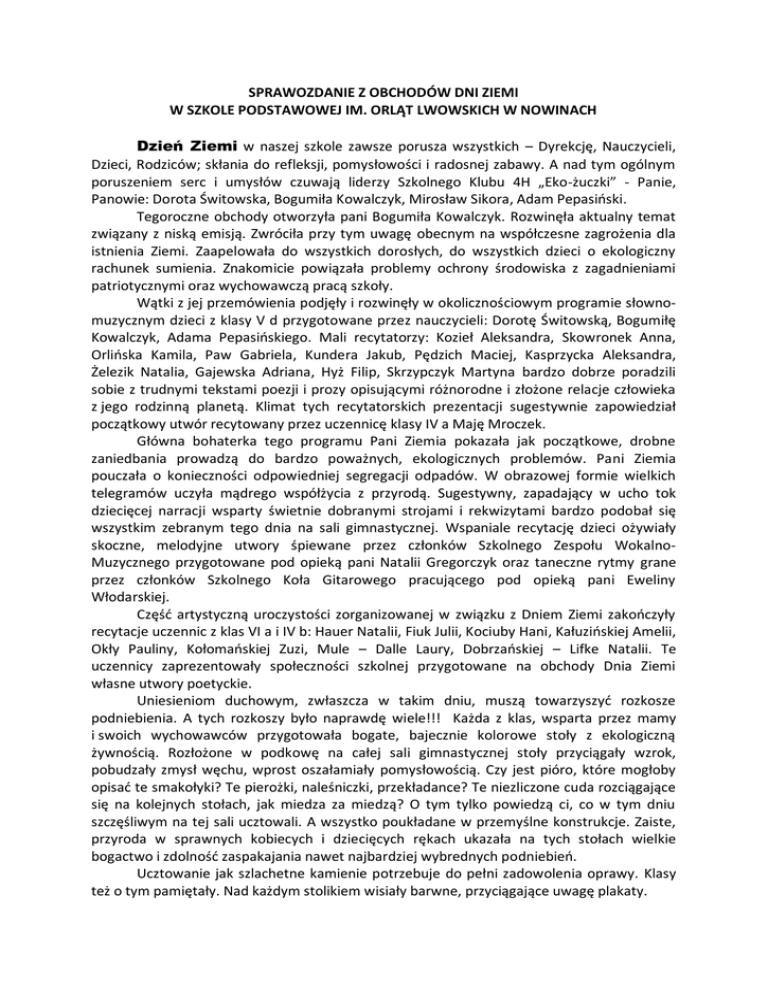 SPRAWOZDANIE Z OBCHODÓW DNI ZIEMI W SZKOLE PODSTAWOWEJ IM. ORLĄT LWOWSKICH W NOWINACH Dzień Ziemi w naszej szkole zawsze porusza wszystkich – Dyrekcję, Nauczycieli, Dzieci, Rodziców; skłania do refleksji, pomysłowości i radosnej zabawy. A nad tym ogólnym poruszeniem serc i umysłów czuwają liderzy Szkolnego Klubu 4H „Eko-żuczki” - Panie, Panowie: Dorota Świtowska, Bogumiła Kowalczyk, Mirosław Sikora, Adam Pepasiński. Tegoroczne obchody otworzyła pani Bogumiła Kowalczyk. Rozwinęła aktualny temat związany z niską emisją. Zwróciła przy tym uwagę obecnym na współczesne zagrożenia dla istnienia Ziemi. Zaapelowała do wszystkich dorosłych, do wszystkich dzieci o ekologiczny rachunek sumienia. Znakomicie powiązała problemy ochrony środowiska z zagadnieniami patriotycznymi oraz wychowawczą pracą szkoły. Wątki z jej przemówienia podjęły i rozwinęły w okolicznościowym programie słownomuzycznym dzieci z klasy V d przygotowane przez nauczycieli: Dorotę Świtowską, Bogumiłę Kowalczyk, Adama Pepasińskiego. Mali recytatorzy: Kozieł Aleksandra, Skowronek Anna, Orlińska Kamila, Paw Gabriela, Kundera Jakub, Pędzich Maciej, Kasprzycka Aleksandra, Żelezik Natalia, Gajewska Adriana, Hyż Filip, Skrzypczyk Martyna bardzo dobrze poradzili sobie z trudnymi tekstami poezji i prozy opisującymi różnorodne i złożone relacje człowieka z jego rodzinną planetą. Klimat tych recytatorskich prezentacji sugestywnie zapowiedział początkowy utwór recytowany przez uczennicę klasy IV a Maję Mroczek. Główna bohaterka tego programu Pani Ziemia pokazała jak początkowe, drobne zaniedbania prowadzą do bardzo poważnych, ekologicznych problemów. Pani Ziemia pouczała o konieczności odpowiedniej segregacji odpadów. W obrazowej formie wielkich telegramów uczyła mądrego współżycia z przyrodą. Sugestywny, zapadający w ucho tok dziecięcej narracji wsparty świetnie dobranymi strojami i rekwizytami bardzo podobał się wszystkim zebranym tego dnia na sali gimnastycznej. Wspaniale recytację dzieci ożywiały skoczne, melodyjne utwory śpiewane przez członków Szkolnego Zespołu WokalnoMuzycznego przygotowane pod opieką pani Natalii Gregorczyk oraz taneczne rytmy grane przez członków Szkolnego Koła Gitarowego pracującego pod opieką pani Eweliny Włodarskiej. Część artystyczną uroczystości zorganizowanej w związku z Dniem Ziemi zakończyły recytacje uczennic z klas VI a i IV b: Hauer Natalii, Fiuk Julii, Kociuby Hani, Kałuzińskiej Amelii, Okły Pauliny, Kołomańskiej Zuzi, Mule – Dalle Laury, Dobrzańskiej – Lifke Natalii. Te uczennicy zaprezentowały społeczności szkolnej przygotowane na obchody Dnia Ziemi własne utwory poetyckie. Uniesieniom duchowym, zwłaszcza w takim dniu, muszą towarzyszyć rozkosze podniebienia. A tych rozkoszy było naprawdę wiele!!! Każda z klas, wsparta przez mamy i swoich wychowawców przygotowała bogate, bajecznie kolorowe stoły z ekologiczną żywnością. Rozłożone w podkowę na całej sali gimnastycznej stoły przyciągały wzrok, pobudzały zmysł węchu, wprost oszałamiały pomysłowością. Czy jest pióro, które mogłoby opisać te smakołyki? Te pierożki, naleśniczki, przekładance? Te niezliczone cuda rozciągające się na kolejnych stołach, jak miedza za miedzą? O tym tylko powiedzą ci, co w tym dniu szczęśliwym na tej sali ucztowali. A wszystko poukładane w przemyślne konstrukcje. Zaiste, przyroda w sprawnych kobiecych i dziecięcych rękach ukazała na tych stołach wielkie bogactwo i zdolność zaspakajania nawet najbardziej wybrednych podniebień. Ucztowanie jak szlachetne kamienie potrzebuje do pełni zadowolenia oprawy. Klasy też o tym pamiętały. Nad każdym stolikiem wisiały barwne, przyciągające uwagę plakaty. Nieodłączną częścią takiej degustacji są oczywiście soki. I był wielki ich wybór na poszczególnych stołach. A oprócz tego … Szkolne Koło PCK pracujące pod opieką pana Mirosława Sikory oraz Klub Wiewiórka przygotowały dodatkowy, wzorcowy stolik z naprawdę baaaaardzo doooobrymi, naprawdę baaaaardzo wieeeeeelkimi sokami. Tu naprawdę było w czym wybierać!!! Od sokowych kompozycji aż się kręciło w głowach!!! Toteż kraniki olbrzymich puszek uginały się pod naciskiem małych i wielkich paluszków. Stoły z ekologiczną żywnością poprzez swoją pomysłowość, barwę, układ świetnie przygotowały wszystkich do następnego punktu programu. Wypełniły go multimedialne prezentacje przygotowane przez zespoły ze wszystkich klas. Uczniowie przygotowywali je pod opieką panów: Mirosława Sikory i Roberta Jedynaka. W kolorowych obrazach, niezwykłych efektach specjalnych, pięknie zestawionych zdjęciach i rysunkach jeszcze raz przewinął się świat ekologicznej troski o naszą planetę –Ziemię. Po takiej porcji zadumy znowu przyszedł czas na wesołą zabawę. Uczniowie rywalizowali w konkursie jedzenia jabłek zawieszonych na długim drążku – oczywiście bez pomocy rąk. Rozpoznawali owoce, warzywa, przyprawy za pomocą zmysłu smaku i węchu – oczywiście oczy mieli zasłonięte szczelnie szalikami. Te zabawy dowcipnie i z humorem poprowadziły panie: Bogumiła Kowalczyk i Dorota Świtowska. Na koniec czekała wszystkich wielka niespodzianka!!! Członek kieleckiego Towarzystwa Badań i Ochrony Przyrody pan Bogusław Sępioł przysłał specjalne dla nas, specjalnie na ten Dzień, Dzień Ziemi ciekawe filmy przyrodnicze powstałe z jego osobistych wędrówek po Ziemi Świętokrzyskiej, po zaczarowanym, jakże uroczym Ponidziu: „Zwierzęta muraw kserotermicznych” oraz „Rośliny muraw kserotermicznych”. I te filmy oglądali nasi uczniowie. Podziwiali niezwykłe fascynacje pana Bogusława Sępioła. Udzieliła im się w całej pełni naprawdę niezwykła aura tych filmowych obrazów pełnych liryzmu i bardzo dużych wzruszeń. Zachwycali się ciekawostkami przyrodniczymi ukazanymi w tych filmach. A kiedy pe