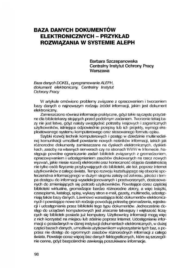 BAZA DANYCH DOKUMENTÓW ELEKTRONICZNYCH - PRZYKŁAD ROZWIĄZANIA W SYSTEMIE ALEPH Barbara Szczepanowska Centralny Instytut Ochrony Pracy Warszawa Baza danych DOKEL, oprogramowanie ALEPH, dokument elektroniczny, Centralny Instytut Ochrony Pracy W artykule omówiono problemy związane z opracowaniem i tworzeniem bazy danych o najnowszym rodzaju źródeł informacji, jakim jest dokument elektroniczny. Zamieszczono również informacje praktyczne, gdyż takie są często przydat ne dla bibliotekarzy stojących przed podobnym zadaniem. Tworzenie takiej ba zy nie jest łatwe, gdyż należy uwzględnić potrzeby krajowych i zagranicznych użytkowników, istniejące odpowiednie przepisy lub ich projekty, wymogi eks ploatowanego systemu komputerowego oraz stosowanego formatu opisu. Szybki rozwój technik komputerowych i postęp w dziedzinie multimedial nej komunikacji umożliwił powstanie nowych nośników informacji, takich jak różnorodne dokumenty zamieszczane na dyskach elektronicznych, dyskiet kach, zasoby na własnych serwerach czy na stronach WWW w Internecie. Na stępuje powolne ograniczanie zadań bibliotek związanych z gromadzeniem, opracowywaniem i udostępnianiem zasobów drukowanych na rzecz nowych wyzwań, jakie niesie rozwój elektroniki oraz konieczność objęcia działalnością nie tylko osób fizycznie przybywających do biblioteki, ale też, poprzez internet użytkowników z całego świata. Tempo rozwoju kształtującego się obecnie spo łeczeństwa informacyjnego w dużym stopniu zależy od zakresu, jakości i tem pa dostępu do informacji wyselekcjonowanych i przetworzonych, dostosowa nych do zmieniających się potrzeb użytkowników. Powstające coraz częściej biblioteki wirtualne, gromadzące bardzo różnorodne zbiory, a więc książki, czasopisma, katalogi, spisy, wykazy stron e-mail, gazety, multimedia, udostęp niają także bazy danych. Lawinowo wzrastająca ilość dokumentów elektronicz nych i powstające nowe ich rodzaje powodują potrzebę gromadzenia, rejestra cji i udostępniania przez biblioteki tego typu dokumentów. Jednocześnie do stęp do urządzeń komputerowych jest znacznie łatwiejszy i większość liczą cych się bibliotek posiada już komputery. Użytkownicy informacji mogą więc z nich korzystać na miejscu lub zdalnie poprzez Internet. Udostępnianie infor macji o posiadanych w danej instytucji dokumentach elektronicznych, w dużej części bazach danych, umożliwia użytkownikom wykorzystanie tych baz, a po przez nie dostęp do ogromnych zasobów różnorodnych informacji z całego świata. Powstaje coraz więcej baz danych faktograficznych, które są szczegól nie cenne, gdyż bezpośrednio zawierają poszukiwane informacje. 98 Liczba dokumentów elektronicznych napływająca do bibliotek stale rośnie. Na przykład Katalog Multimedia and CD-ROM Directory z 1998 roku rejestruje istnienie na świecie ok. 28 tysięcy baz danych, a z każdym rokiem przybywa ich kilka tysięcy. Dlatego staje się niezbędnym opracowywanie wykazów po siadanych baz, które umożliwiają orientację w ich ilości i tematyce. Ponieważ opis bibliograficzny źródła elektronicznego jest czasochłonny a dotychczas nie opublikowano jednolitych i jednoznacznych wytycznych opisu (światowa dyskusja nad opisem nowych typów dokumentów wciąż trwa), nie wiele jeszcze bibliotek w Polsce opracowało takie bazy. Istniejące zaś są zmie niane i ulepszane. Wszyscy jednak podkreślają rosnącą rolę nowych typów do kumentów, potrzebę ich gromadzenia i tworzenia ich wykazów umożliwiających łatwe ich wyszukiwanie i udostępnianie użytkownikom informacji. Ośrodek Infor macji i Dokumentacji Centralnego Instytutu Ochrony Pracy (CIOP) w Warszawie już parę lat temu podjął próbę utworzenia takiej bazy. Historia bazy danych „DOKEL’ W celu podniesienia jakości usług i unowocześnienia prac informacyjnych i bibliotecznych Ośrodka Informacji i Promocji (a obecnie Ośrodka Informacji i Dokumentacji) zakupiono w CIOP komputerowy system ALEPH, opracowany przez firmę ExLibris z Jerozolimy. System ten jest szeroko stosowany przez bi blioteki, archiwa i inne instytucje na całym świecie. również przez kilka instytu cji w Polsce. Korzystając z tego systemu w 1997 roku opracowano założenia i zaczęto opracowywać siedem logicznych baz (KSIĄŻKI, CZASOPISMA, AR TYKUŁY Z CZASOPISM, SPRAWOZDANIA Z WYJAZDÓW, PRACE NAUKOWO BADAWCZE, MATERIAŁY INFORMACYJNE). Jako siódmą bazę utworzono ba zę komputerowych baz danych na dyskach magnetycznych i dyskietkach (ZBIORY KOMPUTEROWE). Była to zapewne jedna z pierwszych baz tego ty pu w Polsce. Format do opisu tej bazy opracowano na zasadach „zdroworoz sądkowych” i wprowadzano do niej na bieżąco opisy wszystkich dokumentów elektronicznych. W bazie zamieszczano dokumenty, które zostały opracowane przez pracowników CIOP dla potrzeb wewnętrznych lub zewnętrznych, które powstały przy współpracy z CIOP z innymi instytucjami lub zostały zakupione, otrzymane w darze czy subskrybowane odpłatnie. Ponieważ CIOP otrzymuje coraz więcej dokumentów elektronicznych i wa ga tego typu dokumentu wzrasta, oraz korzystając z faktu, że zmieniono wer sję systemu z ALEPH 300 na ALEPH 500 oraz że należało przejść na format USMARC (co i tak wymagało zmian w opisie dokumentów) rozpoczęto tworze nie unowocześnionej wersji tej bazy. Ponieważ nie istniał jeszcze w Polsce oficjalny dokument dotyczący opisu dokumentów elektronicznych, zapoznano się z zasadami zawartymi w projek cie normy Pr-Pn-N-01152-13 Opis bibliograficzny. Dokumenty elektroniczne oraz wytycznymi Biblioteki Kongresu związanymi z formatem USMARC. Nale żało również uwzględnić wymogi nowej wersji systemu ALEPH. Zapoznano się również z rozwiązaniami przyjętymi w niektórych bibliotekach prowadzących takie bazy, np. w Bibliotece Jagiellońskiej, Centralnej Bibliotece Statystycznej (GUS), Bibliotece Politechniki Wrocławskiej.