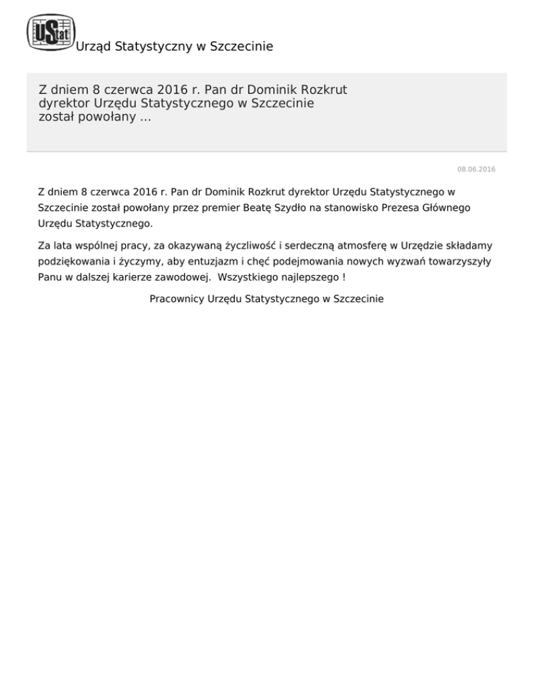 Urząd Statystyczny w Szczecinie Z dniem 8 czerwca 2016 r. Pan dr Dominik Rozkrut dyrektor Urzędu Statystycznego w Szczecinie został powołany ... 08.06.2016 Z dniem 8 czerwca 2016 r. Pan dr Dominik Rozkrut dyrektor Urzędu Statystycznego w Szczecinie został powołany przez premier Beatę Szydło na stanowisko Prezesa Głównego Urzędu Statystycznego. Za lata wspólnej pracy, za okazywaną życzliwość i serdeczną atmosferę w Urzędzie składamy podziękowania i życzymy, aby entuzjazm i chęć podejmowania nowych wyzwań towarzyszyły Panu w dalszej karierze zawodowej. Wszystkiego najlepszego ! Pracownicy Urzędu Statystycznego w Szczecinie