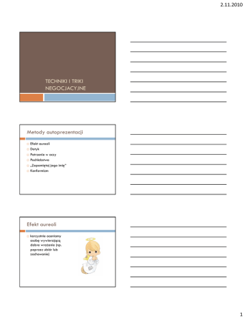 2.11.2010 TECHNIKI I TRIKI NEGOCJACYJNE Metody autoprezentacji Efekt aureoli Dotyk Patrzenie w oczy Pochlebstwa „Zapamiętaj jego imię” Konformizm Efekt aureoli korzystnie oceniamy osobę wywierającą dobre wrażenie (np. poprzez ubiór lub zachowanie) 1 2.11.2010 „Moc dotyku” Prośba poparta lekkim dotykiem ręki lub ramienia jest skuteczniejsza Patrzenie w oczy Patrzenie w oczy zwiększa wiarygodność w negocjacjach Pochlebstwa Pochlebstwa rodzą przychylność drugiej strony (nieumiejętnie używane mogą dawać odwrotny skutek) 2 2.11.2010 „Zapamiętaj jego imię” Używanie imienia w negocjacjach zwiększa sympatię partnera Jureczku! Maciusiu! Konformizm Podobieństwo do partnera zwiększa wiarygodność Warto być ubranym „pół tonu” lepiej od partnera Triki negocjacyjne 3 2.11.2010 Wilk w owczej skórze Pokazanie się jako osoba niezorganizowana i nieporadna, aby uśpić czujność partnera „Na fajtłapę” „Z dobroczyńcy – żebrak” Wykorzystanie reguły wzajemności Schemat 1. 2. 3. Ofiarowanie przysługi Chwila przerwy Prośba o przysługę „Drzwiami w twarz” Schemat 1. 2. 3. Duża prośba Wycofanie Mała prośba Celem jest uzyskanie zgody na małą prośbę Musi być przeprowadzone płynnie Mała prośba nie może być zbyt wielka 4 2.11.2010 Śmieszne pieniądze Przeliczenie ceny na mniejszą wartość poprzez podzielenie jej przez duży przelicznik Np. rozmowa o cenie jednostkowej za ulotkę zamiast za ich pakiet Rosyjski front Przedstawienie dwóch złych opcji, z których jedna jest zdecydowanie gorsza niż druga Zwiększa szansę na akceptację relatywnie lepszej propozycji Nagroda w raju Żądanie ustępstw w negocjacjach w zamian za przyszłą współpracę 5 2.11.2010 Pusty portfel Wyrażenie gotowości zakupu, ale zasłanianie się brakiem środków finansowych Przerzucenie odpowiedzialności za znalezienie rozwiązania na partnera Bezinteresowny kelner Przedstawianie się jako bezinteresowny doradca w celu zdobycia zaufania. Następnie wykorzystywanie swojej pozycji do przekonania partnera do przyjęcia rozwiązań korzystnych dla nas. Stopa w drzwiach Nakłanianie partnera do realizacji kolejnych próśb, które są coraz większe. 6 2.11.2010 Eskalacja zaangażowania Wciąganie partnera w podejmowanie decyzji, związanych z daną sytuacją. Decyzje te angażują zasoby partnera Wykorzystuje regułę konsekwencji Odkładanie na później Odłożenie ważnej spornej kwestii do czasu osiągnięcia zgody w kilku mniej istotnych sprawach Rzut na taśmę Gdy partner jest bliski akceptacji oferty (waha się) dorzucenie jeszcze niewielkiego ale widocznego ustępstwa 7 2.11.2010 „Ale to nie wszystko” Zalewanie partnera dodatkowymi korzyściami zanim podejmie decyzję Mango zakupy Eskalacja żądań Domaganie się realizacji nowych postulatów pod groźbą zerwania rozmów. Ostatnie życzenie Stosowane po osiągnięciu porozumienia. (!) Domaganie się kolejnych drobnych ustępstw 8 2.11.2010 Próbny balon Zadawanie hipotetycznych pytań dotyczących ustępstw z zamiarem odkrycia interesu partnera np. „Co by było gdyby” „Jakie mogłyby być konsekwencje…” Optyk z Brooklynu Zwiększanie żądań jeśli nie napotykają one oporu klienta. „Szkła będą kosztować 90$... …za każde… …plus cena oprawek.” Niska piłka Złożenie interesującej oferty, a następnie gdy partner na nią przystanie „przypadkiem” zmiana jej warunków na gorsze. 9 2.11.2010 Metoda faktów dokonanych. Zmiana warunków kontraktu bez pytania o zdanie drugiej strony. Np. wprowadzenie w umownie korzystnych nienegocjowanych zapisów. Niepełne pełnomocnictwo. Zasłanianie się nieobecną osobą, jako partnerem, od którego również zależą podejmowane decyzje. Np. zgadzamy się na pewne warunki, a następnie zasłaniamy się brakiem zgody szefa. Dobry i zły glina Huśtawka emocjonalna polegająca na łączeniu bodźców pozytywnych i negatywnych. 10 2.11.2010 Metoda imadła Stałe wywieranie presji na partnera z żądaniem kolejnych ustępstw. Np. domaganie się ustępstw już w czasie prezentacji oferty. Jednostronne zobowiązanie Zobowiązanie się przed partnerem do postępowania zgodnie z jakąś regułą, która ostatecznie wywiera na niego presję. Np. odrzucenie kierownicy przy grze w „tchórza”. 11