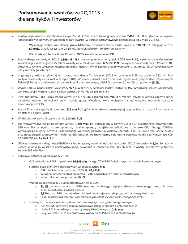 Podsumowanie wyników za 2Q 2015 r. dla analityków i inwestorów Kontynuacja wzrostu przychodów Grupy Polsat, które w 2Q’14 osiągnęły poziom 2.469 mln PLN, głównie w wyniku konsolidacji wyników grupy Metelem za cały kwartał (w okresie porównawczym konsolidacja od 7 maja 2014 r.). Wyłączając wpływ konsolidacji grupy Metelem, przychody Grupy Polsat wyniosły 838 mln zł, osiągając wzrost r/r o 6%, przede wszystkim dzięki wyższym przychodom telekomunikacyjnym Przychody pro‐forma Grupy Polsat w 2Q’15 wzrosły r/r o ponad 2% Koszty Grupy wyniosły w 2Q’15 1.899 mln PLN (po wyłączeniu amortyzacji: 1.506 mln PLN), natomiast z wyłączeniem konsolidacji wyników grupy Metelem wzrosły r/r o 5% do poziomu 605 mln PLN (po wyłączeniu amortyzacji 539 mln PLN), głównie w wyniku wyższych kosztów transmisji danych, wynikających przede wszystkim z przyrostu liczby użytkowników usług mobilnego Internetu. Przychody z reklamy telewizyjnej i sponsoringu Grupy TV Polsat w 2Q’15 wzrosły r/r o 5,5% do poziomu 282 mln PLN (w tym czasie cały rynek rósł w tempie 3,0%). W wyniku niemal dwukrotnie wyższej dynamiki przychodów reklamowych Telewizji Polsat w porównaniu do dynamiki rynku reklamowego, udział Grupy w rynku wzrósł do poziomu 25,4%. Wynik EBITDA Grupy Polsat wynoszący 977 mln PLN przy wysokiej marży EBITDA 39,6%. Wyłączając wpływ konsolidacji wyników grupy Metelem, zysk EBITDA wzrósł o 9,7% r/r, do 306 mln PLN. Zysk operacyjny EBIT Grupy Polsat wzrósł r/r o 47% do poziomu 584 mln PLN między innymi w wyniku zapowiadanej wcześniej ostatecznej alokacji ceny nabycia grupy Metelem, która wpłynęła na jednorazowe obniżenie kosztów amortyzacji w 2Q’15. Koszty finansowe spadły do poziomu 222 mln PLN, głównie w efekcie postępującej optymalizacji struktury finansowania działalności Grupy Polsat. W efekcie zysk netto Grupy wzrósł do 305 mln PLN. Skorygowany LTM FCF po odsetkach wyniósł 1.491 mln PLN, podczas gdy w samym 2Q’15 FCF osiągnął rekordowy poziom 680 mln PLN w wyniku niższej sprzedaży ratalnej sprzętu, przejścia na zaliczkowe rozliczanie CIT, niższego CAPEXu wynikającego między innymi z uzgodnionego wcześniej ponoszenia kosztów roll‐outu sieci LTE800 przez Grupę Midas oraz postępującej sukcesywnie trwałej obniżki odsetek. Podtrzymujemy całoroczne oczekiwania dla skorygowanego FCF na poziomie ok. 1,2 mld PLN. Główny kowenant ‐ dług netto/EBITDA na bazie wyceny nominalnej spadł na koniec 2Q’15 do poziomu 3,0x. Zwracamy uwagę, iż na jego wysokość nadal wpływ mają dokonane w ramach aukcji 800/2600 MHz wpłaty depozytów w łącznej kwocie 209 mln PLN. Kluczowe wskaźniki operacyjne w 2Q’15: Całkowita liczba RGU na poziomie 16,349 mln, z czego 76% RGU świadczonych w modelu kontraktowym Stabilna baza klientów kontraktowych wynosząca 5,990 mln o ARPU na klienta wzrosło r/r o 2,0% do 87,0 PLN o Wskaźnik nasycenia RGU na klienta – 2,07 i pozostaje w trendzie wzrostowym o Wskaźnik churn na poziomie 10,1% Wzrost całkowitej bazy usług kontraktowych r/r o 2,9% o 32,1% dynamiczny wzrost RGU Internetu mobilnego, będący efektem skutecznego nasycania bazy klientów usługami zintegrowanymi o 2,8% wzrost RGU płatnej telewizji dzięki utrzymującemu się popytowi na usługę Multiroom o Lekki spadek RGU telefonii komórkowej jako efekt wysoce konkurencyjnego rynku Stabilny wzrost nasycenia bazy klientów kontraktowych usługami zintegrowanymi: o Już 791 tys. klientów zakupiło dodatkowe usługi w ramach oferty smartDOM o Liczba RGU posiadanych przez tę grupę klientów wynosi 2,41 mln o Program smartDOM ma pozytywny wpływ na ARPU klienta kontraktowego Podsumowanie wyników za 2Q 2015 r. dla analityków i inwestorów Wyniki finansowe Grupy Cyfrowego Polsatu(1) W wyniku nabycia w dniu 7 maja 2014 r. spółki Metelem Holding Company Limited, wyniki finansowe Grupy Cyfrowego Polsatu obejmują wyniki spółki Metelem Holding Company Limited wraz z jej spółkami zależnymi, m.in. operatora telekomunikacyjnego Polkomtel. W związku z powyższym zmieniliśmy prezentację przychodów operacyjnych i kosztów operacyjnych w skróconym skonsolidowanym rachunku zysków i strat. Żadna z wprowadzonych zmian nie wpłynęła na uprzednio prezentowane przez Grupę Cyfrowy Polsat kwoty przychodów, kosztów, zysku netto za okres, EBITDA ani kapitału własnego. Dodatkowo należy zwrócić uwagę, iż w wyniku wspomnianej konsolidacji dane za okres 2Q’14 nie są w pełni porównywalne. NOWA GRUPA w mln PLN 2Q’15 Zmiana r/r Konsensus rynkowy(1) Różnica 1,6% Przychody ze sprzedaży, w tym: 2.469 41% 2.431 - Przychody detaliczne od klientów indywidualnych i biznesowych 1.652 37% n/d n/d - Przychody hurtowe 689 44% n/d - Przychody ze sprzedaży sprzętu 107 94% 21 1.899 - Pozostałe przychody Koszty operacyjne, w tym: STARA GRUPA 2Q’15 Zmiana r/r 838 6% 485 3% n/d 330 9% n/d n/d 14 9% 200% n/d n/d 8 62% 41% n/d n/d 605 5% - Koszty techniczne i rozliczeń międzyoperatorskich - Amortyzacja, utrata wartości i likwidacja - Koszt własny sprzedanego sprzętu 522 81% n/d n/d 101 37% 393 26% n/d n/d 66 1% 292 54% n/d n/d 18 25% - Koszty kontentu 274 5% n/d n/d 267 3% - Koszty dystrybucji, marketingu, obsługi i utrzymania klienta - Wynagrodzenia i świadczenia na rzecz pracowników - Koszty windykacji, odpisów aktualizujących wartość należności i koszt spisanych należności - Pozostałe koszty 193 46% n/d n/d 74 ‐3% 141 30% n/d n/d 46 ‐5% 28 55% n/d n/d 5 ‐55% 56 30% n/d n/d 28 ‐4% EBITDA 977 38% 938 306 10% 39,6% ‐1,0pkt% 38,6% 4,2% 1,0pkt% 36,5% 1,4pkt% 240 13% 180 94% Marża EBITDA EBIT 584 47% 484 Zysk netto 305 130% 230 20,7% 32,6% (1) w oparciu o prognozy: DB, BDM, DM BOŚ, BZ WBK, DM mBanku, Erste, BESI, ING, Ipopema, Pekao Investment Banking S.A., PKO BP, RCB, Trigon, UBS Podsumowanie wyników za 2Q 2015 r. dla analityków i inwestorów Segment usług świadczonych klientom indywidua