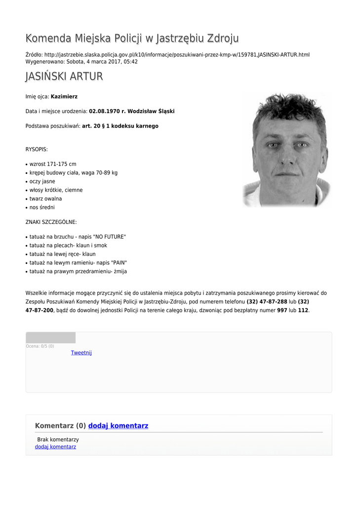 Komenda Miejska Policji w Jastrzębiu Zdroju Źródło: http://jastrzebie.slaska.policja.gov.pl/k10/informacje/poszukiwani-przez-kmp-w/159781,JASINSKI-ARTUR.html Wygenerowano: Sobota, 4 marca 2017, 05:42 JASIŃSKI ARTUR Imię ojca: Kazimierz Data i miejsce urodzenia: 02.08.1970 r. Wodzisław Śląski Podstawa poszukiwań: art. 20 § 1 kodeksu karnego RYSOPIS: ● wzrost 171-175 cm ● krępej budowy ciała, waga 70-89 kg ● oczy jasne ● włosy krótkie, ciemne ● twarz owalna ● nos średni ZNAKI SZCZEGÓLNE: ● tatuaż na brzuchu - napis "NO FUTURE" ● tatuaż na plecach- klaun i smok ● tatuaż na lewej ręce- klaun ● tatuaż na lewym ramieniu- napis "PAIN" ● tatuaż na prawym przedramieniu- żmija Wszelkie informacje mogące przyczynić się do ustalenia miejsca pobytu i zatrzymania poszukiwanego prosimy kierować do Zespołu Poszukiwań Komendy Miejskiej Policji w Jastrzębiu-Zdroju, pod numerem telefonu (32) 47-87-288 lub (32) 47-87-200, bądź do dowolnej jednostki Policji na terenie całego kraju, dzwoniąc pod bezpłatny numer 997 lub 112. Ocena: 0/5 (0) Tweetnij Komentarz (0) dodaj komentarz Brak komentarzy dodaj komentarz