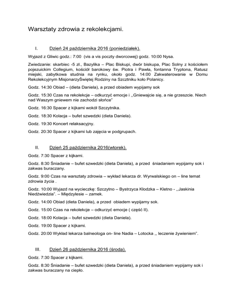 Warsztaty zdrowia z rekolekcjami. I. Dzień 24 października 2016 (poniedziałek). Wyjazd z Gliwic godz.: 7:00 (vis a vis poczty dworcowej) godz. 10:00 Nysa. Zwiedzanie: skarbiec -5 zł., Bazylika – Plac Biskupi, dwór biskupa, Plac Solny z kościołem pojezuickim Collegium, kościół barokowy św. Piotra i Pawła, fontanna Tryptona, Ratusz miejski, zabytkowa studnia na rynku, około godz. 14:00 Zakwaterowanie w Domu Rekolekcyjnym MisjonarzyŚwiętej Rodziny na Szcztniku koło Polanicy. Godz. 14:30 Obiad – (dieta Daniela), a przed obiadem wypijamy sok Godz. 15:30 Czas na rekolekcje – odkurzyć emocje i ,,Gniewajcie się, a nie grzeszcie. Niech nad Waszym gniewem nie zachodzi słońce” Godz. 16:30 Spacer z kijkami wokół Szczytnika. Godz. 18:30 Kolacja – bufet szwedzki (dieta Daniela). Godz. 19:30 Koncert relaksacyjny. Godz. 20:30 Spacer z kijkami lub zajęcia w podgrupach. II. Dzień 25 października 2016(wtorek). Godz. 7:30 Spacer z kijkami. Godz. 8:30 Śniadanie – bufet szwedzki (dieta Daniela), a przed śniadaniem wypijamy sok i zakwas buraczany. Godz. 9:00 Czas na warsztaty zdrowia – wykład lekarza dr. Wyrwalskiego on – line temat zdrowia życia . Godz. 10:00 Wyjazd na wycieczkę: Szczytno – Bystrzyca Kłodzka – Kletno - ,,Jaskinia Niedźwiedzia”. – Międzylesie – zamek. Godz. 14:00 Obiad (dieta Daniela), a przed obiadem wypijamy sok. Godz. 15:00 Czas na rekolekcje – odkurzyć emocje ( część II). Godz. 18:00 Kolacja – bufet szwedzki (dieta Daniela). Godz. 19:00 Spacer z kijkami. Godz. 20:00 Wykład lekarza balneologa on- line Nadia – Lotocka ,, leczenie żywieniem”. III. Dzień 26 października 2016 (środa). Godz. 7:30 Spacer z kijkami. Godz. 8:30 Śniadanie – bufet szwedzki (dieta Daniela), a przed śniadaniem wypijamy sok i zakwas buraczany na ciepło. Godz. 9:30 Warsztaty zdrowia ,, człowiek jat lekarstwem dla człowieka”. Godz. 10:00 Wycieczka do Dusznik: - wytrysk fontanny, - zwiedzanie uzdrowiska, - wysłuchanie koncertu w dworku Szopena, - spotkanie ze śpiewającym księdzem, - zwiedzanie ogrodów japońskich koło Kudowy, - szlak ginących zawodów, - Muzeum Zabawek w Kudowie. Godz. 16:30 Czas na rekolekcje ,,Odkurzyć emocje”. Godz. 18:30 Kolacja – szwedzki bufet (dieta Daniela). Godz. 19:00 Spacer z kijkami. Godz. 21:00 Koncert z relaksacją. IV. Dzień 27 października 2016 (czwartek). Godz. 7:30 Spacer z kijkami. Godz. 8:30 Śniadanie – bufet szwedzki (dieta daniela), a przed śniadaniem wypijamy sok i zakwas buraczany na ciepło. Godz. 9:30 Zwiedzanie Huty Szkła z możliwością zakupów w sklepie firmowym. Godz. 10:00 Wyjazd do Kłodzka: - zwiedzanie starego miasta, - zwiedzanie XVIII – wiecznej monumentalnej twierdzy, Godz. 14:00 Prudnik: - muzeum tkactwa, - Biały Dom, - Wieża Voca, - Klasztor ( miejsce internowania Kardynała Wyszyńskiego) - wieza widokowa. Godz. 16:00 Wyjazd do Gliwic.
