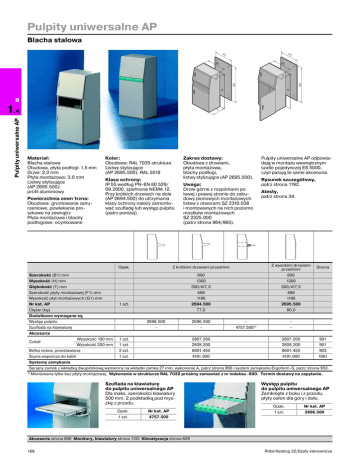 Pulpity uniwersalne AP Blacha stalowa F1 F1 T T H H G1 B1 G1 B1 B Pulpity uniwersalne AP 1.4 T Materiał: Blacha stalowa Obudowa, płyta podłogi: 1,5 mm Drzwi: 2,0 mm Płyta montażowa: 3,0 mm Listwy stylizujące (AP 2695.500): profil aluminiowy Powierzchnia zewn´trzna: Obudowa: gruntowanie zanurzeniowe, powlekanie proszkowe na zewnątrz Płyta montażowa i blachy podłogowe: ocynkowane Kolor: Obudowa: RAL 7035 struktura Listwy stylizujące (AP 2695.500): RAL 5018 Klasa ochrony: IP 55 według PN-EN 60 529/ 09.2000, spełnione NEMA 12. Przy krótkich drzwiach na dole (AP 2694.500) do utrzymania klasy ochrony należy zamontować szufladę lub występ pulpitu (patrz poniżej). Opak. Zakres dostawy: Obudowa z drzwiami, płyta montażowa, blachy podłogi, listwy stylizujące (AP 2695.500). Uwaga: Drzwi górne z rozpórkami po lewej i prawej stronie do zabudowy pionowych montażowych listew z otworami SZ 2310.038 i montowanych na nich poziomo mostków montażowych SZ 2325.000 (patrz strona 964/965). Pulpity uniwersalne AP odpowiadają w montażu wewnętrznym szafie pojedynczej ES 5000, czyli pasują te same akcesoria. Rysunek szczegółowy, patrz strona 1192. Atesty, patrz strona 34. Z krótkimi drzwiami przednimi Z wysokimi drzwiami przednimi 600 600 Szerokość (B1) mm Wysokość (H) mm 1300 1300 Głębokość (T) mm 500/417,5 500/417,5 Szerokość płyty montażowej (F1) mm 499 499 Wysokość płyt montażowych (G1) mm 1196 1196 2694.500 2695.500 77,0 80,0 Nr kat. AP 1 szt. Ciężar (kg) Strona Dodatkowo wymagane są Występ pulpitu Szuflada na klawiaturę 2696.500 2696.500 – – – – 4757.5001) – Akcesoria Wysokość 100 mm 1 szt. 2807.200 2807.200 901 Wysokość 200 mm 1 szt. 2808.200 2808.200 901 Belka nośna, przestawiana 2 szt. 8601.450 8601.450 903 Szyna wsporcza do kabli 1 szt. 4191.000 4191.000 1061 Cokół Systemy zamykania Seryjny zamek z wkładką dwupiórkową wymienny na wkładki zamka 27 mm, wykonanie A, patrz strona 956 i system zamykania Ergoform-S, patrz strona 953. 1) Montowana tylko bez płyty montażowej. Wykonanie w strukturze RAL 7032 prosimy zamawiać z nr indeksu .600. Termin dostawy na zapytanie. Szuflada na klawiaturę do pulpitu uniwersalnego AP Dla maks. szerokości klawiatury 500 mm. Z podkładką pod myszkę z przodu. Opak. Nr kat. AP 1 szt. 4757.500 Występ pulpitu do pulpitu uniwersalnego AP Zamknięte z boku i z przodu, płyty osłon dla góry i dołu. Opak. Nr kat. AP 1 szt. 2696.500 Akcesoria strona 890 Monitory, klawiatury strona 1133 Klimatyzacja strona 628 166 Rittal Katalog 32/Szafy sterownicze