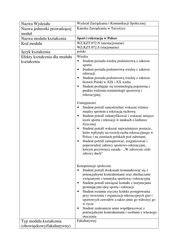 Nazwa Wydziału Nazwa jednostki prowadzącej moduł Nazwa modułu kształcenia Kod modułu Język kształcenia Efekty kształcenia dla modułu kształcenia Wydział Zarządzania i Komunikacji Społecznej Katedra Zarządzania w Turystyce Sport i rekreacja w Polsce WZ.KZT.072.N (niestacjonarne) WZ.KZT.072.S (stacjonarne) polski Wiedza • Student posiada wiedzę podstawową z zakresu sportu • Student posiada podstawową wiedzę z zakresu rekreacji • Student posiada podstawową wiedzę z zakresu historii Polski w XIX i XX wieku • Student posługuje się terminologią poprawną z punktu widzenia terminologii sportowej i rekreacyjnej. Umiejętności • Student potrafi samodzielnie wskazać różnice między sportem a rekreacją ruchową • Student potrafi zidentyfikować i wskazać miejsce teorii sportu i rekreacji w naukach o kulturze fizycznej • Student potrafi wskazać najważniejsze postacie, które wpłynęły na rozwój ruchu rekreacyjnego w Polsce i na ziemiach polskich pod zaborami • Student potrafi zainspirować, zorganizować i poprowadzić zabawy sportowo-rekreacyjne, którym przyświeca zasada - „W zdrowym ciele zdrowy duch” Typ modułu kształcenia (obowiązkowy/fakultatywny) Kompetencje społeczne • Student potrafi doskonale komunikować się z potencjalnymi kontrahentami oraz słuchaczami związanymi z tematyką sportową i rekreacyjną • Student potrafi nawiązać kontakt z instytucjami promującymi ideę sportu i rekreacji • Student rozumie etyczny kodeks postępowania przy tworzeniu i organizacji rekreacyjnych gier i sportowych zawodów a także umie go wdrożyć go w życie • Student znakomicie umie współpracować z potencjalnymi kontrahentami i osobami z własnego otoczenia Fakultatywny Rok studiów II SUM stacjonarne IV dr Radosław Targosz Semestr Imię i nazwisko osoby/osób prowadzących moduł Imię i nazwisko osoby/osób egzaminującej/egzaminujących bądź udzielającej zaliczenia, w przypadku gdy nie jest to osoba prowadząca dany moduł Zajęcia wymagające bezpośredniego udziału Sposób realizacji nauczyciela akademickiego i studentów. Wymagania wstępne i dodatkowe Rodzaj i liczba godzin zajęć dydaktycznych wymagających bezpośredniego udziału nauczyciela akademickiego i studentów, gdy w danym module przewidziane są takie zajęcia Liczba punktów ECTS przypisana modułowi Bilans punktów ECTS Stosowane metody dydaktyczne Metody sprawdzania i kryteria oceny efektów kształcenia uzyskanych przez studentów Konwersatorium: 30 godzin (studia stacjonarne) 20 godzin (studia niestacjonarne) 3 Uczestnictwo w zajęciach konwersatoryjnych: 30 godzin (studia stacjonarne) 20 godzin (studia niestacjonarne) Przygotowanie do zajęć 15 godzin (studia stacjonarne) 25 godzin (studia niestacjonarne) Przygotowanie projektu końcowego: 15 godzin Przygotowanie prezentacji projektu końcowego: 15 godzin Łączny nakład pracy studenta wynosi 75 godzin, co odpowiada 3 punktom ECTS • metody problemowe: o wykład konwersatoryjny o metody aktywizujące: metoda przypadków dyskusja dydaktyczna • metody praktyczne - metoda projektów Studenci są oceniani na podstawie uczestnictwa i aktywności na zajęciach oraz realizacji projektów zespołowych – tworzenie w grupkach 3-4 osobowych i przeprowadzenie wybranej przez siebie gry zespołowej bądź zawodów sportowych – na pozostałej części grupy studentów Forma i warunki zaliczenia modułu, w tym zasady dopuszczenia do egzaminu, zaliczenia, a także forma i warunki zaliczenia poszczególnych zajęć wchodzących w zakres danego modułu Treści modułu kształcenia Wykaz literatury podstawowej i uzupełniającej, obowiązującej do zaliczenia danego modułu Wymiar, zasady i forma odbywania praktyk, w przypadku, gdy program kształcenia przewiduje praktyki Zaliczenie na ocenę. Warunkiem uzyskania zaliczenia konwersatorium jest uczestnictwo i aktywny udział w zajęciach oraz wykonanie i zaliczenie krótkiej analizy tematycznej związanej z treścią przedmiotu przedstawiając ją na forum: Aktywność na zajęciach 50% Projekt 50% Warunkiem uzyskania zaliczenia jest również pozytywna ocena z testu końcowego. • wprowadzenie do zagadnień z historii sportu i rekreacji • wprowadzenie do zagadnień z komunikacji społecznej • przedstawienie pionierów polskiej myśli rekreacyjnej i sportowej • Igrzyska Olimpijskie – geneza i rozwój • wprowadzenie do teorii sportu i rekreacji • przepisy wybranych dyscyplin sportowych Literatura podstawowa: 1. Dudek Dobiesław, Materiały pomocnicze do ćwiczeń z historii rekreacji ruchowej, Proksenia, Kraków 2005 2. Ambroży Tadeusz, Wprowadzenie do teorii sportu, Bielsko-Biała 2007 3. Zdebska Halina, Istota i wartości zespołowych gier sportowych, AWF Kraków 2008 Literatura uzupełniająca: 1. Targosz Radosław, Mieczysław Orłowicz 1881-1959 propagator turystyki masowej i sportu, WSB Poznań-Chorzów 2008 2. Grzywacz Renata (pod red.) Turystyka i rekreacja szansą rozwoju aktywności społecznej, Rzeszów 2008 3. Ustawa o Sporcie – tekst jednolity