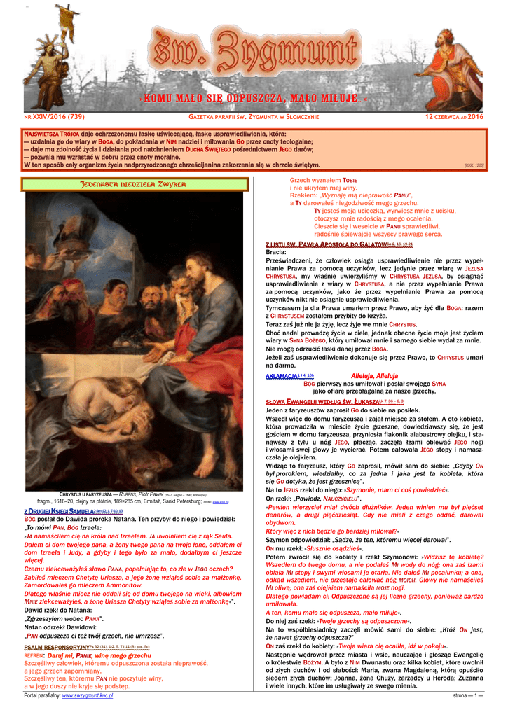 »KOMU MAŁO SIĘ ODPUSZCZA, MAŁO MIŁUJE…« NR XXIV/2016 (739) GAZETKA PARAFII ŚW. ZYGMUNTA W SŁOMCZYNIE 12 CZERWCA AD 2016 NAJŚWIĘTSZA TRÓJCA daje ochrzczonemu łaskę uświęcającą, łaskę usprawiedliwienia, która: — uzdalnia go do wiary w BOGA, do pokładania w NIM nadziei i miłowania GO przez cnoty teologalne; — daje mu zdolność życia i działania pod natchnieniem DUCHA ŚWIĘTEGO pośrednictwem JEGO darów; — pozwala mu wzrastać w dobru przez cnoty moralne. W ten sposób cały organizm życia nadprzyrodzonego chrześcijanina zakorzenia się w chrzcie świętym. [KKK, 1266] JEDENASTA NIEDZIELA ZWYKŁA Grzech wyznałem TOBIE i nie ukryłem mej winy. Rzekłem: „Wyznaję mą nieprawość PANU”, a TY darowałeś niegodziwość mego grzechu. TY jesteś moją ucieczką, wyrwiesz mnie z ucisku, otoczysz mnie radością z mego ocalenia. Cieszcie się i weselcie w PANU sprawiedliwi, radośnie śpiewajcie wszyscy prawego serca. Z LISTU ŚW. PAWŁA APOSTOŁA DO GALATÓWGa 2, 16. 19-21 Bracia: Przeświadczeni, że człowiek osiąga usprawiedliwienie nie przez wypełnianie Prawa za pomocą uczynków, lecz jedynie przez wiarę w JEZUSA CHRYSTUSA, my właśnie uwierzyliśmy w CHRYSTUSA JEZUSA, by osiągnąć usprawiedliwienie z wiary w CHRYSTUSA, a nie przez wypełnianie Prawa za pomocą uczynków, jako że przez wypełnianie Prawa za pomocą uczynków nikt nie osiągnie usprawiedliwienia. Tymczasem ja dla Prawa umarłem przez Prawo, aby żyć dla BOGA: razem z CHRYSTUSEM zostałem przybity do krzyża. Teraz zaś już nie ja żyję, lecz żyje we mnie CHRYSTUS. Choć nadal prowadzę życie w ciele, jednak obecne życie moje jest życiem wiary w SYNA BOŻEGO, który umiłował mnie i samego siebie wydał za mnie. Nie mogę odrzucić łaski danej przez BOGA. Jeżeli zaś usprawiedliwienie dokonuje się przez Prawo, to CHRYSTUS umarł na darmo. AKLAMACJA1 J 4, 10b Alleluja, Alleluja BÓG pierwszy nas umiłował i posłał swojego SYNA jako ofiarę przebłagalną za nasze grzechy. SŁOWA EWANGELII WEDŁUG ŚW. ŁUKASZAŁk 7, 36 – 8, 3 CHRYSTUS U FARYZEUSZA — RUBENS, Piotr Paweł (1577, Siegen – 1640, Antwerpia) fragm., 1618–20, olejny na płótnie, 189×285 cm, Ermitaż, Sankt Petersburg; źródło: www.wga.hu Z DRUGIEJ KSIĘGI SAMUELA2 Sm 12, 1. 7-10. 13 BÓG posłał do Dawida proroka Natana. Ten przybył do niego i powiedział: „To mówi PAN, BÓG Izraela: »JA namaściłem cię na króla nad Izraelem. JA uwolniłem cię z rąk Saula. Dałem ci dom twojego pana, a żony twego pana na twoje łono, oddałem ci dom Izraela i Judy, a gdyby i tego było za mało, dodałbym ci jeszcze więcej. Czemu zlekceważyłeś słowo PANA, popełniając to, co złe w JEGO oczach? Zabiłeś mieczem Chetytę Uriasza, a jego żonę wziąłeś sobie za małżonkę. Zamordowałeś go mieczem Ammonitów. Dlatego właśnie miecz nie oddali się od domu twojego na wieki, albowiem MNIE zlekceważyłeś, a żonę Uriasza Chetyty wziąłeś sobie za małżonkę«”. Dawid rzekł do Natana: „Zgrzeszyłem wobec PANA”. Natan odrzekł Dawidowi: „PAN odpuszcza ci też twój grzech, nie umrzesz”. PSALM RESPONSORYJNYPs 32 (31), 1-2. 5. 7 i 11 (R.: por. 5c) REFREN: Daruj mi, PANIE, winę mego grzechu Szczęśliwy człowiek, któremu odpuszczona została nieprawość, a jego grzech zapomniany. Szczęśliwy ten, któremu PAN nie poczytuje winy, a w jego duszy nie kryje się podstęp. Portal parafialny: www.swzygmunt.knc.pl Jeden z faryzeuszów zaprosił GO do siebie na posiłek. Wszedł więc do domu faryzeusza i zajął miejsce za stołem. A oto kobieta, która prowadziła w mieście życie grzeszne, dowiedziawszy się, że jest gościem w domu faryzeusza, przyniosła flakonik alabastrowy olejku, i stanąwszy z tyłu u nóg JEGO, płacząc, zaczęła łzami oblewać JEGO nogi i włosami swej głowy je wycierać. Potem całowała JEGO stopy i namaszczała je olejkiem. Widząc to faryzeusz, który GO zaprosił, mówił sam do siebie: „Gdyby ON był prorokiem, wiedziałby, co za jedna i jaka jest ta kobieta, która się GO dotyka, że jest grzesznicą”. Na to JEZUS rzekł do niego: »Szymonie, mam ci coś powiedzieć«. On rzekł: „Powiedz, NAUCZYCIELU”. »Pewien wierzyciel miał dwóch dłużników. Jeden winien mu był pięćset denarów, a drugi pięćdziesiąt. Gdy nie mieli z czego oddać, darował obydwom. Który więc z nich będzie go bardziej miłował?« Szymon odpowiedział: „Sądzę, że ten, któremu więcej darował”. ON mu rzekł: «Słusznie osądziłeś«. Potem zwrócił się do kobiety i rzekł Szymonowi: »Widzisz tę kobietę? Wszedłem do twego domu, a nie podałeś MI wody do nóg; ona zaś łzami oblała MI stopy i swymi włosami je otarła. Nie dałeś MI pocałunku; a ona, odkąd wszedłem, nie przestaje całować nóg MOICH. Głowy nie namaściłeś MI oliwą; ona zaś olejkiem namaściła MOJE nogi. Dlatego powiadam ci: Odpuszczone są jej liczne grzechy, ponieważ bardzo umiłowała. A ten, komu mało się odpuszcza, mało miłuje«. Do niej zaś rzekł: »Twoje grzechy są odpuszczone«. Na to współbiesiadnicy zaczęli mówić sami do siebie: „Któż ON jest, że nawet grzechy odpuszcza?” ON zaś rzekł do kobiety: »Twoja wiara cię ocaliła, idź w pokoju«. Następnie wędrował przez miasta i wsie, nauczając i głosząc Ewangelię o królestwie BOŻYM. A było z NIM Dwunastu oraz kilka kobiet, które uwolnił od złych duchów i od słabości: Maria, zwana Magdaleną, którą opuściło siedem złych duchów; Joanna, żona Chuzy, zarządcy u Heroda; Zuzanna i wiele innych, które im usługiwały ze swego mienia. strona — 1 — N N R X X V NR RX XX XIIIV V///222000111666(((777333999))) INFORMACJE PARAFIALNE 5.VI 5.VI Franciszek Krzysztof FILEC, Warszawa Wiktor ŻAROŃ, Cieciszew JAM JEST ALFA I OMEGA, mówi PAN BÓG, KTÓRY JEST, KTÓRY BYŁ i KTÓRY PRZYCHODZI, WSZECHMOGĄCY Ktokolwiek wiedziałby o przeszkodach w zawarciu małżeństwa p