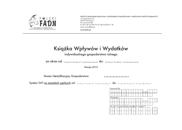 INSTYTUT EKONOMIKI ROLNICTWA i GOSPODARKI ŻYWNOŚCIOWEJ - PAŃSTWOWY INSTYTUT BADAWCZY ul. Świętokrzyska 20 00-950 Warszawa 1 Skr. pocztowa 984 tel. faks: (48 22) 826 93 22, (48 22) 826 61 58 email: [email protected] www.fadn.pl Książka Wpływów i Wydatków indywidualnego gospodarstwa rolnego za okres .od: do: Wersja 2013 Numer Identyfikacyjny Gospodarstwa: . System VAT na zasadach ogólnych od: do: . Pracownik BR: i m i ę n a z w i m i ę n a z w Wczytujący: Nr PBR: i s k o Nr Wczyt: i s k o Nr stron z zauważonymi pomyłkami w kodach: , , , , , , , , , , , , SPIS TABEL TYTUŁ Podręczny wykaz kodów Tabele Wpływów Tabele Wydatków Formularz kontrolny zapisów wpłat i wypłat występujących zazwyczaj w gospodarstwie rolnym Notatki Wersja 2013 stanowi zmodyfikowaną wersję 2012. Modyfikacji dokonał zespół w składzie: dr inż. mgr inż. mgr inż. mgr inż. mgr inż. mgr inż. dr inż. mgr inż. Lech GORAJ (kierownik zespołu) Monika BOCIAN Piotr CZARNOTA Michał FIGURA Katarzyna KAMBO Elżbieta OLEWNIK Dariusz OSUCH Adam SMOLIK UWAGA! Biura rachunkowe oraz Instytut Ekonomiki Rolnictwa i Gospodarki Żywnościowej-PIB zobowiązują się do wykorzystywania uzyskanych danych osobowych i rachunkowych posiadaczy gospodarstw rolnych tylko w zakresie realizowania swoich obowiązków i uprawnień wynikających z ustawy z dnia 29 listopada 2000 r. o zbieraniu i wykorzystywaniu danych rachunkowych z gospodarstw rolnych (Dz.U. z 2001 r. Nr 3 poz. 20 z późniejszymi zmianami). Dane osobowe posiadaczy gospodarstw rolnych są chronione zgodnie z przepisami ustawy z dnia 29 sierpnia 1997 r. o ochronie danych osobowych (tekst jednolity Dz.U. z 2002 r. Nr 101 poz. 926, z późniejszymi zmianami). W przypadku znalezienia się kart lub książek rachunkowych z zawartymi w nich danymi osobowymi w posiadaniu osób do tego nieupoważnionych, prosimy o kontakt z IERiGŻ-PIB w celu ustalenia sposobu ich zwrotu pod numerem telefonu (22) 826 61 58 lub bezpośrednie ich przesłanie do IERiGŻ-PIB na adres IERiGŻ-PIB (Zakład Rachunkowości Rolnej), ul. Świętokrzyska 20, 00-950 Warszawa 1, Skr. Pocztowa 984. Podręczny wykaz kodów do: Wydatków Wpływów Kod Opis Kod Opis WPŁYWY L.p. Miesiąc: Wyszczególnienie Kod Ilość zwierząt (sprzedanych) J.m. Ilość dla np. z faktury kol.6 [kg, dt, l, ha, m3, h, szt.] [szt.] 1 2 3 4 5 6 Wpływy Wartość netto/a [zł] 7 Stawka VAT [gr] [%] 8 Rozliczenie Kod z L.p. w towarach zapisu z miesiąca i usługach /b Otrzymane wpłaty w wartości brutto Wartość brutto [zł] gotówką [gr] 9 [zł] 10 [gr] na konto bankowe [zł] 11 [gr] [zł] 12 /c [gr] 13 14 RAZEM w miesiącu . a/ Bez podatku VAT. Gdy jest znana wart. brutto i stawka VAT nie wyliczać wart. netto. b/ Kody zapisów: 1 - wpływy = wpłatom; 2 - wpływy > wpłat (pozostaje należność); 3 - wpływy = 0 oraz wpłaty > 0 (otrzymana należność z wcześniejszego wpływu); 4 - wpływy = 0 oraz wpłaty > 0 (zaliczka otrzymana na poczet przyszłego wpływu); 5 - wpływy > 0 oraz wpłaty >= 0 i wpływy > wpłat (rozliczenie wcześniej otrzymanej zaliczki). c/ Wypełnić tylko w przypadku kodów 3 lub 5 w kol. 13. W przypadku rozliczeń ze stanu początkowego nr miesiąca = 00. WYDATKI L.p. Miesiąc: Wyszczególnienie / d Kod Ilość zwierząt (zakupionych) J.m. Ilość dla np. z faktury kol.6 [kg, dt, l, ha, m3, h, szt.] [szt.] 1 2 3 4 5 6 Wydatki Wartość netto/a [zł] Stawka VAT [gr] 7 [%] 8 Rozliczenie Kod z L.p. w towarach zapisu z miesiąca i usługach /b Dokonane wypłaty w wartości brutto Wartość brutto [zł] 9 gotówką [gr] [zł] 10 [gr] z konta bankowego [zł] 11 [gr] [zł] 12 /c [gr] 13 14 RAZEM w miesiącu . a/ Bez podatku VAT. Gdy jest znana wart.brutto i stawka VAT nie wyliczać wart. netto. b/ Kody zapisów: 1 - wydatki = wypłatom; 2 - wydatki > wypłat (pozostaje zobowiązanie); 3 - wydatki = 0 oraz wypłaty > 0 (spłata zobowiązania z wcześniejszego wydatku); 4 - wydatki = 0 oraz wypłaty > 0 (zaliczka wpłacona na poczet przyszłego wydatku); 5 - wydatki > 0 oraz wypłaty >= 0 i wydatki > wypłat (rozliczenie wcześniej wpłaconej zaliczki). c/ Wypełnić tylko w przypadku kodów 3 lub 5 w kol. 13. W przypadku rozliczeń ze stanu początkowego nr miesiąca = 00. d/ W przypadku rzeczowych środków trwałych oraz WNiP wpisać przewidywaną liczbę lat użytkowania i rok oddania środka trwałego do eksploatacji, przy pojazdach także charakterystykę [moc, pojemność, ładowność], a przy nasadzeniach leśnych wiek drzew oraz stopień zadrzewienia. W przypadku nawozów mineralnych wpisać zawartość procentową NPK [N, P2O5, K2O]. FORMULARZ KONTROLNY ZAPISÓW WPŁAT i WYPŁAT WYSTĘPUJĄCYCH ZAZWYCZAJ w GOSPODARSTWIE ROLNYM / a Wyszczególnienie 01 02 03 04 05 WPŁATY mleko WYPŁATY Podatki: rolny drogowy Ubezpieczenia: majątkowe odpowiedzialności cywilnej komunikacyjne Opłaty za: energię elektryczną zimną wodę gaz opałowy przewodowy telefon a/ Przewidywane zaszłości, w określonych miesiącach, oznacz „O“ na początku roku, a zrealizowane oznacz „X“. Miesiące 06 07 Notatki: 08 09 10 11 12 NOTATKI Formularz poprawek Nr str. Miesiąc L.p. Kod Opis Potwierdzenie wczytania Data odesłania poprawki poprawki do wczytania 4