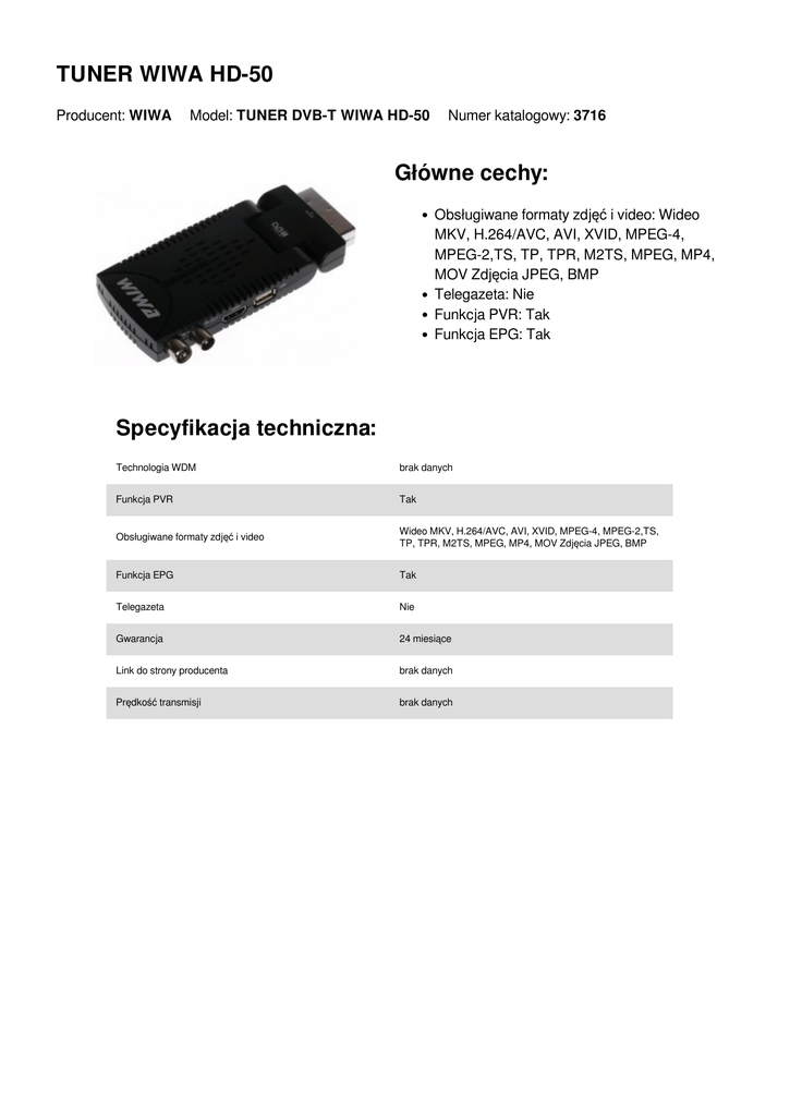 TUNER WIWA HD-50 Główne cechy: Specyfikacja techniczna