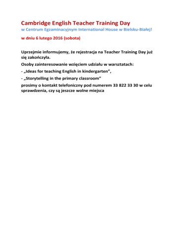 Cambridge English Teacher Training Day w Centrum Egzaminacyjnym International House w Bielsku-Białej! w dniu 6 lutego 2016 (sobota) Uprzejmie informujemy, że rejestracja na Teacher Training Day już się zakończyła. Osoby zainteresowanie wzięciem udziału w warsztatach: - „Ideas for teaching English in kindergarten”, - „Storytelling in the primary classroom” prosimy o kontakt telefoniczny pod numerem 33 822 33 30 w celu sprawdzenia, czy są jeszcze wolne miejsca
