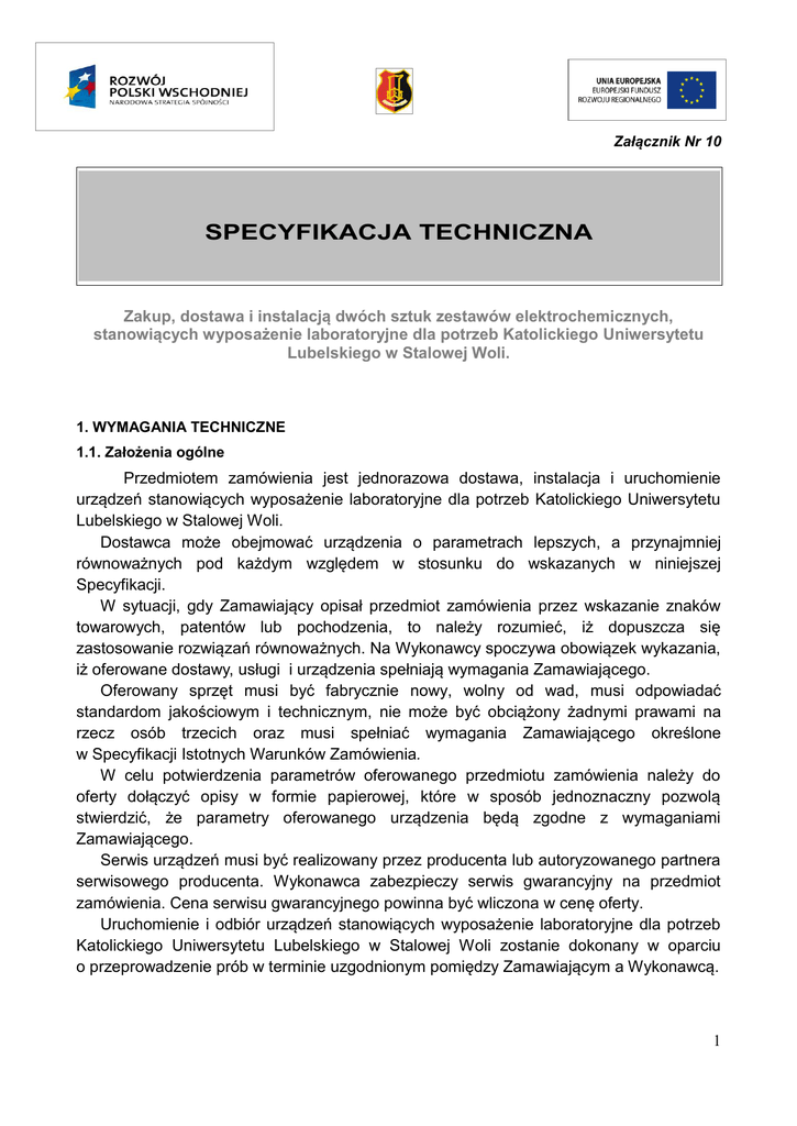 Załącznik Nr 10 SPECYFIKACJA TECHNICZNA Zakup, dostawa i instalacją dwóch sztuk zestawów elektrochemicznych, stanowiących wyposażenie laboratoryjne dla potrzeb Katolickiego Uniwersytetu Lubelskiego w Stalowej Woli. 1. WYMAGANIA TECHNICZNE 1.1. Założenia ogólne Przedmiotem zamówienia jest jednorazowa dostawa, instalacja i uruchomienie urządzeń stanowiących wyposażenie laboratoryjne dla potrzeb Katolickiego Uniwersytetu Lubelskiego w Stalowej Woli. Dostawca może obejmować urządzenia o parametrach lepszych, a przynajmniej równoważnych pod każdym względem w stosunku do wskazanych w niniejszej Specyfikacji. W sytuacji, gdy Zamawiający opisał przedmiot zamówienia przez wskazanie znaków towarowych, patentów lub pochodzenia, to należy rozumieć, iż dopuszcza się zastosowanie rozwiązań równoważnych. Na Wykonawcy spoczywa obowiązek wykazania, iż oferowane dostawy, usługi i urządzenia spełniają wymagania Zamawiającego. Oferowany sprzęt musi być fabrycznie nowy, wolny od wad, musi odpowiadać standardom jakościowym i technicznym, nie może być obciążony żadnymi prawami na rzecz osób trzecich oraz musi spełniać wymagania Zamawiającego określone w Specyfikacji Istotnych Warunków Zamówienia. W celu potwierdzenia parametrów oferowanego przedmiotu zamówienia należy do oferty dołączyć opisy w formie papierowej, które w sposób jednoznaczny pozwolą stwierdzić, że parametry oferowanego urządzenia będą zgodne z wymaganiami Zamawiającego. Serwis urządzeń musi być realizowany przez producenta lub autoryzowanego partnera serwisowego producenta. Wykonawca zabezpieczy serwis gwarancyjny na przedmiot zamówienia. Cena serwisu gwarancyjnego powinna być wliczona w cenę oferty. Uruchomienie i odbiór urządzeń stanowiących wyposażenie laboratoryjne dla potrzeb Katolickiego Uniwersytetu Lubelskiego w Stalowej Woli zostanie dokonany w oparciu o przeprowadzenie prób w terminie uzgodnionym pomiędzy Zamawiającym a Wykonawcą. 1 Wykonywane przez urządzenia prace/próbki muszą charakteryzować się dużą precyzją oraz powtarzalnością, co jest niezwykle istotnym parametrem. Urządzenie musi spełniać wymagania dyrektywy "Nowego Podejścia UE” znak CE. Dostawca jest zobowiązany do dostarczenie dokumentacji budowlanej, montażowej i przyłączeniowej jeżeli dostarczany przedmiot zamówienia opisany Specyfikacją techniczną, posiada takie wymagania nie później niż 30 dni przed planowanym terminem dostawy. 1.2. Podstawowe wymagania techniczne: Lp. Nazwa parametru Wielkość parametru (nie gorszy niż lub równoważny) Zestaw elektrochemiczny (2 szt.) 1 Realizowane tryby pracy 2 Funkcje przyrządu i oprogramowania 3 Eksperymenty chronovolt-amperometryczne 4 Eksperymenty spektroskopii impedancyjnej 5 Właściwości procesu pomiarowego - potencjostat - galwanostat - analizator impedancji - pomiar prądu elektrody pracującej - pomiar potencjału elektrody pracującej - pomiar potencjału elektrody pomocniczej - pomiar temperatury naczyńka - pomiar napięcia z dwóch urządzeń zewnętrznych, - pomiar widm impedancji - pomiar potencjału swobodnego - pomiar krzywych E(t) i Ipol(t) przy liniowej i schodkowej zmianie potencjału, - cykliczny pomiar krzywych E(t) i Ipol(t) ładowania i wyładowania ogniw, - voltamperometria impulsowa - pomiar widm impedancji dla zadanego potencjału - pomiar widm impedancji przy zmianach potencjału dc - pomiar eksperymentów polarografii zmiennoprądowej - możliwość powtarzania wykonania widm w określonym reżimie czasowym - możliwość łączenia różnych eksperymentów w jeden proces pomiarowy. - możliwość zakończenia każdego eksperymentu po spełnieniu dodatkowych warunków np.: - przekroczeniu temperatury naczyńka pomiarowego - przekroczeniu wartości potencjału Ew lub prądu Ipol badanej próbki - osiągnięciu maksymalnego czasu trwania eksperymentu - przekroczeniu zakresów napięć z dwóch urządzeń zewnętrznych dołączonych do gniazda pomiarowego przyrządu, - możliwość cyklicznego powtarzania eksperymentów, - możliwość wizualizacji wszystkich mierzonych parametrów na 2 wykresach - możliwość wyboru współrzędnych wykresu - możliwość zapisu wyników do pliku - - możliwość wykonywania pomiarów przy wyłączonym komputerze a następnie odebranie wyników z przyrządu po zakończeniu procesu pomiarowego 6 Standardowe wyposażenie przyrządu - Wejście do podłączenia zewnętrznego generatora sygnałów pobudzających - Wejście pomiarowe do bezpośredniego podłączenia czujnika temperatury - Czujnik temperatury, dla zakresu temperatur -30 ºC do +100 ºC - Dwa wejścia pomiarowe do pomiaru napięć z urządzeń zewnętrznych - Kable pomiarowe podłączenia naczyńka - Kabel sterujący USB Dane techniczne Minimalny zakres napięcia elektrody pomocniczej ±18V Maksymalny prąd elektrody badanej ±1,023A Zakresy pomiaru prądu Sposób przełączania zakresów pomiaru prądu polaryzacji 7 ±10nA do ±1,023A Programowany: AUTO/MANUAL Rozdzielczość pomiaru prądu polaryzacji, w zakresach 16 bitów Niedokładność pomiaru prądu polaryzacji, w zakresach < 0,25% Liniowy zakres pracy elektrody badanej WE ±10,230V Rozdzielczość pomiaru potencjału WE, w zakresach 16 bitów Niedokładność pomiaru potencjału WE, w zakresach < 0,25% Liniowy zakres pomiaru potencjału elektrody pomocniczej CE ±10,230V Rozdzielczość pomiaru potencjału CE, w zakresach 16 bitów Niedokładność pomiaru potencjału CE, w zakresach < 0,25% Zakres pomiaru temperatury -50 d0 +150 degC Szybkość próbkowania woltomierza minimum 20.000 próbek/s Sposób generowania zmian napięcia programującego Uprg liniowy - ciągły lub schodkowy 3 Minimalna szybkość zmian napięcia generatora liniowego 1 µV/s Maksymalna szybkość zmian napięcia generatora liniowego 100 V/s Kształt sygnału pomiarowego ac generatora Analizatora Impedancji sinus Minimalna amplituda sygnału pomiarowego ac 1 mV Ma