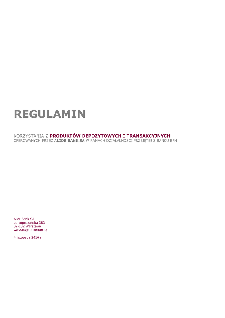 REGULAMIN KORZYSTANIA Z PRODUKTÓW DEPOZYTOWYCH I TRANSAKCYJNYCH OFEROWANYCH PRZEZ ALIOR BANK SA W RAMACH DZIAŁALNOŚCI PRZEJĘTEJ Z BANKU BPH Alior Bank SA ul. Łopuszańska 38D 02-232 Warszawa www.fuzja.aliorbank.pl 4 listopada 2016 r. Spis treści Regulamin rachunków oszczędnościowo–rozliczeniowych i rachunków oszczędnościowych dla Klientów Indywidualnych Alior Banku SA w ramach działalności przejętej z Banku BPH 3 Regulamin płatniczych kart debetowych Alior Banku SA dla Klientów Indywidualnych w ramach działalności przejętej z Banku BPH 10 Regulamin rozliczeń pieniężnych dla Klientów indywidualnych Alior Banku SA w ramach działalności przejętej z Banku BPH 19 Regulamin realizacji rozliczeń w formie „Polecenia Zapłaty” w Alior Banku SA w ramach działalności przejętej z Banku BPH 29 Regulamin Bankowości Elektronicznej w Alior Banku SA dla Klientów Indywidualnych w ramach działalności przejętej z Banku BPH 33 2 Regulamin rachunków oszczędnościowo–rozliczeniowych i rachunków oszczędnościowych dla Klientów Indywidualnych Alior Banku SA w ramach działalności przejętej z Banku BPH ROZDZIAŁ I – Postanowienia ogólne §1 Niniejszy Regulamin określa warunki na jakich Bank prowadzi Rachunki: 1) Rachunki oszczędnościowo–rozliczeniowe w walucie polskiej 2) Rachunki oszczędnościowe w złotych polskich 3) Rachunki oszczędnościowe w walutach wymienialnych z wkładem płatnym na każde żądanie dla osób fizycznych, o pełnej zdolności do czynności prawnych, dla osób małoletnich lub dla osób ubezwłasnowolnionych z zastrzeżeniem postanowień poniższych. §2 Użyte w Regulaminie określenia oznaczają: 1) Automatyczne Oszczędzanie / Autooszczędności – usługa polega na codziennym automatycznym lokowaniu środków pieniężnych z rachunku oszczędnościowo-rozliczeniowego Kapitalne konto w Kwocie autooszczędności na rachunek oszczędnościowy, ponad Próg autooszczędności na rachunku oszczędnościowo-rozliczeniowym, 2) Autoinwestycja – usługa polegająca na codziennym automatycznym lokowaniu środków pieniężnych z rachunku oszczędnościowo – rozliczeniowego Maksymalne konto w Kwocie autoinwestycji na rachunek lokaty, ponad Próg autoinwestycji na rachunku oszczędnościowo rozliczeniowym. Kolejnego dnia roboczego Kwota autoinwestycji jest zwracana na ten sam rachunek oszczędnościowo-rozliczeniowy, 3) Bank – Alior Bank Spółka Akcyjna, z siedzibą w Warszawie, ul. Łopuszańska 38D, kod poczt. 02-232 Warszawa, wpisaną do Rejestru Przedsiębiorców Krajowego Rejestru Sądowego prowadzonego przez Sąd Rejonowy dla m.st. Warszawy w Warszawie, XIII Wydział Gospodarczy pod numerem KRS: 0000305178, o numerze REGON: 141387142 i numerze NIP: 1070010731, podlegającą nadzorowi Komisji Nadzoru Finansowego w Warszawie, wykonującą działalność pod adresami Oddziałów i Placówek Partnerskich wskazanych na stronie internetowej Banku www.fuzja.aliorbank.pl, 4) Czytnik FV – urządzenie umożliwiające, przy pomocy Technologii FV rejestrację wzorca biometrycznego, służące do potwierdzania tożsamości Posiadacza; autoryzowania składanych przez Posiadacza dyspozycji dotyczących Rachunku, 5) Karta debetowa – karta dająca możliwość realizowania płatności do wysokości środków dostępnych na rachunku, 6) Karta Klienta – dane Klienta umożliwiające jego identyfikację w systemie bankowym, 7) Kraj – Rzeczpospolita Polska, 8) Kraj trzeci – państwo niebędące państwem członkowskim Unii Europejskiej, 9) Kwota autooszczędności – kwota lokowana na rachunku oszczędnościowym z rachunku Kapitalne konto w ramach usługi Automatycznego Oszczędzania, 10) Kwota autoinwestycji – kwota podlegająca automatycznemu inwestowaniu przez Bank z rachunku Maksymalne konto w ramach usługi Autoinwestycji, 11) Limit w saldzie debetowym – przyznawana na mocy umowy odrębnej od Umowy kwota, do wysokości której Posiadacz może składać dyspozycje obciążeniowe nie znajdujące pokrycia w dodatnim Saldzie rachunku, 12) Nierezydent – osoba fizyczna mająca miejsce zamieszkania za granicą posiadająca zdolność do zaciągania zobowiązań i nabywania praw we własnym imieniu, 13) Nierezydenci z krajów trzecich – osoby fizyczne, posiadające zdolność do zaciągania zobowiązań i nabywania praw we własnym imieniu, mające miejsce zamieszkania w krajach trzecich, 14) Oddział Banku – jednostka organizacyjna Banku, prowadząca działalność operacyjną, obsługująca działalność przejętą z Banku BPH, 15) Osoby zajmujące eksponowane stanowiska polityczne – rozumie się przez to osoby fizyczne: a. szefów państw, szefów rządów, ministrów, wiceministrów lub zastępców ministrów, członków parlamentu, sędziów sądów najwyższych, trybunałów konstytucyjnych oraz innych organów sądowych, których orzeczenia nie podlegają zaskarżeniu, z wyjątkiem trybów nadzwyczajnych, członków trybunałów obrachunkowych, członków zarządów banków centralnych, ambasadorów, chargés d’affairs oraz wyższych oficerów sił zbrojnych, członków organów zarządzających lub nadzorczych przedsiębiorstw państwowych – którzy sprawują lub sprawowali te funkcje publiczne w okresie roku od dnia zaprzestania spełniania przesłanek określonych w tych przepisach, b. małżonków osób, o których mowa w lit. a, lub osoby pozostające z nimi we wspólnym pożyciu, rodziców i dzieci osób, o których mowa w lit. a, małżonków tych rodziców i dzieci lub osoby pozostające z nimi we wspólnym pożyciu, które pozostają lub pozostawały z osobami, o których mowa w lit. a, w ścisłej współpracy zawodowej lub gospodarczej lub są współwłaścicielami podmiotów prawa, a także jedynymi uprawnionymi do majątku podmiotów prawa, jeżeli zostały one założone na rzecz tych osób – mające miejsce zamieszkania poza terytorium Rzeczypospolitej Polskiej, 16) Partner – przedsiębiorca 