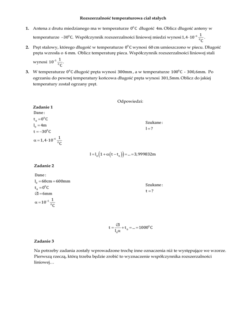 Rozszerzalność temperaturowa ciał stałych 1. Antena z drutu miedzianego ma w temperaturze 00 C długość 4m. Oblicz długość anteny w temperaturze −300 C. Współczynnik rozszerzalności liniowej miedzi wynosi 1,4 ⋅ 10−6 1 . C 0 2. Pręt stalowy, którego długość w temperaturze 00 C wynosi 60 cm umieszczono w piecu. Długość pręta wzrosła o 6 mm. Oblicz temperaturę pieca. Współczynnik rozszerzalności liniowej stali wynosi 10−5 1 . C 0 3. W temperaturze 00 C długość pręta wynosi 300mm , a w temperaturze 1000 C - 300,6mm. Po ogrzaniu do pewnej temperatury końcowa długość pręta wynosi 301,5mm. Oblicz do jakiej temperatury został ogrzany pręt. Odpowiedzi: Zadanie 1 Dane : t 0 = 00 C Szukane : l0 = 4m l=? t = −300 C α = 1,4 ⋅ 10−6 1 C 0 ( ) l = l0 1 + α ( t − t 0 ) = ... = 3,999832m Zadanie 2 Dane : l0 = 60cm = 600mm Szukane : t =? t 0 = 00 C ∆l = 6mm α = 10−5 1 C 0 t= ∆l + t = ... = 10000 C l0 α 0 Zadanie 3 Na potrzeby zadania zostały wprowadzone trochę inne oznaczenia niŜ te występujące we wzorze. Pierwszą rzeczą, którą trzeba będzie zrobić to wyznaczenie współczynnika rozszerzalności liniowej… Dane : t 1 = 00 C l1 = 300mm Szukane : t3 = ? t 2 = 100 C l2 = 300,6mm 0 l3 = 301,5mm α= l2 − l1 l1 ( t 2 − t 1 ) l3 − l1 = α ⋅ l 1 ⋅ ( t 3 − t 1 ) t3 = l3 − l1 α ⋅ l1 + t1 = l3 − l1 l 2 − l1 l1 ( t 2 − t 1 ) = ... = ⋅ l1 l3 − l1 l 2 − l1 t3 = (t 2 − t1 ) + t1 l3 − l1 l2 − l 1 (t 2 − t 1 ) + t 1 = ... = 2500 C