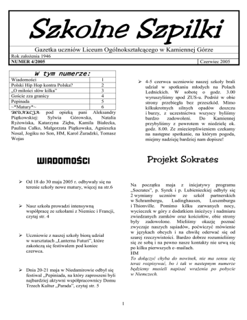 Szkolne Szpilki Gazetka uczniów Liceum Ogólnokształcącego w Kamiennej Górze Rok załoŜenia 1946 NUMER 4/2005 Czerwiec 2005 W tym numerze: Wiadomości 1 Polski Hip Hop kontra Polska? 2 „O miłości słów kilka” 3 Goście zza granicy 4 Pepinada 5 ~*Matury*~ 6 REDAKCJA: pod opieką pani Aleksandry Piątkowskiej: Sylwia Górowska, Natalia RyŜowiska, Katarzyna Zięba, Kamila Białecka, Paulina Całko, Małgorzata Piątkowska, Agnieszka Nosal, Jogiku no Son, HM, Karol śuradzki, Tomasz Wojas 4-5 czerwca uczniowie naszej szkoły brali udział w spotkaniu młodych na Polach Lednickich. W sobotę o godz. 3.00 wyruszyliśmy spod ZUS-u. PodróŜ w obie strony przebiegła bez przeszkód. Mimo kilkukrotnych silnych opadów deszczu i burzy, z uczestnictwa wszyscy byliśmy bardzo zadowoleni. Do Kamiennej przybyliśmy z powrotem w niedzielę ok. godz. 8.00. Ze zniecierpliwieniem czekamy na następne spotkanie, na którym pogoda, miejmy nadzieję bardziej nam dopisze! Projekt Sokrates WIADOMOŚCI Od 18 do 30 maja 2005 r. odbywały się na terenie szkoły nowe matury, więcej na str.6 Na początku maja z inicjatywy programu „Socrates”, p. Syrek i p. Lubienieckiej odbyły się 2 wymiany uczniów ze szkół partnerskich w Schrambergu, Ludinghausen, Luxemburgu i Thionville. Pomimo kilku zarwanych nocy, wycieczek w góry z dodatkiem śnieŜycy i nadmiaru zwiedzanych zamków oraz kościołów, obie strony były zadowolone. Mieliśmy okazję poznać zwyczaje naszych sąsiadów, poćwiczyć mówienie w językach obcych i na chwilę oderwać się od szarej rzeczywistości. Bardzo dobrze rozumieliśmy się ze sobą i na pewno nasze kontakty nie urwą się po kilku pierwszych e–mailach. HM To dołączyć chyba do nowinek, nie ma sensu się teraz rozpisywać, bo i tak w nastepnym numerze będziemy musieli napisać wraŜenia po pobycie w Niemczech. Nasz szkoła prowadzi intensywną współpracę ze szkołami z Niemiec i Francji, czytaj str. 4 Uczniowie z naszej szkoły biorą udział w warsztatach „Lanterna Futuri”, które zakończą się festiwalem pod koniec czerwca. Dnia 20-21 maja w Niedamirowie odbył się festiwal „Pepiniada, na który zaproszeni byli najbardziej aktywni współpracownicy Domu Trzech Kultur „Parada”, czytaj str. 5 1 Polski Hip Hop Kontra Polska? Musisz dobrze się przyglądać (…) W całej Polsce mnóstwo obojętnych osób, jeszcze więcej idiotów, których dopuszczą do głosu. Kraina smutnych ballad, beznadziei i krętactwa, bawiąca do łez dramaturgia prostactwa. Kryzys ponad wszystko, krwawe prawo bez honoru, które zatrzymuje wiarę, tworząc siec róŜnych zatorów (…) Brak zajęcia, frustracja, lustracja, defraudacja, kumoterstwo, nominacja, schorowana biurokracja. Po której stronie racja? Ile tych trafionych planów? Ile nieudanych prób? Robią z NAS ludzi baranów! Fikcja, a gdzie fakty? Wasze polityczne chęci? Wszystko martwe, jak dawno martwi prezydenci (…) Znowu ściemniony bilans, który ma zataić wszystko. Te wszystkie procedery, które są bliŜej niŜ blisko. Zaostrzenie fikcji przeciw korupcji reklamy – mówią i obiecują, a to slogany. Atmosfera skandalu (…) Polski bazar z dyplomami (…) Polski eksport optymizmu, zuboŜała strefa cienia. Obietnica „Będzie lepiej” nie jest w stanie pozmieniać! Napychając swe kieszenie myślą „mamy jeszcze czas”. Witam w ukochanym kraju - Rzeczpospolitej lewych kas”. I znowu to samo! Jacy to Polacy i polska rzeczywistość jest zła i niedobra! A co z ludźmi pracującymi? O tym rapują Liber i Doniu w swoich „skarbach”. „Tak to się kręci”: pobudka, marsz do robót, akordy, nadgodziny, bez ZUS –u, bez wolnych sobót (…) nie widać drogi do profilu bez sprytu, nie widać rent, nie widać emerytur. Na tym rysunku zero szacunku, zero ubezpieczeń, wypłaty cięte jak skrecze (…) anorektyczna kieszeń, stos wyrzeczeń, bez urlopów i wycieczek”. Sprawdźmy jeszcze co do powiedzenia w tej sprawie ma Trzeci Wymiar w „Pogodzie dla bogaczy”: (…) Te realia to malaria, ten kraj ma szansę, Ŝeby niedługo była tutaj druga Somalia (…) Kodeks karny posiada własne prawa. Rynek czarny to nadzwyczajny układ tajny (…) Problem tkwi w czynach władzy. To pajęczyna – powiązani nią Polacy (…) Moralny upadek, spekulacje, ich skutki, pozawyŜajmy ich ceny w Euro, sztucznie osłabiajmy złotówki. W parlamencie zgnilizna, na ulicach bunt (…)Frajerom wciąŜ mało! Kilu z nich się zabrało, nic to nie dało, jak obrady na szczycie…” MoŜna by tak cytować jeszcze długo, bo trochę się naprodukowało… Podsumować by to moŜna słowami Va z „Gdybyś tylko mógł”: „(…) Nie mają pracy młodzi ludzie po studiach, telewizja kłamie, próbuje z Ciebie zrobić durnia. Następne wybory. Do zobaczeniach przy urnach! Nie ma zmowy milczenia! Polski RAP wyszedł z podziemia!” lub Nr Raz „Polsko”: „Miejce: Polska, system – samowolka, cel to forsa, w tym tkwi sekret. Biorę co los da, Ŝycie Made In Polska”, ale wartałoby zadać kilka pytań myślę, prostych pytań. Czy ci wszyscy Rap-erzy mieli złe dzieciństwo, Ŝe ciągle narzekają i wszystko krytykują, czy moŜe HH to po prostu taki krytykancki styl? Skoro tak bardzo w Polsce im źle, to moŜe niech emigrują za granicę? Ale czy tam jest lepiej? Mówi się „Obce chwalicie, swego nie znacie” i chyba w tym tkwi problem! Raperzy krytykują polityków, a sami robią identycznie, jak oni duŜo mówią, mało działają, aby zmienić to wszystko, co im się tak bardzo nie podoba! Zapamiętajmy jednak, Ŝe Polska to: „Państwo policyjne, państwo wyznaniowe. Masz tu wolność słowa, więc uwaŜaj na swą mowę!”, dlatego lepiej będzie dla mnie jeśli juŜ skończę☺! Sylwia Górowska Natalia RyŜowiska Kl. I a LO Nowością nie jest to, Ŝe polski RAP wyszedł z podziemia, Ŝeby przeciwstawić się cięŜkiej i szarej polskiej rzeczywistości, Ŝeby pokazać, co jest w Polsce „be”, a c