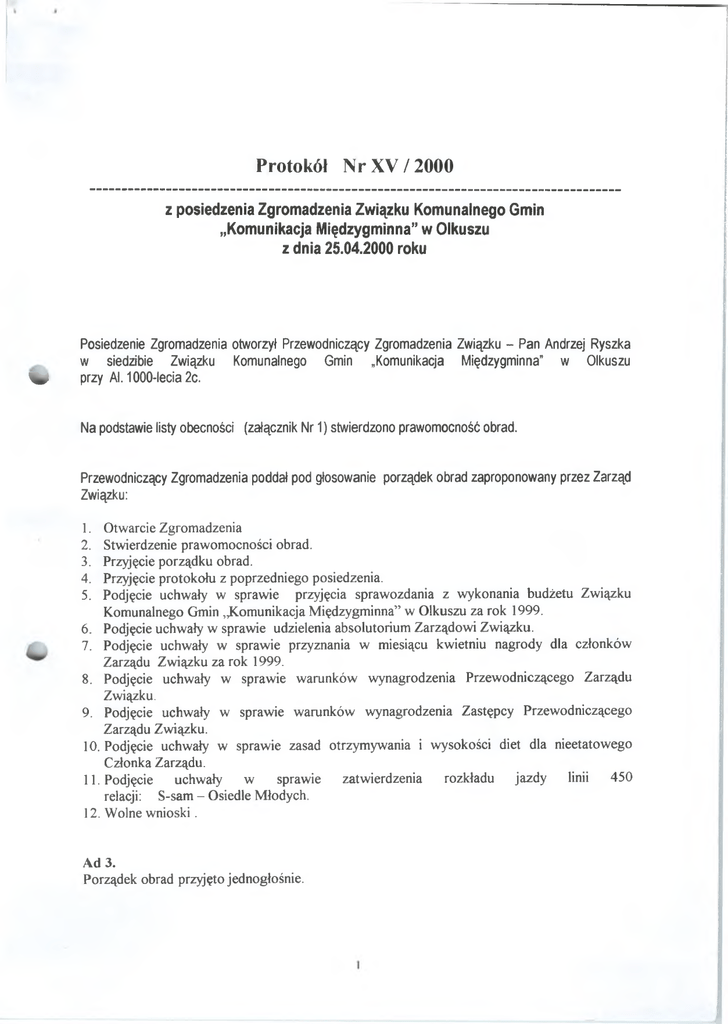 Protokół Nr X V / 2000 z posiedzenia Zgromadzenia Związku Komunalnego Gmin „Komunikacja Międzygminna” w Olkuszu z dnia 25.04.2000 roku W Posiedzenie Zgromadzenia otworzył Przewodniczący Zgromadzenia Związku - Pan Andrzej Ryszka w siedzibie Związku Komunalnego Gmin „Komunikacja Międzygminna” w Olkuszu przy Al. 1000‘lecia 2c. Na podstawie listy obecności (załącznik Nr 1) stwierdzono prawomocność obrad. Przewodniczący Zgromadzenia poddał pod głosowanie porządek obrad zaproponowany przez Zarząd Związku: 1. 2. 3. 4. 5. Otwarcie Zgromadzenia Stwierdzenie prawomocności obrad. Przyjęcie porządku obrad. Przyjęcie protokołu z poprzedniego posiedzenia. Podjęcie ucliwały w sprawie przyjęcia sprawozdania z wykonania budżetu Związku Komunalnego Gmin ,^omunikacja Międzygminna” w Olkuszu za rok 1999. 6. Podjęcie ucliwały w sprawie udzielenia absolutorium Zarządowi Związku. 7. Podjęcie uchwały w sprawie przyznania w miesiącu kwietniu nagrody dla członków Zarządu Związku za rok 1999. 8. Podjęcie uchwały w sprawie warunków wynagrodzenia Przewodniczącego Zarządu Związku. 9. Podjęcie uchwały w sprawie warunków wynagrodzenia Zastępcy Przewodniczącego Zarządu Związku. 10. Podjęcie uchwały w sprawie zasad otrzymywania i wysokości diet dla nieetatowego Członka Zarządu. 11. Podjęcie uchwały w sprawie zatwierdzenia rozkładu jazdy linii 450 relacji; S-sam - Osiedle Młodych. 12. Wolne wnioski. Ad 3. Porządek obrad przyjęto jednogłośnie. Ad 4. Protokół z poprzedniego Zgromadzenia został przyjęty jednogłośnie. Ad 5 Sprawozdanie z wykonania budżetu Związku przedstawił Przewodniczący Zarządu Pan Jacek Sierka. Odczytał również uchwałę Regionalnej Izby Obracłiunkowej w Krakowie z dnia 10.04.2000r. w sprawie zaopiniowania sprawozdania z wykonania budżetu Związku Komunalnego Gmin ,^omunikacja Międzygminna” w Olkuszu za rok 1999r. w którym Kolegium R.I.O. w Krakowie postanowiło pozytywnie zaopiniować przedłożone przez Zarząd Związku sprawozdanie z wykonania budżetu Związku za rok 1999r. Ponieważ członkowie Zgromadzenia nie wnieśli żadnych uwag w powyższej sprawie w głosowaniu jawnym Zgromadzenie jednomyślnie uchwaliło Uchwałę Nr XV/58/2000 Zgromadzenia Związku Komunalnego Gmin „Komunikacja Międzygminna” w Olkuszu w sprawie: przyjęcia sprawozdania z wykonania budżetu Związku Komunalnego Gmin ,JComunikacja Międzygminna” w Olkuszu za 1999 rok. /Uchwała stanowi załącznik nr 2 do protokołu/ Ad 6. Przewodniczący Zarządu przedstawił uchwałę R.I.O. w Krakowie z dnia 10.04.2000r. w sprawie zaopiniowania wniosku Komisji Rewizyjnej Zgromadzenia Związku Komunalnego Gmin ,JCM” w Olkuszu odnośnie absolutorium dla Zarządu Związku za rok 1999. Kolegium R.I.O. w Krakowie przedłożony wniosek zaopiniował pozytywnie. W dalszej części zostało przedstawione uzasadnienie w/w uchwały. W głosowaniu jawnym Zgromadzenie ZKG”KM” podjęło jednomyślnie Uchwałę Nr XV/59/2000 Zgromadzenia Związku Komunalnego Gmin „Komunikacja Międzygminna” w Olkuszu w sprawie: udzielenia absolutorium Zarządowi Związku, /uchwała stanowi załącznik nr 3 do protokohi/ Ad 7. Zgromadzenie postanowiło przyznać dla członków Zarządu Związku jednorazową nagrodę w miesiącu kwietniu 2000r. w następujących wysokościach: -Przewodniczącemu Zarządu Panu Jackowi Sierka w wysokości jednomiesięcznego wynagrodzenia -Zastępcy Przewodniczącego Zarządu Panu Włodzimierzowi Baldy w wysokości jednomiesięcznego wynagrodzenia przyjmując za podstawę odpowiednio należne miesięczne wynagrodzenie za miesiąc marzec 2000r. -Dla nieetatowego członka Zarządu Pana Jerzego Preiss w wysokości jednomiesięcznej diety przyjmując za podstawę dietę należną za miesiąc marzec 2000r. Zgromadzenie w głosowaniu jawnym przyjęło: Uchwałę Nr XV/60/2000 Zgromadzenia Związku Komunalnego Gmin „Komunikacja Międzygminna’’ w Olkuszu w sprawie: przyznania w miesiącu kwietniu nagrody dla członków Zarządu Związku za rok 1999. /ucłiwała stanowi załącznik nr 4 do protokołu/ Ad 8. Podczas dyskusji w sprawie warunków wynagrodzenia dla Przewodniczącego Zarządu Członkowie Zgromadzenia ustalili podwyżkę wynagrodzenia miesięcznego o kwotę 520,59 zł (brutto). W głosowaniu jawnym Zgromadzenie podjęło (7 głosów za , 1 wstrzymujący ) Uchwałę Nr XV/61/2000 Zgromadzenia Związku Komunalnego Gmin „Komunikacja Międzygminna” w Olkuszu w sprawie: warunków wynagrodzenia Przewodniczącego Zarządu Związku, /uchwała stanowi załącznik nr 5 do protokołu/. Ad. 9. W sprawie warunków wynagrodzenia Zastępcy Przewodniczącego Zarządu Związku zaproponowano zwiększenie wynagrodzenia o kwotę 441,52 zł (brutto). W głosowaniu jawnym Zgromadzenie podjęło ( 7 głosów za, 1 wstrzymujący) Uchwałę Nr XV/62/2000 Zgromadzenia Związku Komunalnego Gmin „Komunikacja Międzygminna” w Olkuszu w sprawie: warunków wynagrodzenia Zastępcy Przewodniczącego Zarządu Związku, /uchwała stanowi załącznik nr 6 do protokołu/. Ad. 10. W sprawie wysokości diet dla nieetatowego Członka Zarządu zaproponowano zwiększenie kwoty miesięcznej zryczałtowanej diety z dotychczasowej 700 zł na kwotę 800zł. Zgromadzenie w głosowaniu jawnym przyjęło ( 6 głosów za, 2 wstrzymujące) Uchwałę Nr XV/63/2000 Zgromadzenia Związku Komunalnego Gmin „Komunikacja Międzygminna” w Olkuszu w sprawie: zasad otrzymywania i wysokości diet dla nieetatowego Członka Zarządu, /uchwała stanowi załącznik nr 7 do protokołu/. Ad. 11. Pan Jacek Sierka wyjaśnił, iż Zarząd Związku otrzymał pismo z PKM Sp. zo.o z propozycją przejęcia kursów liniiprzez Związek i wzrost pracy przewozowej na linii 450 do wielkości ok. 27 000 km. Ponieważ zwiększenie pracy przewozowej realizowanej przez Związek wiąże się ze zmianą planu finansowego, a wzrost wydatków z tego tytułu musi znaleźć pokrycie w przychodach 