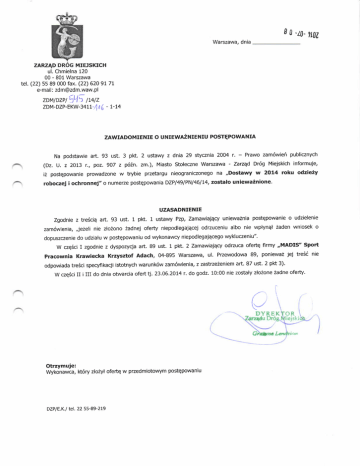 I 0 -u_ tnt, Warszawa, dnia ZARZAD MIEJSKICH ul,Chmie!na 120 00-801 Warszawa tel.(22)55 89 000 faX.(22)6209171 e‐ mall:zdm@zdm,Waw.pl ZDM/DZP/ら Llb /14/Z ZDM― DZP― E則 -341lJ′ 6-1-14 ZAWIADOMTENTE O UNTEWAZNTENTU POSTEPOWANTA Na podstawie art. 93 ust. (Dz. U. z 2013 t., poz. 907 z 3 pK. 2 ustawy z pofun. dnia 29 stycznia 2004 zm.), Miasto Stoleczne Warszawa ' r. - Prawo zam6wieri publicznych Zanqd Dr6g Miejskich informuje, i2 postgpowanie prowadzone w trybie przetargu nieograniczonego na ,,Dostawy w 2014 roku odzieiy roboczej i ochronnej" o numerze postgpowania DZPl49lPNl46l14, zoshlo uniewainione' UZASADNIENIE Zgodnie z tre6ciq art. 93 ust. 1 pK. 1 ustawy Pzp, Tamawiajqcy uniewa2nia postqpowanie o udzielenie o zam6wienia, ,je2eli nie zlo2ono 2adnej oferty niepodlegajEcej odrzuceniu albo nie wplynql 2aden wniosek doouszczenie do udzialu w postqpowaniu od wykonawcy niepodlegajqcego wykluczeniu"' W czqSci I zgodnie z dyspozycja art. 89 ust. 1 pK. 2 Zamawiajqcy odrzuca ofertg firmy ,,MADIS" Sport pracownia Krawiecka Krzysztof Adach, 04-895 Warszawa, ul. Paewodowa 89, poniewa2 jej tre56 2 pkt 3). odpowiada treSci specyfikacji istotnych warunk6w zam6wienia, z zastae2eniem art' 87 ust. W czeSci II i III do dnia otwarcia ofert $. 23.06.20t4 r. do godz. 10:00 nie zostaly zlo2one 2adne oferty. 0 Otrzymuje: Wykonawca, K6ry zlo2yl ofertg w przedmiotowym postgpowaniu DZP/E.K./tel.2255‐ 89-219 nie