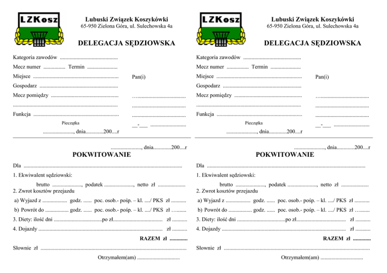 Lubuski Związek Koszykówki Lubuski Związek Koszykówki 65-950 Zielona Góra, ul. Sulechowska 4a 65-950 Zielona Góra, ul. Sulechowska 4a DELEGACJA SĘDZIOWSKA DELEGACJA SĘDZIOWSKA Kategoria zawodów .......................................... Kategoria zawodów .......................................... Mecz numer ................ Termin ...................... Mecz numer ................ Termin ...................... Miejsce .............................................................. Pan(i) Gospodarz ......................................................... Miejsce .............................................................. Pan(i) Gospodarz ......................................................... Mecz pomiędzy ................................................. …................................... Mecz pomiędzy ................................................. …................................... ............................................................................ ....................................... ............................................................................ ....................................... Funkcja .............................................................. ....................................... Funkcja .............................................................. ....................................... Pieczątka __-___ .......................... ......................, dnia.............200....r Pieczątka __-___ .......................... ......................, dnia.............200....r ......................, dnia.............200....r ......................, dnia.............200....r POKWITOWANIE POKWITOWANIE Dla ................................................................................................................... Dla ................................................................................................................... 1. Ekwiwalent sędziowski: 1. Ekwiwalent sędziowski: brutto ....................., podatek ....................., netto zł .................... 2. Zwrot kosztów przejazdu brutto ....................., podatek ....................., netto zł .................... 2. Zwrot kosztów przejazdu a) Wyjazd z .................. godz. ...... poc. osob.- pośp. – kl. ..../ PKS zł ........... a) Wyjazd z .................. godz. ...... poc. osob.- pośp. – kl. ..../ PKS zł ........... b) Powrót do ................. godz. ...... poc. osob.- pośp. – kl. ..../ PKS zł …....... b) Powrót do ................. godz. ...... poc. osob.- pośp. – kl. ..../ PKS zł …....... 3. Diety: ilość dni ...................................po zł.................................... zł ........... 3. Diety: ilość dni ...................................po zł.................................... zł ........... 4. Dojazdy .......................................................................................... zł ........... 4. Dojazdy .......................................................................................... zł ........... RAZEM zł ............. RAZEM zł ............. Słownie zł .......................................................................................................... Słownie zł .......................................................................................................... Otrzymałem(am) ............................... Otrzymałem(am) ............................... EKWIWALENT SĘDZIOWSKI EKWIWALENT SĘDZIOWSKI Dla .................................................................................................................. Dla .................................................................................................................. Zgodnie z delegacją sędziowską z dnia .......................................................... Zgodnie z delegacją sędziowską z dnia .......................................................... - kwota brutto .................................. - kwota brutto .................................. - koszty uzyskania przychodu .................................. - koszty uzyskania przychodu .................................. - kwota do opodatkowania .................................. - kwota do opodatkowania .................................. - podatek .................................. - podatek .................................. - kwota netto .................................. - kwota netto .................................. Słownie ........................................................................................................... Słownie ........................................................................................................... .................................. podpis sędziego OŚWIADCZENIE DLA CELÓW PODATKOWYCH PESEL NIP .................................. podpis sędziego OŚWIADCZENIE DLA CELÓW PODATKOWYCH PESEL NIP Nazwisko: .............................................................................................. Nazwisko: .............................................................................................. Imiona: 1) ........................................... 2) ........................................... Imiona: 1) ........................................... 2) ........................................... Imię ojca: ..................................... Imię matki ..................................... Imię ojca: ..................................... Imię matki ..................................... Miejsce urodzenia: .......................... Data urodzenia: ......................... Miejsce urodzenia: .......................... Data urodzenia: ......................... Miejsce zamieszkania: Gmina/Dzielnica ............................................... Miejsce zamieszkania: Gmina/Dzielnica ............................................... Ulica: .......................................... Nr domu: ...... Nr mieszkania: ...... Ulica: .....................